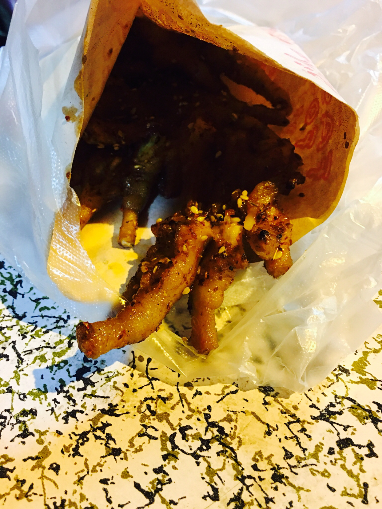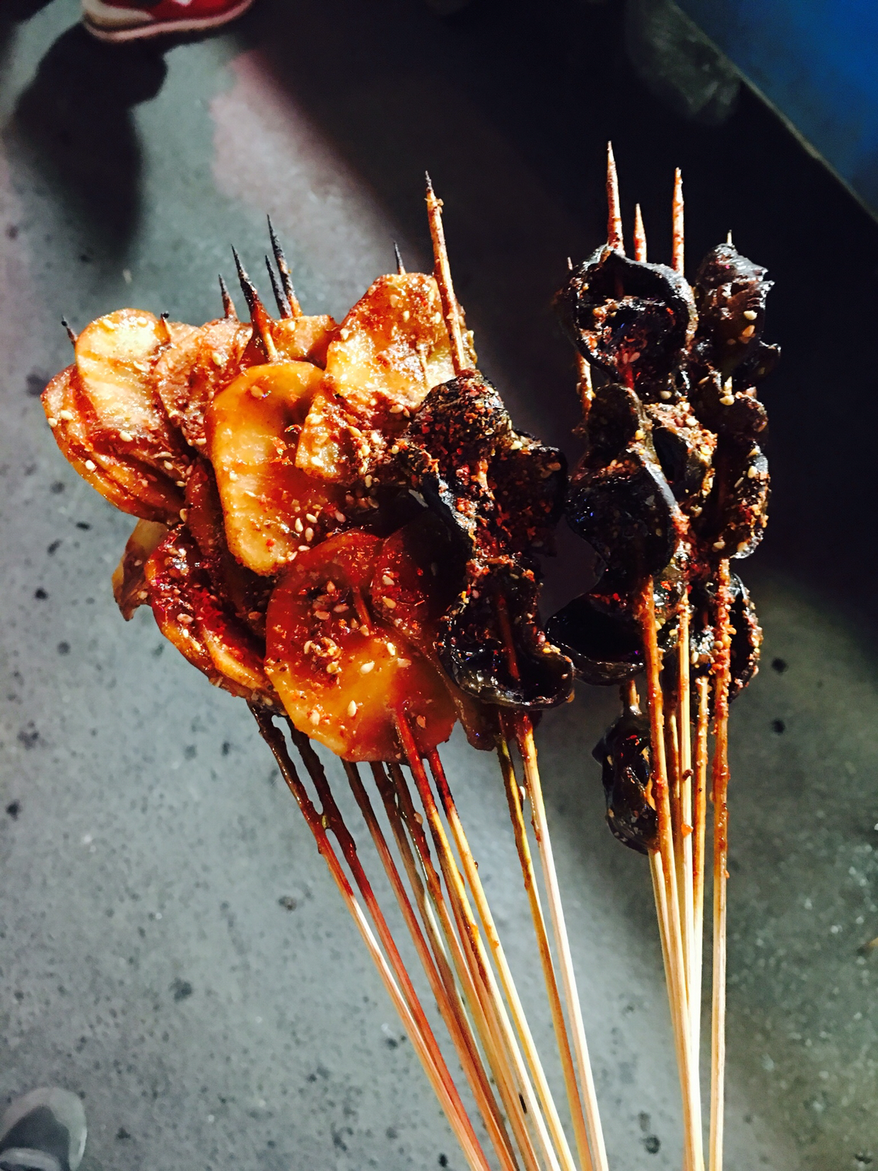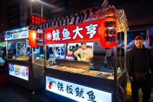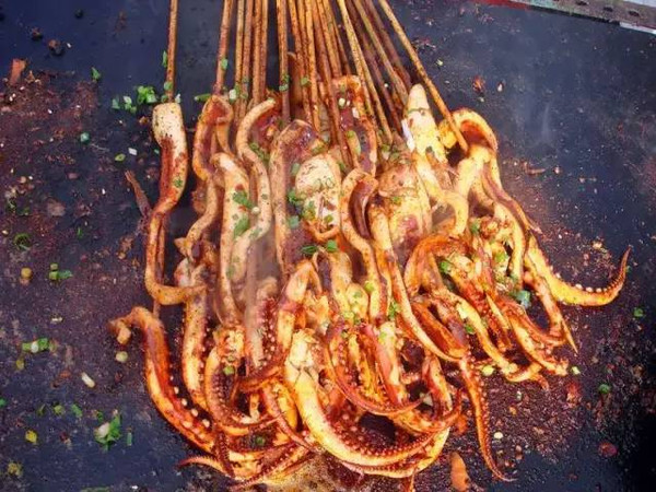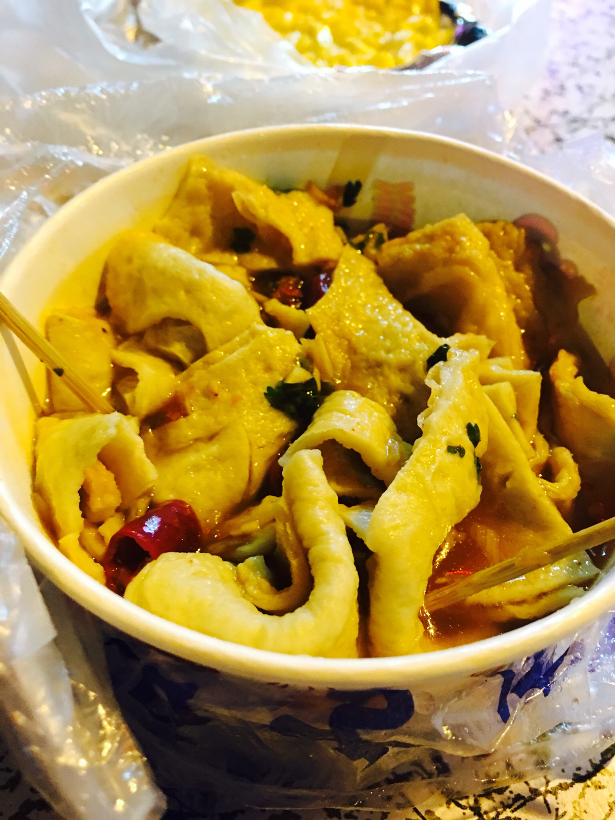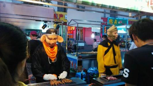 从北门开始,门口的豆腐皮是必须要推荐的,街中间有一家咖喱鸡排金黄酥脆外焦里嫩,向南还有大军铁板鱿鱼,那可是全吉祥夜市最火的铁板鱿鱼了,靠近南门的胡同里还有伊拉克烤大串也是必须吃的。