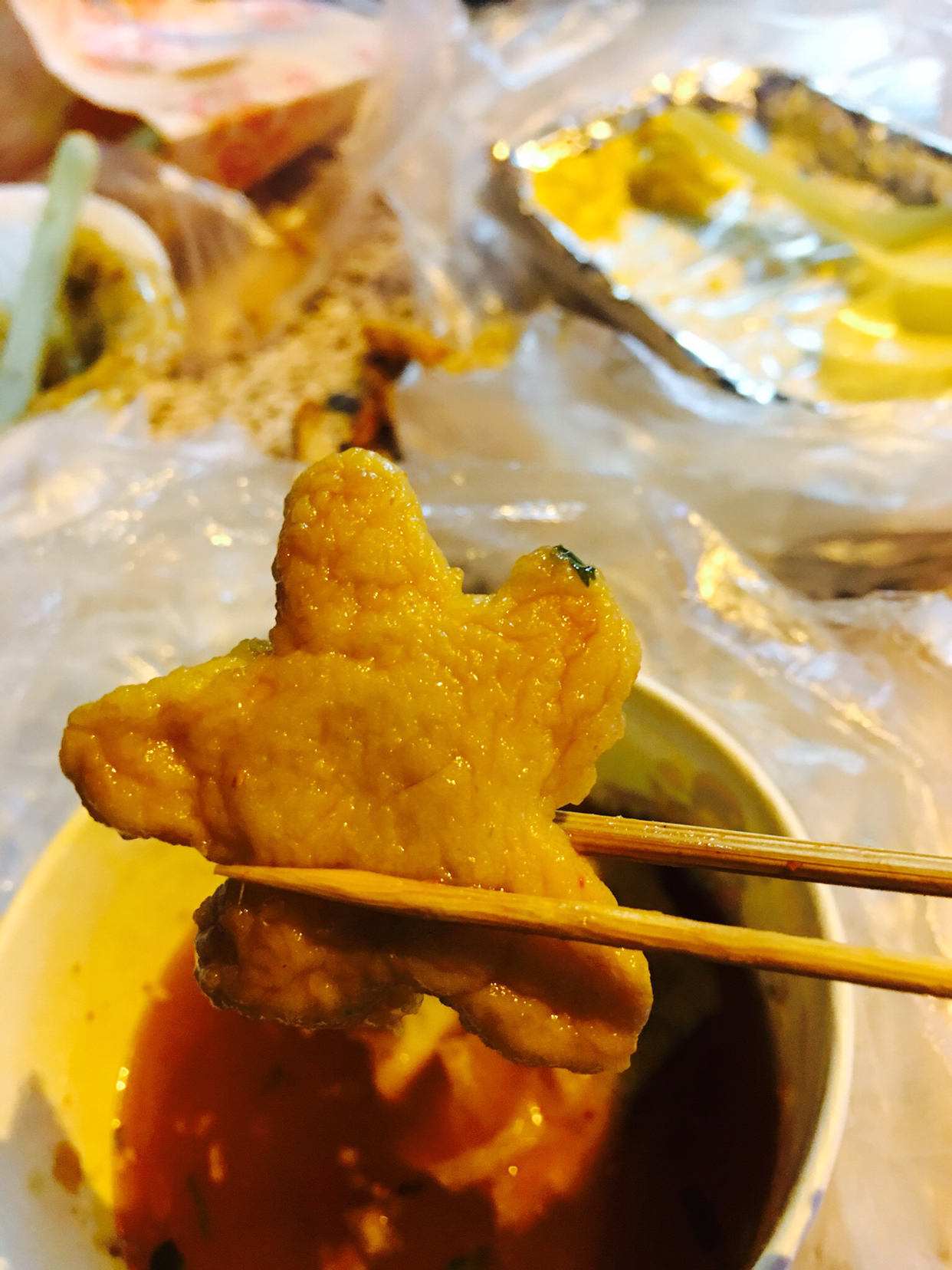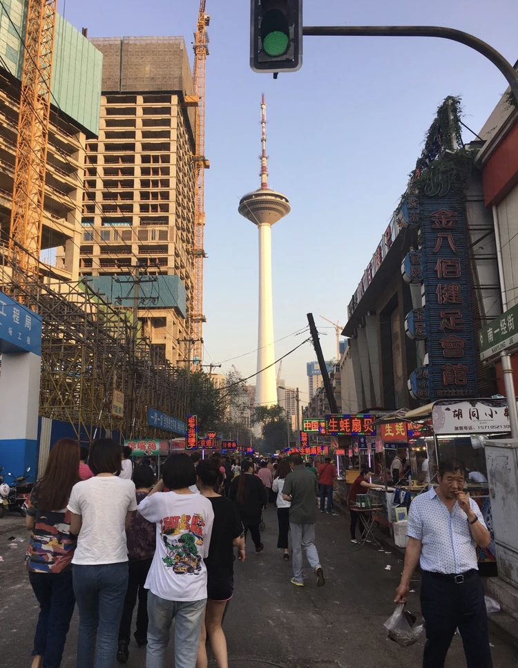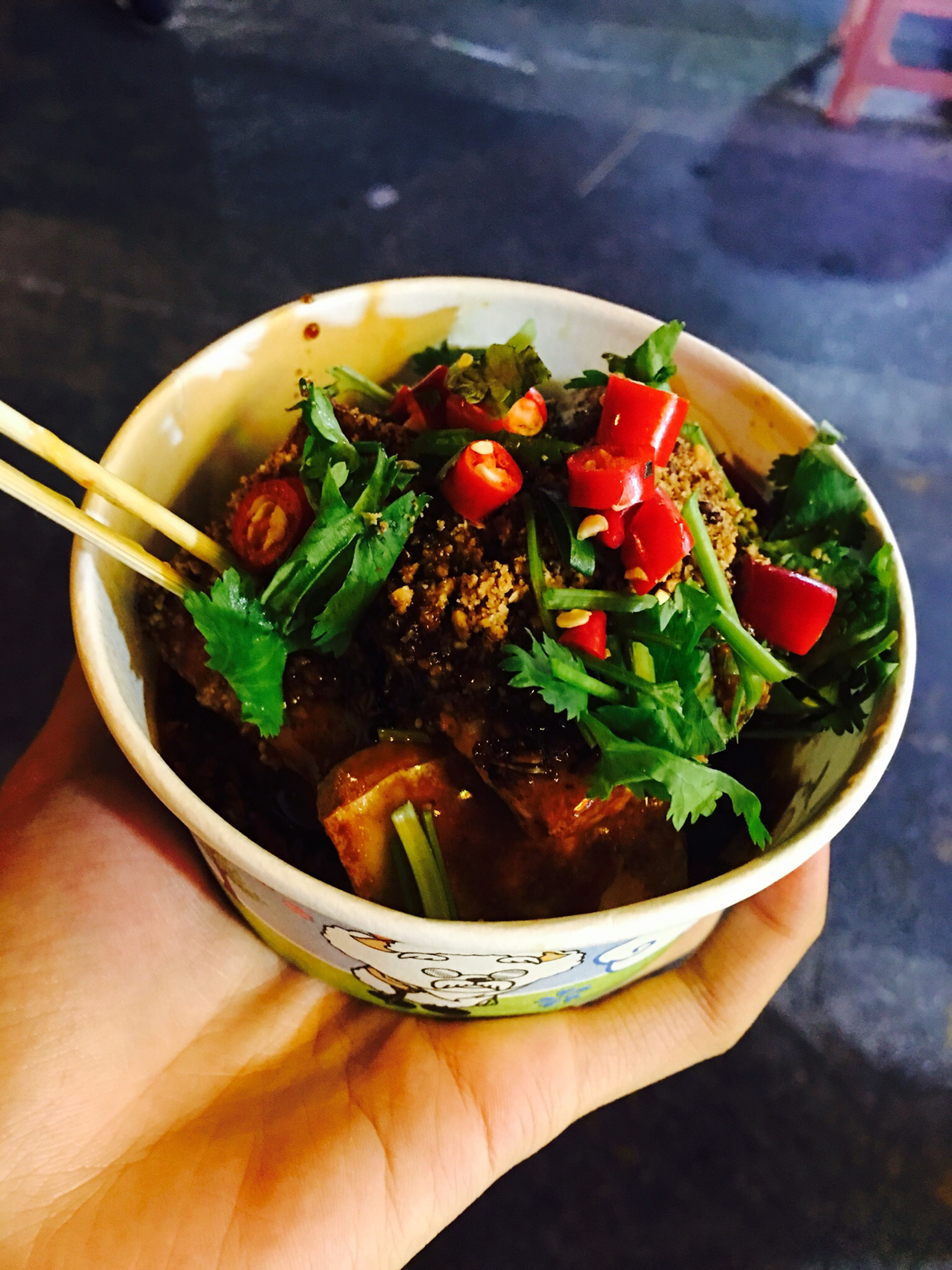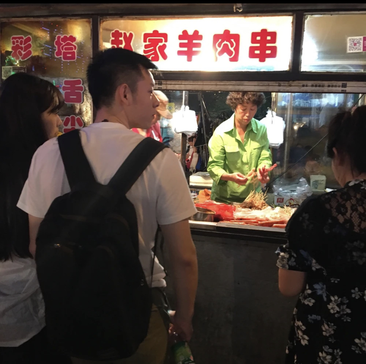从北门开始,门口的豆腐皮是必须要推荐的,街中间有一家咖喱鸡排金黄酥脆外焦里嫩,向南还有大军铁板鱿鱼,那可是全吉祥夜市最火的铁板鱿鱼了,靠近南门的胡同里还有伊拉克烤大串也是必须吃的。