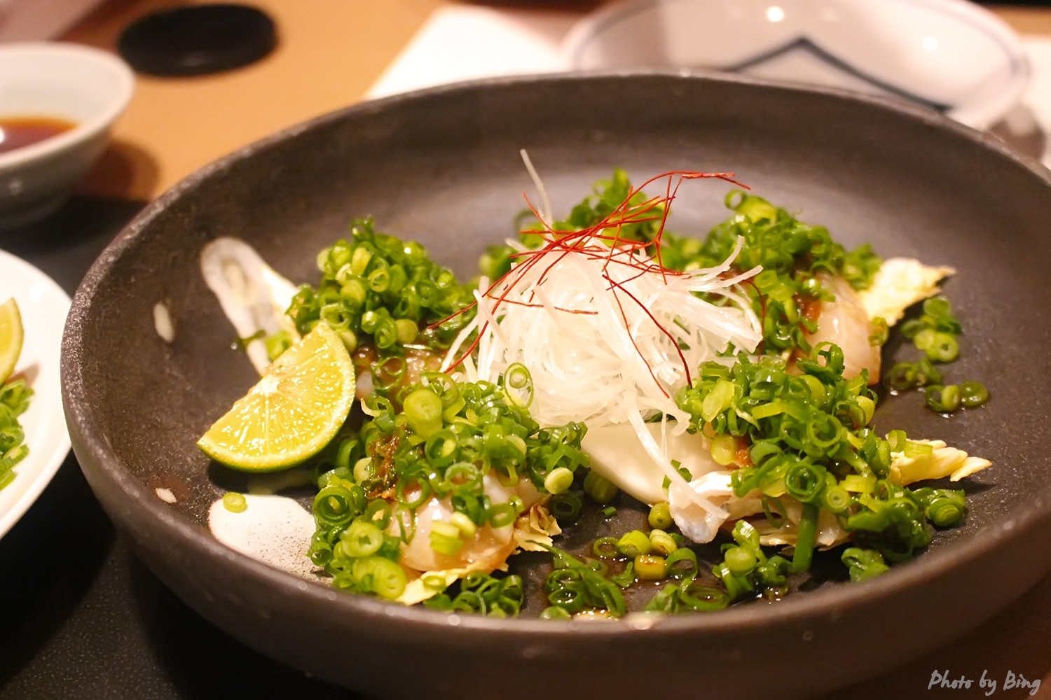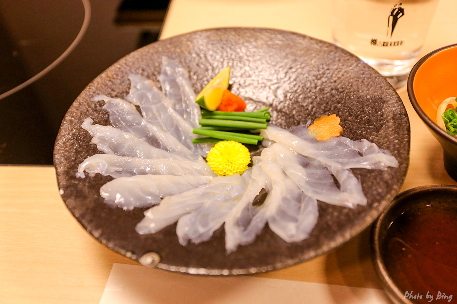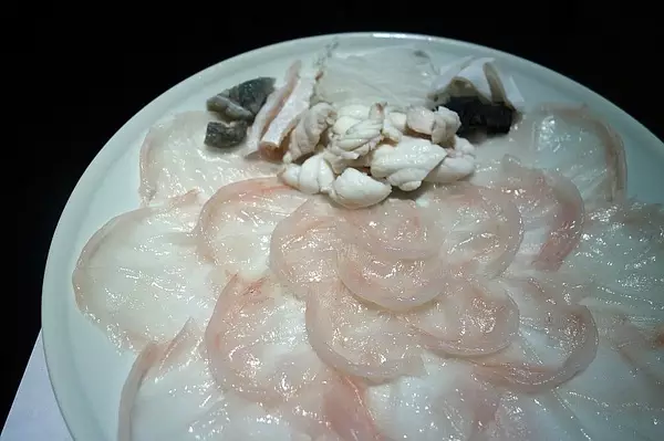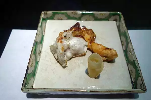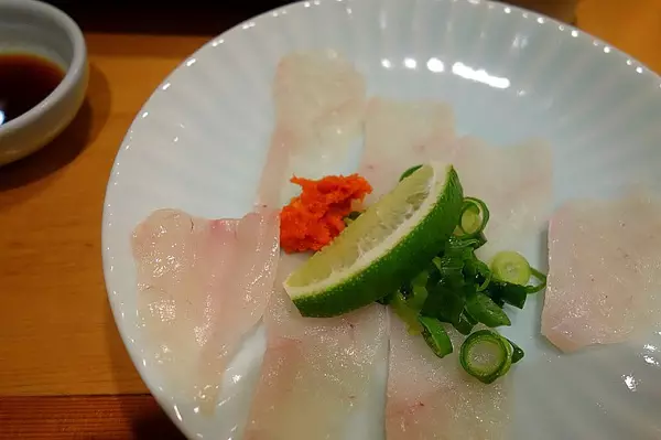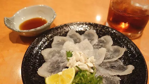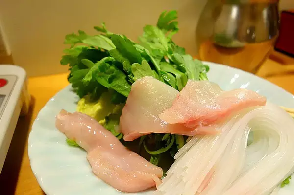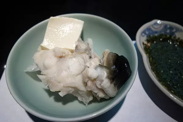 河豚火锅。图中的河豚是在锅中煮过捞出来的,配着酸橘醋吃。这家的套餐份量还蛮大的,吃到这会儿已经有些饱了。毕竟刚刚都吃完了一大盘避孕套呢。