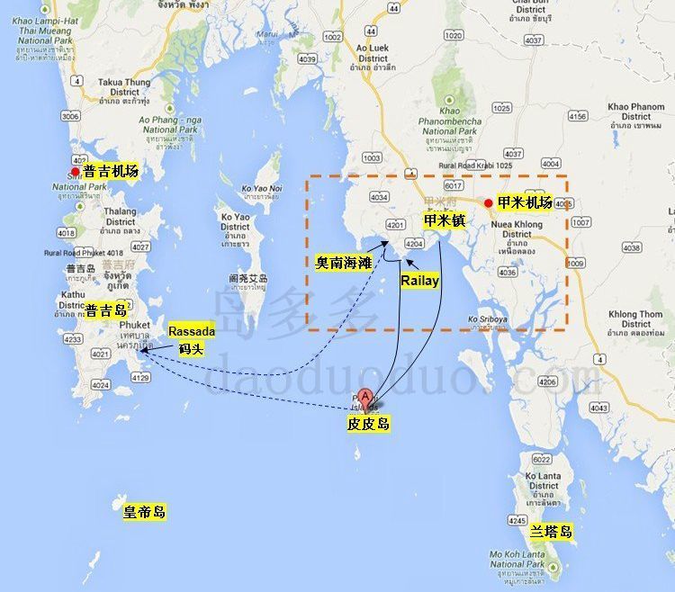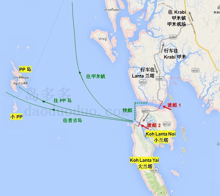 兰塔位于 普吉岛 的东南方向,旺季为11月下旬--4月下旬,有渡船可以上岛;淡季没有渡船可以先飞到甲米 ,乘车到码头,经过2次载车渡船的方式上岛。