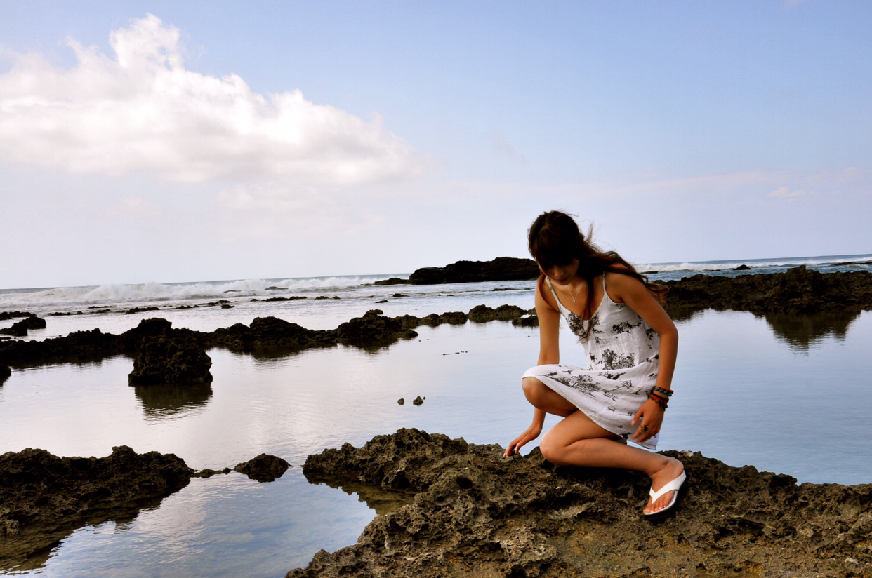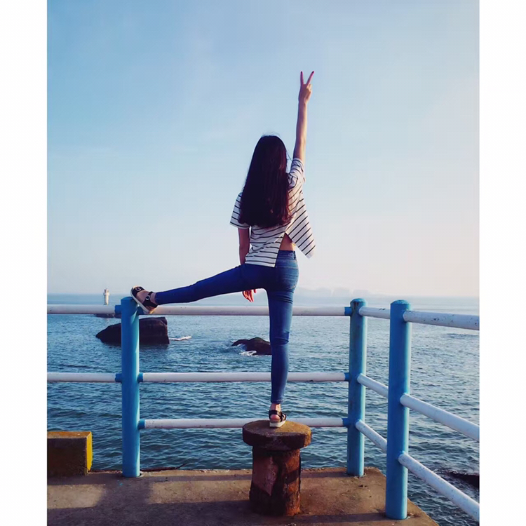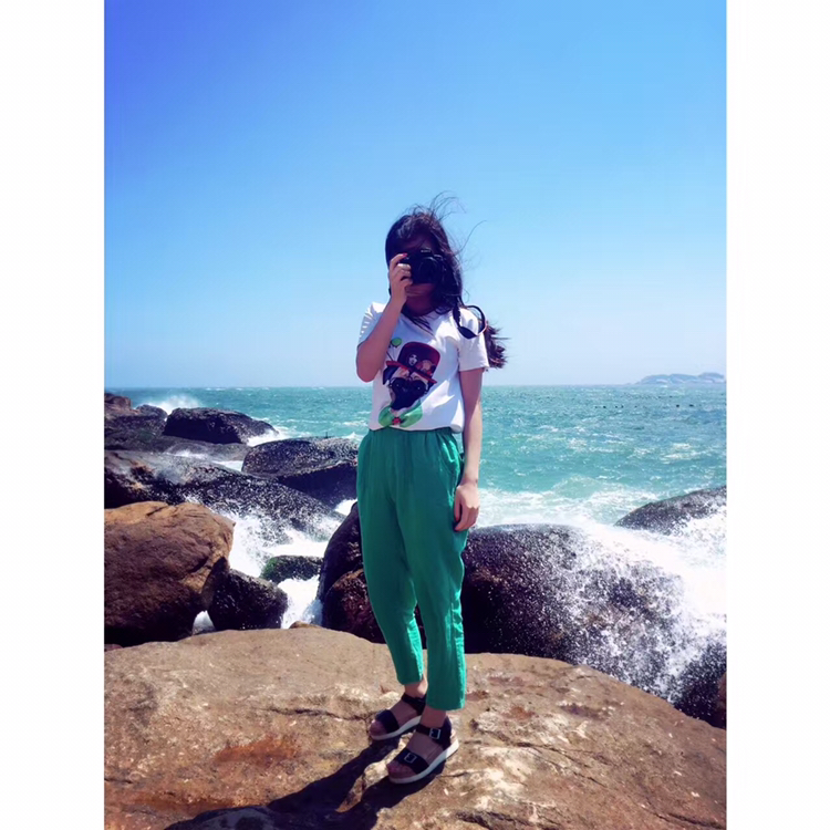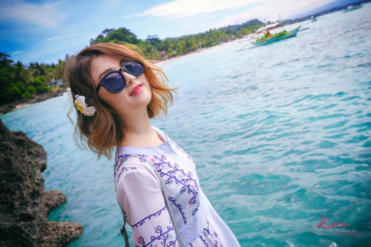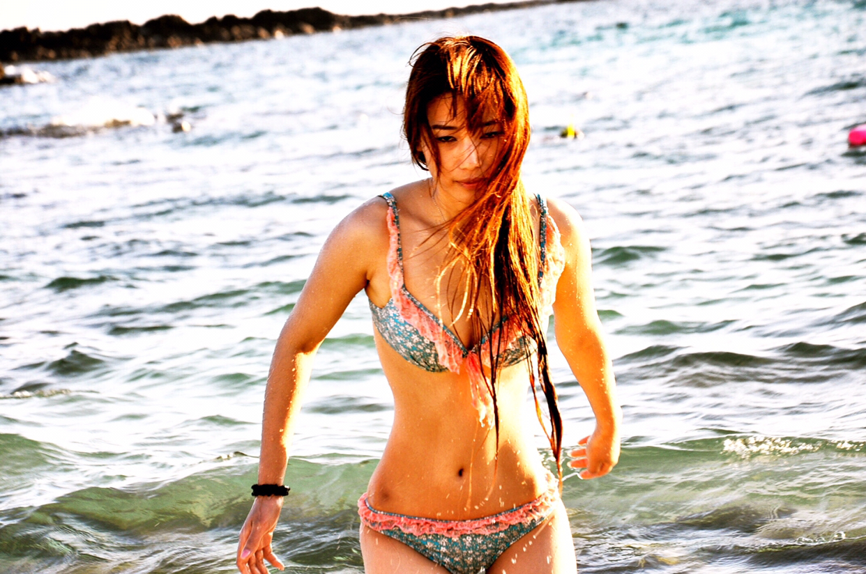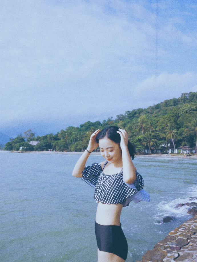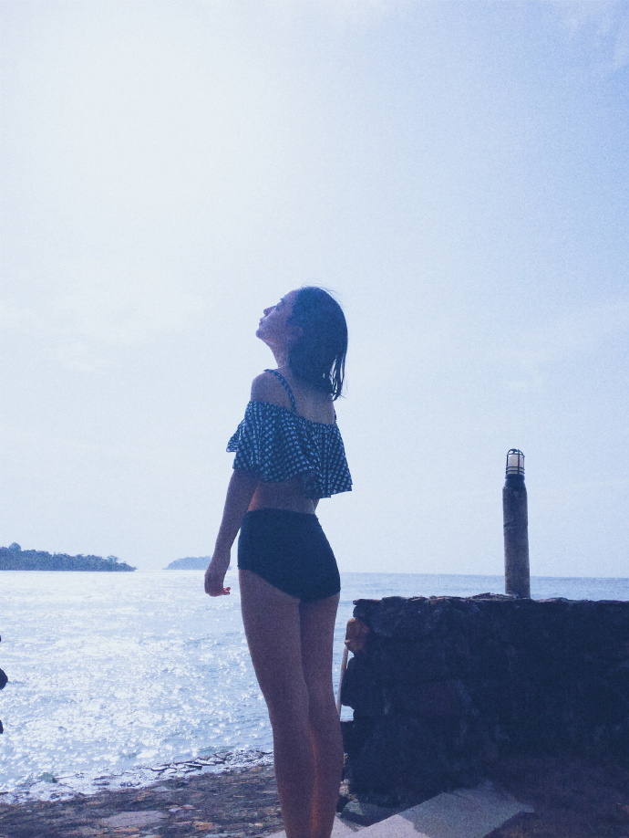 f、海边如果有礁石就最好不过了,让麻豆站在或坐着或躺在礁石上,摄影师抬高机位俯拍。
