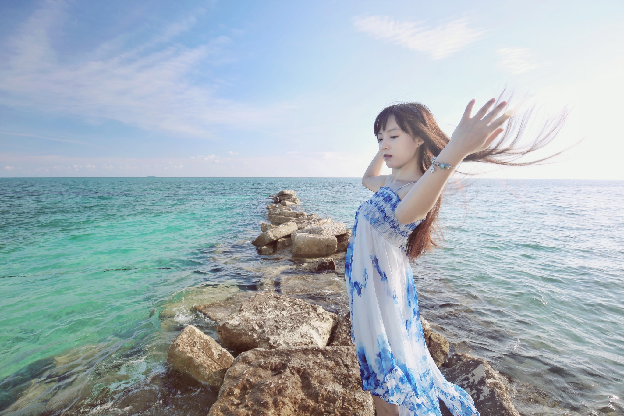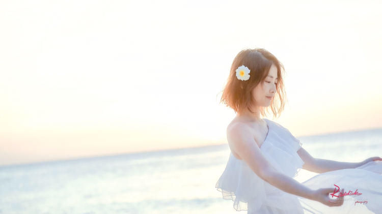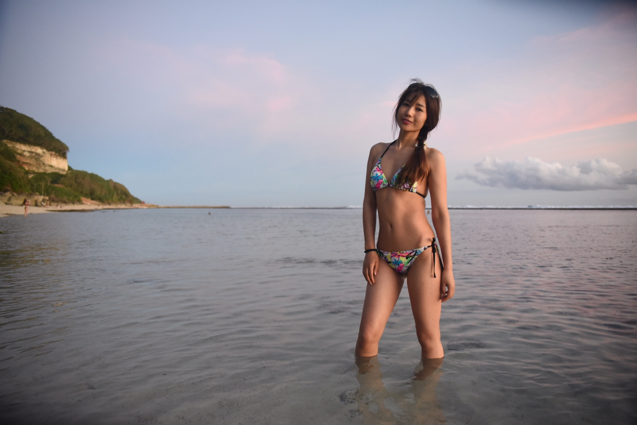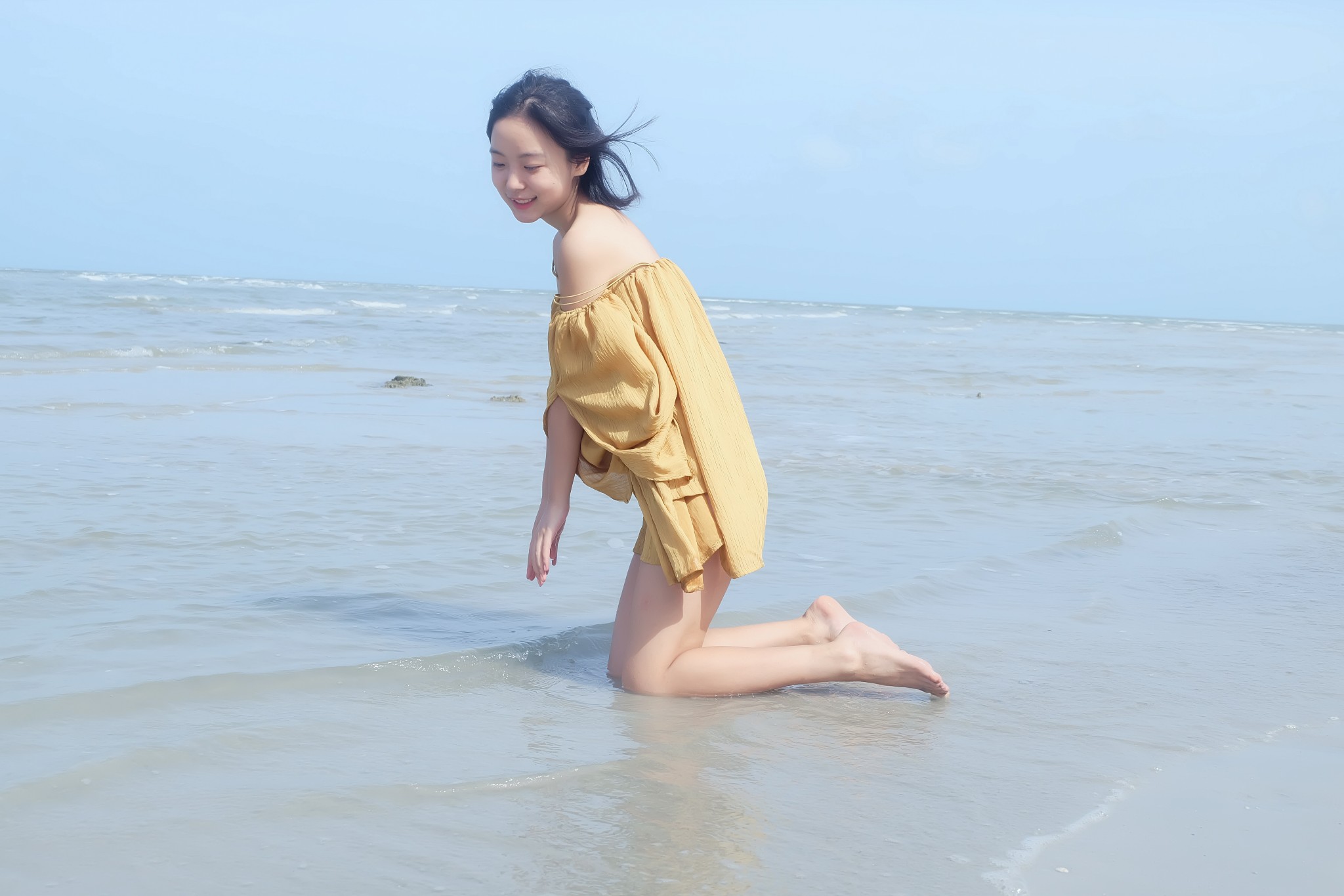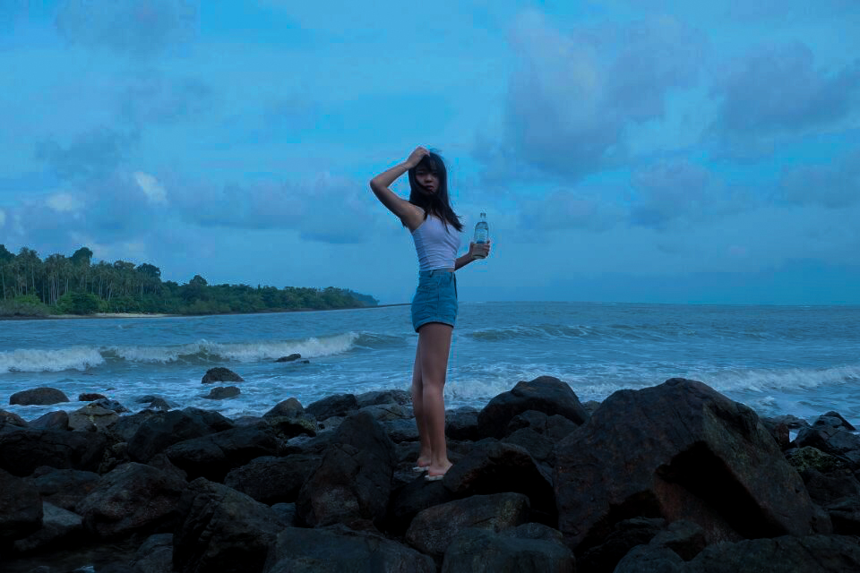 f、海边如果有礁石就最好不过了,让麻豆站在或坐着或躺在礁石上,摄影师抬高机位俯拍。