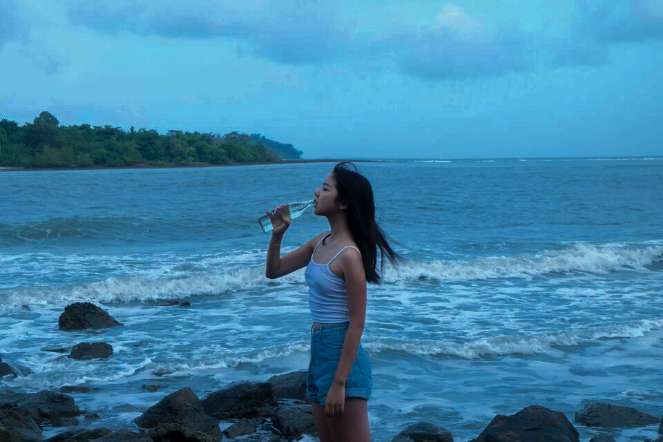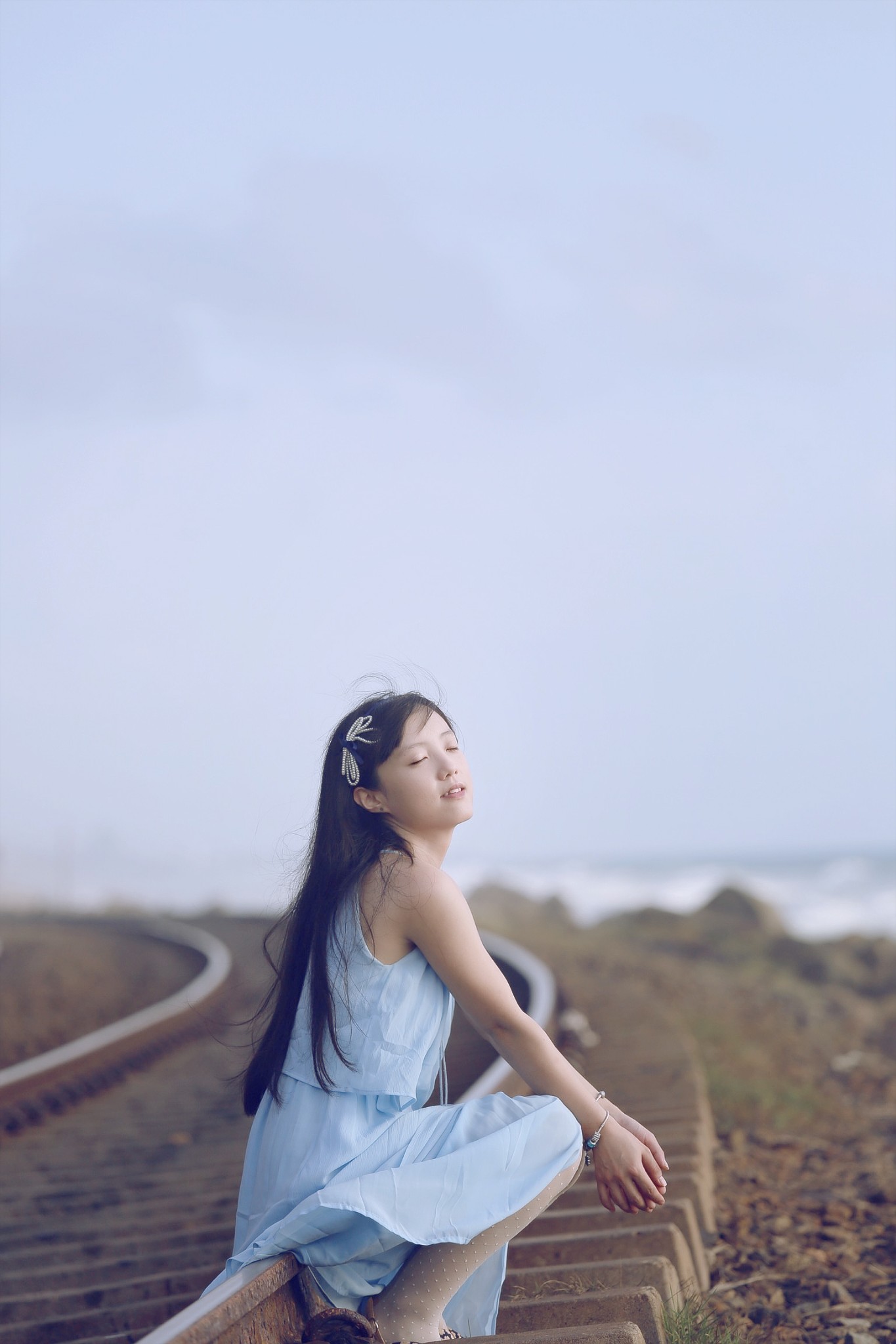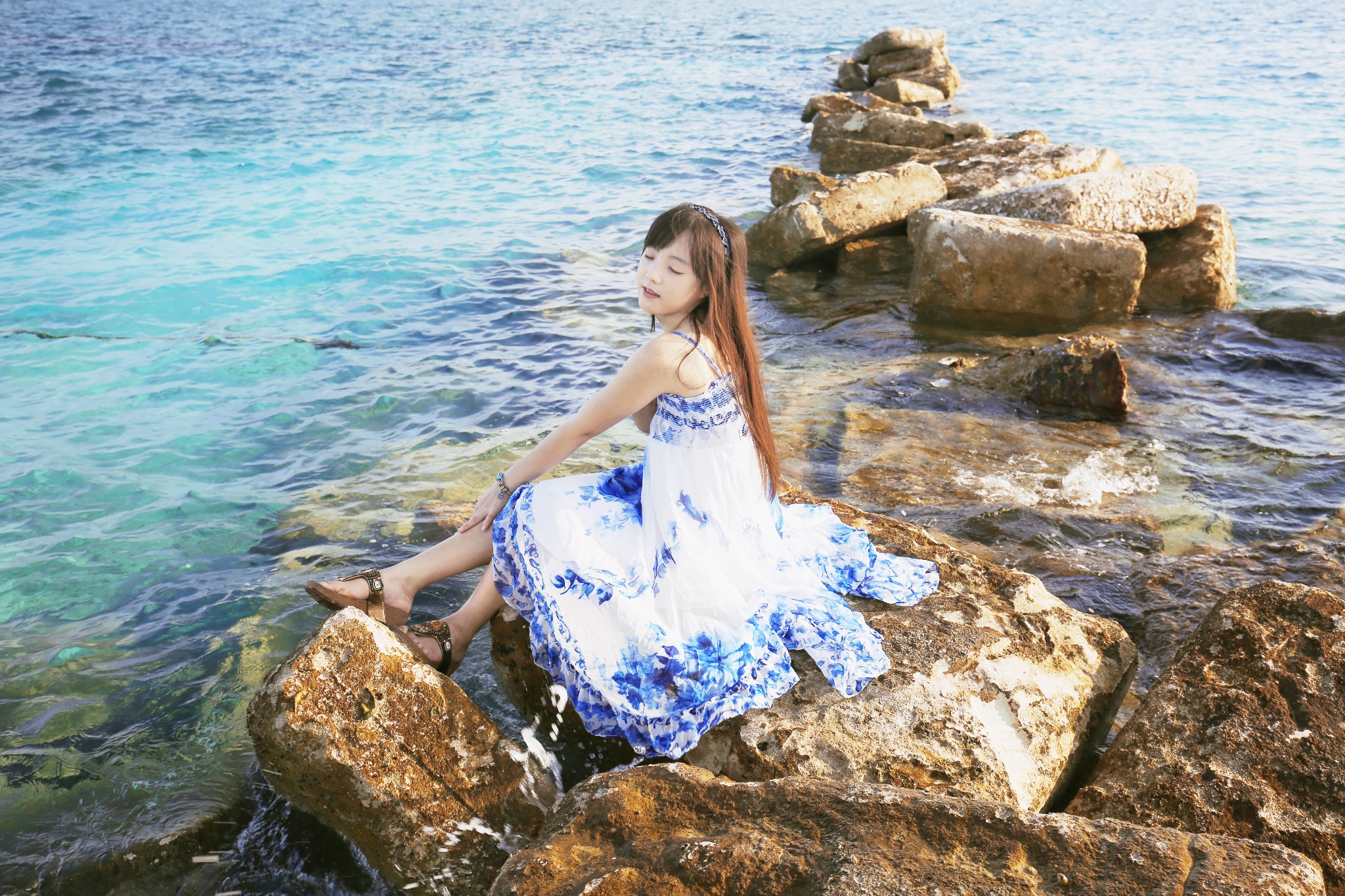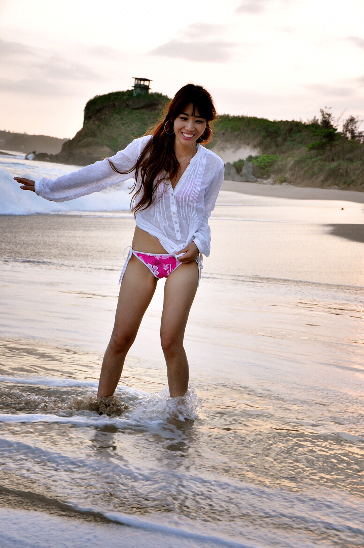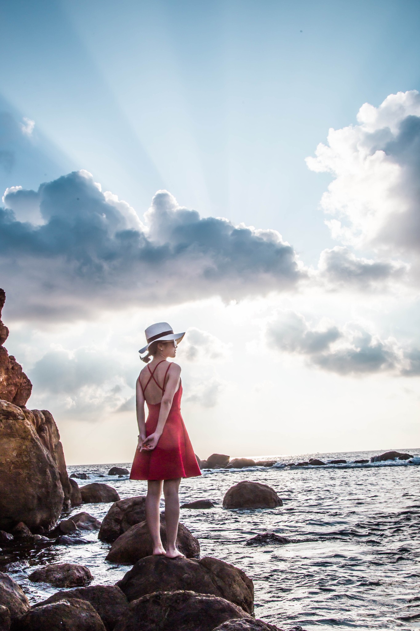 f、海边如果有礁石就最好不过了,让麻豆站在或坐着或躺在礁石上,摄影师抬高机位俯拍。