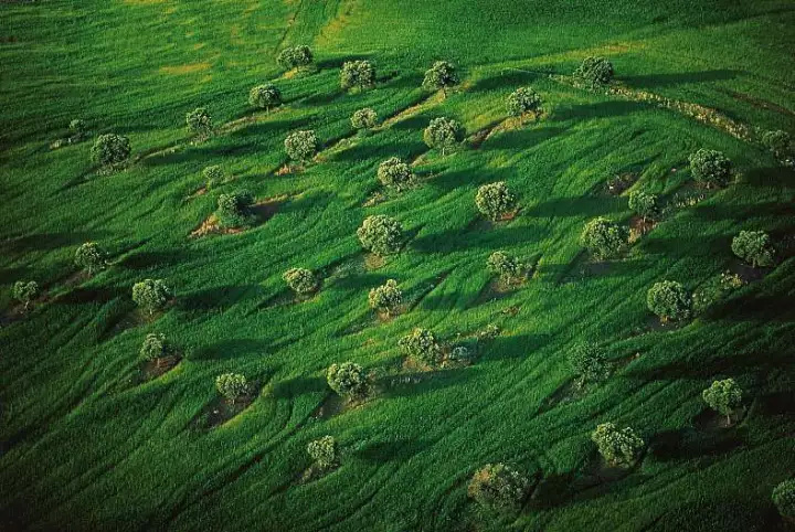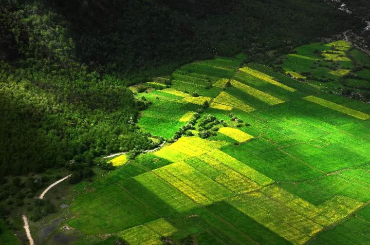 - 一块块整齐的田地进入视野,金灿灿的,非强迫症也看着非常舒服,我一直仔细地寻找田野中人类的踪迹,很遗憾不曾发现
