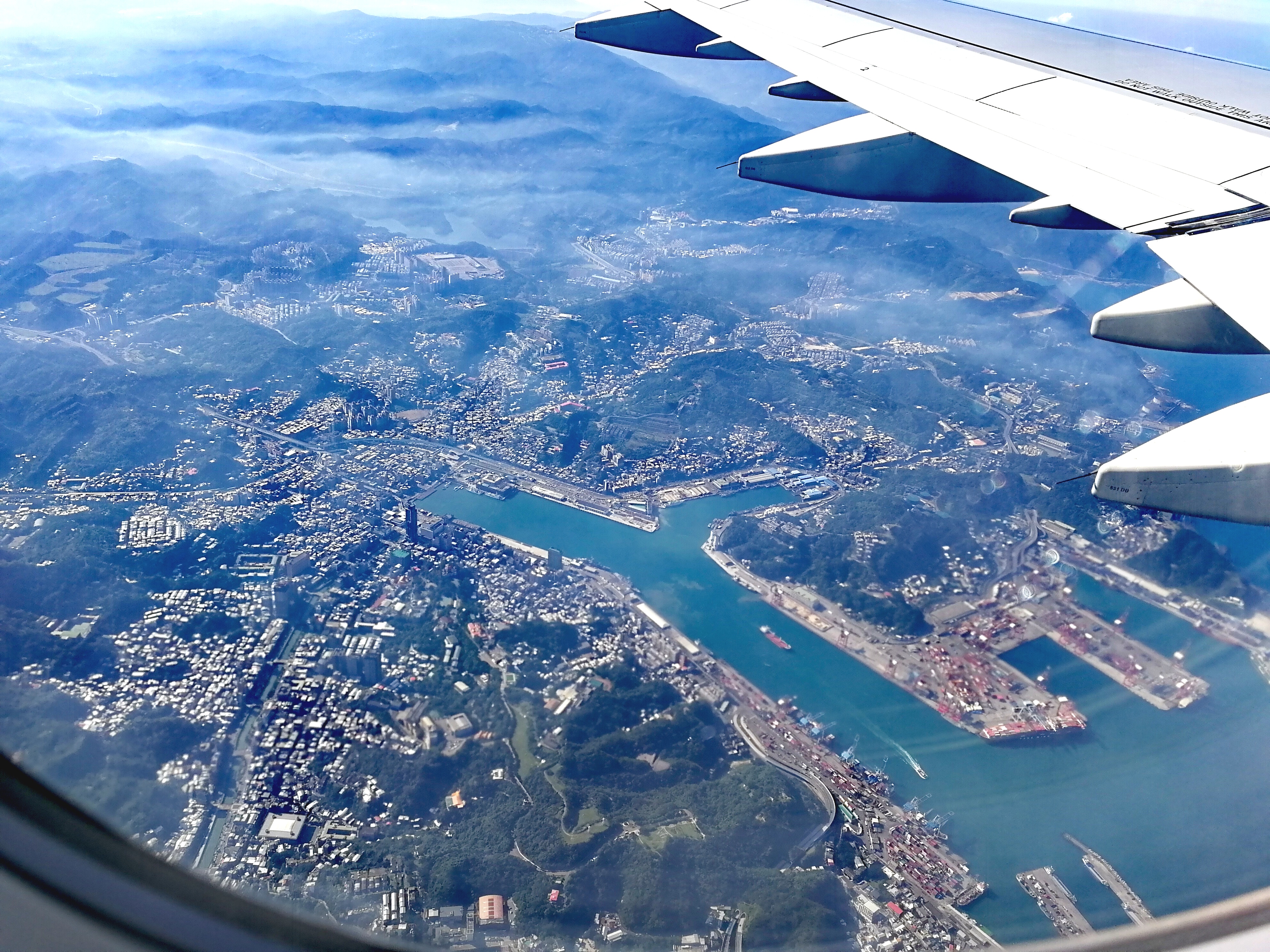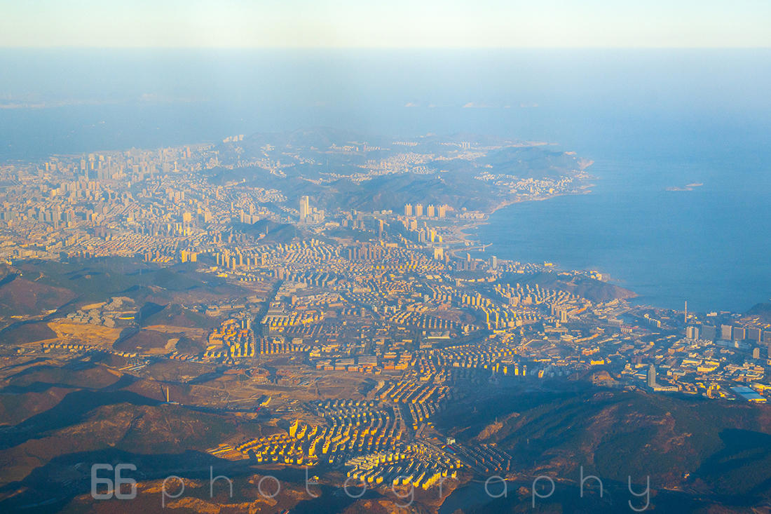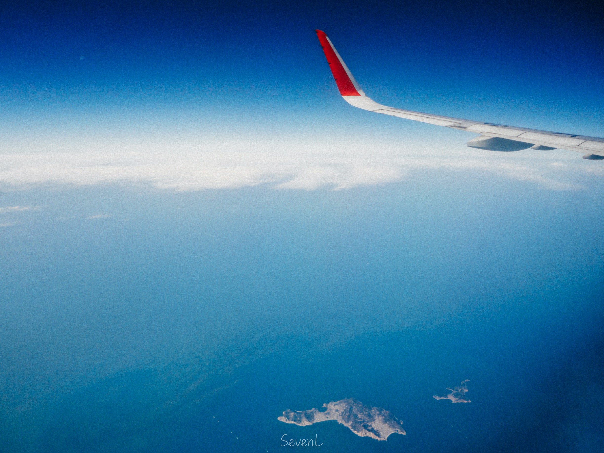 一开始飞机在云层之上飞行,完全看不到地面的情况。随着渐渐飞行到沿海,在渤海之上,能见度瞬间提高了许多,许多小岛和船只进入了我的视野