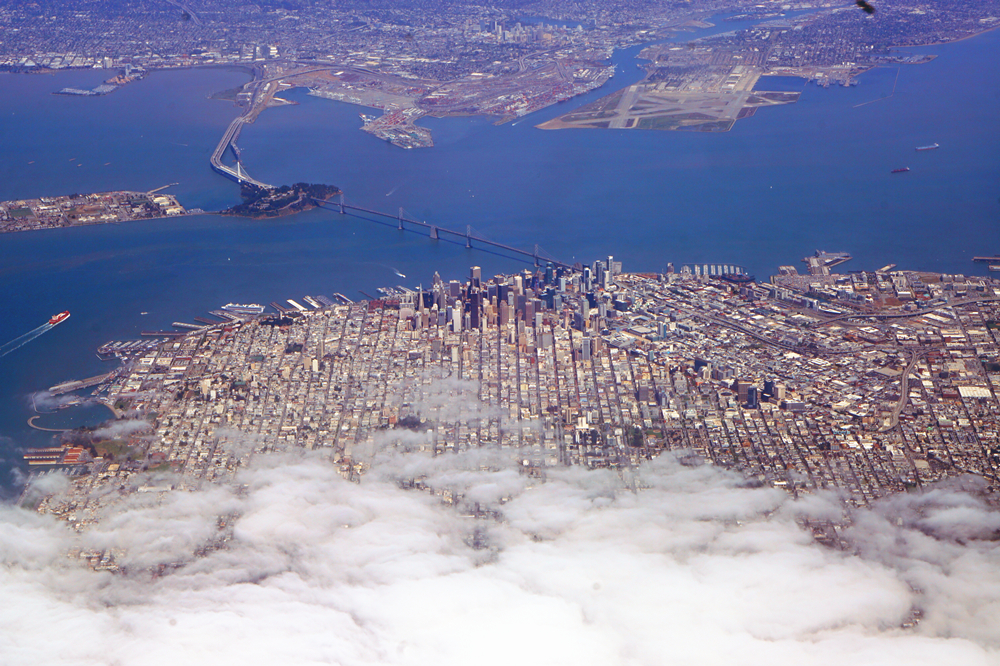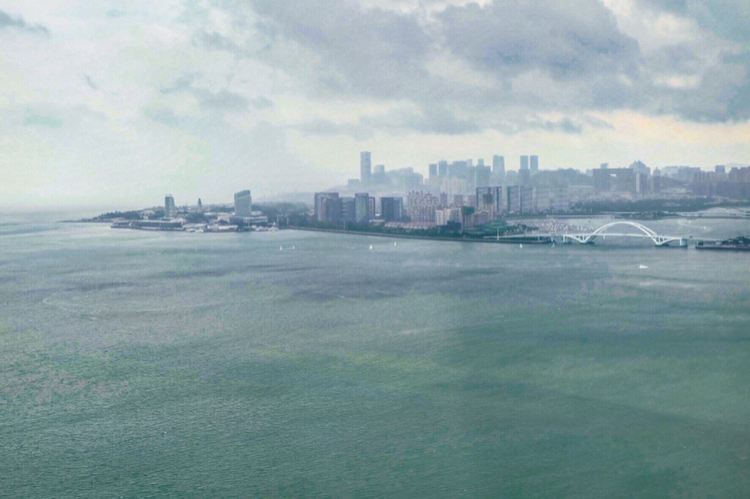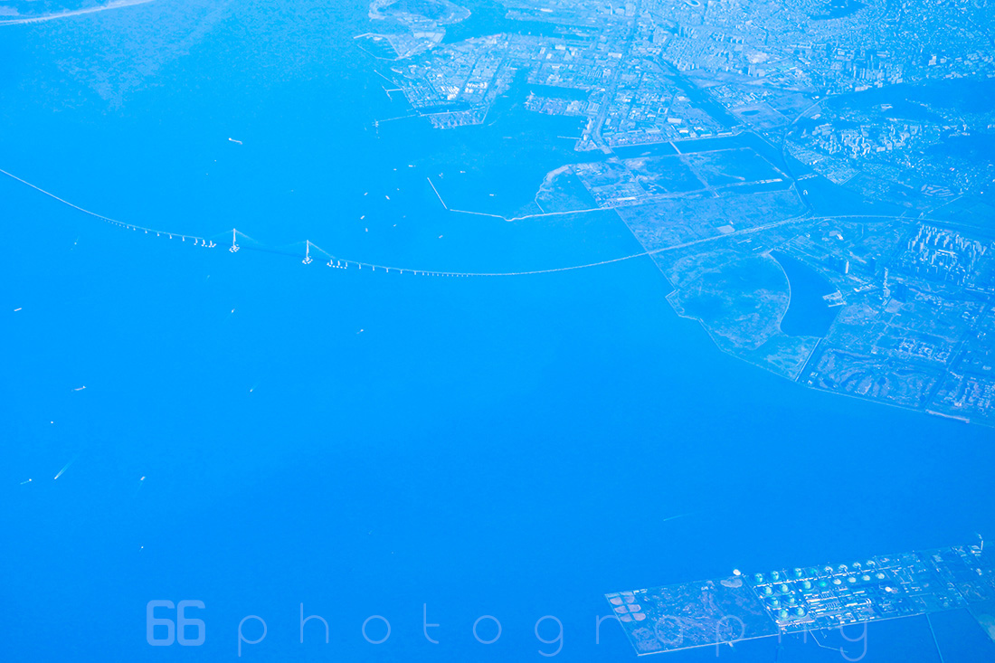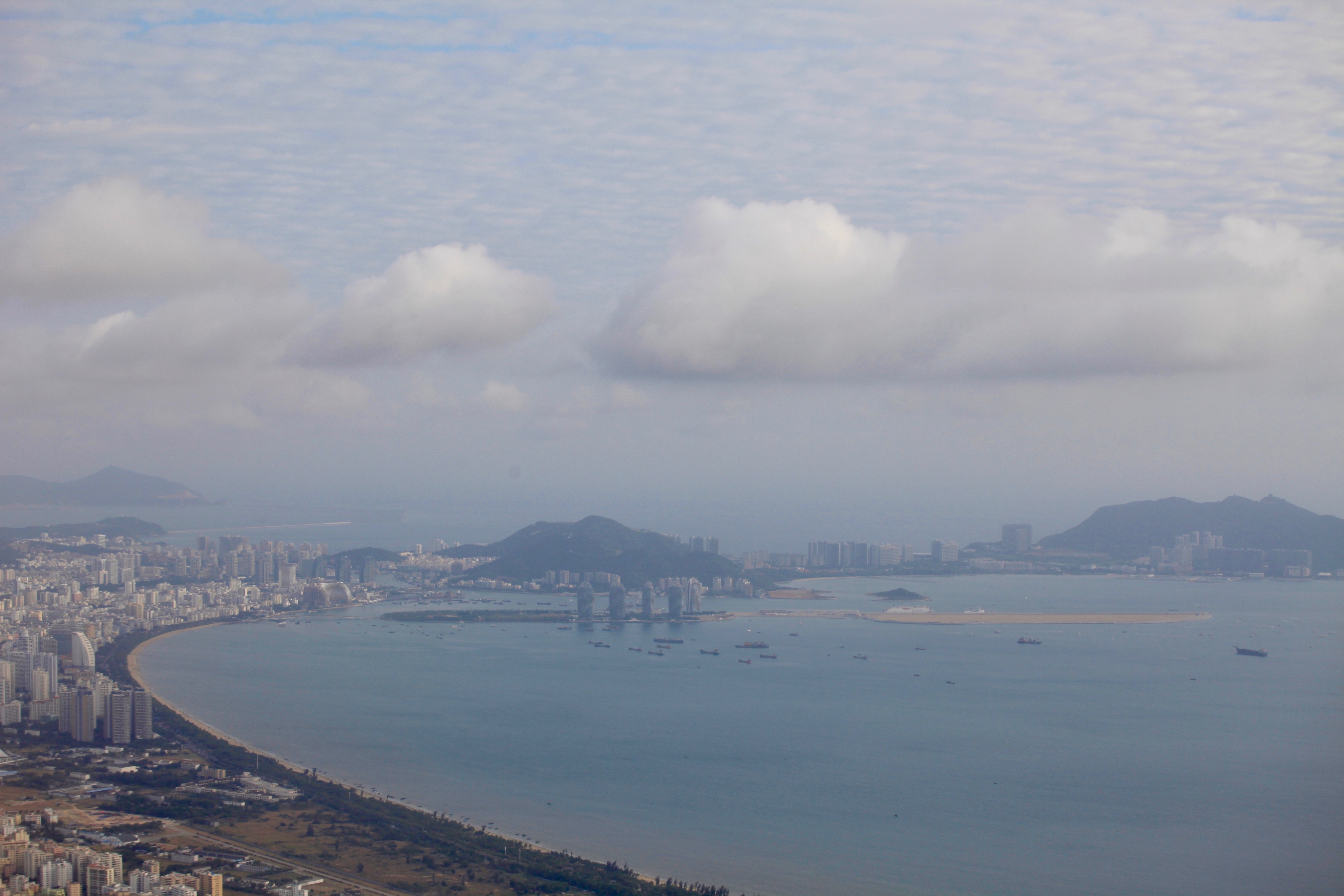 一开始飞机在云层之上飞行,完全看不到地面的情况。随着渐渐飞行到沿海,在渤海之上,能见度瞬间提高了许多,许多小岛和船只进入了我的视野
