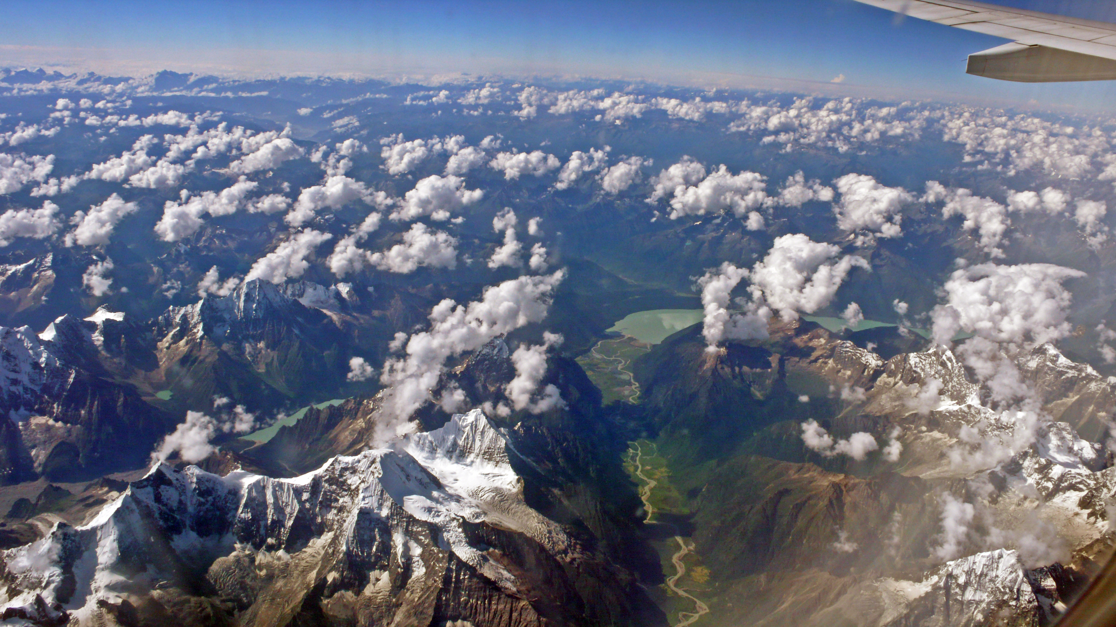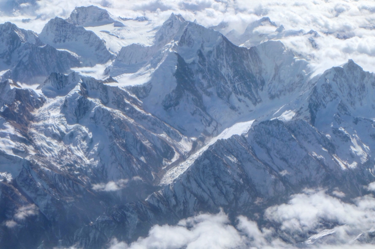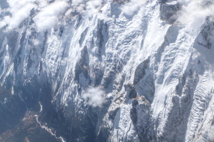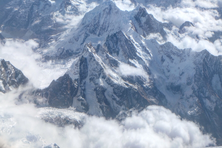 从成都起飞之后,不一会儿就来到了四姑娘山上空,一种刚从睡梦中惊醒就看到了云海的震撼,倦意一扫而光。这时候空姐也开始派发餐食了,吃着早餐看着窗外的美景,好像在看着风光大片,眼睛也舍不得眨一下。两三个小时的飞行没有让人审美疲劳,而是让我这个南方的孩子大饱眼福——好多雪!