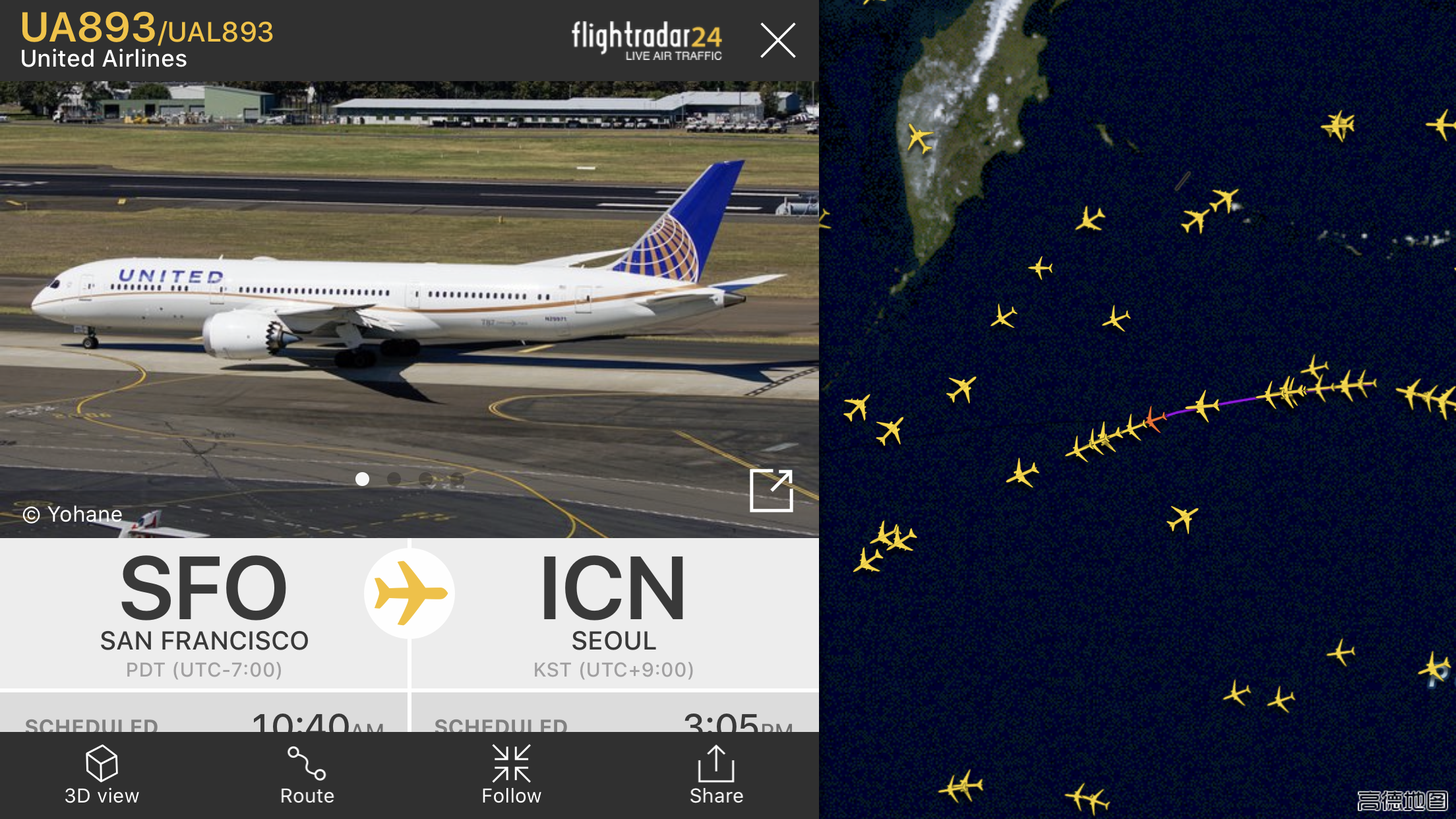 这个网站有一个APP叫Flightradar24特别有意思,可以看到地球上雷达能检测到的所有飞机的实时位置,也就是你可以通过软件知道刚刚飞过你头顶的是哪些航班,点击飞机就能看到航线和相关信息。