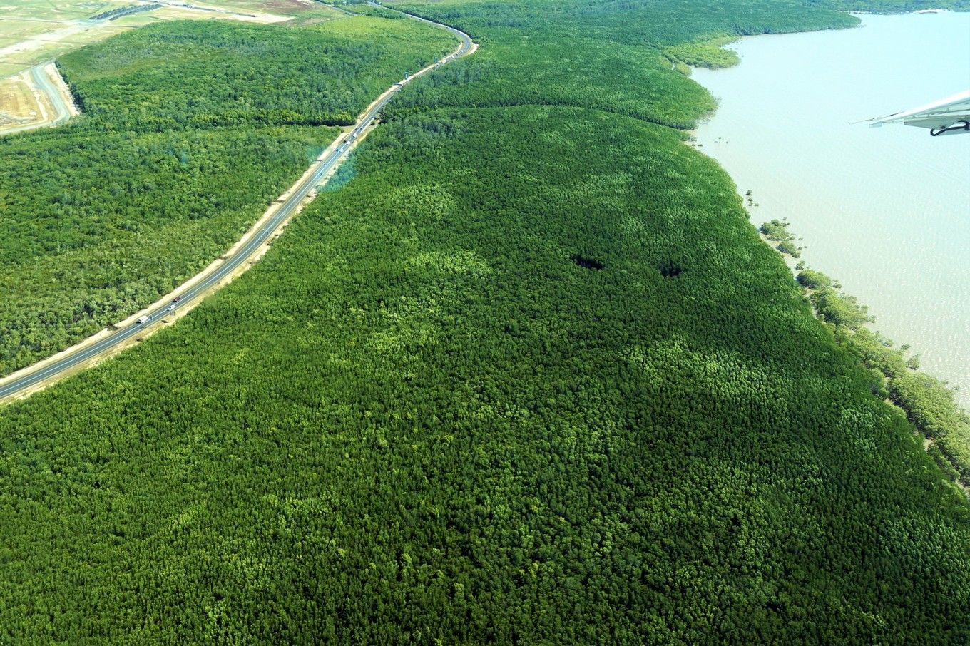 墨西哥湾的海水,有着迷人的颜色,由深到浅。而远处没有被开发的区域,是一片茂密的绿色。
