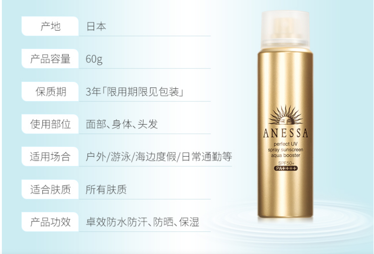 日本防晒断货王,也是蛮网红的一款。买来尝试了一下,主要用于跟妆,虽然还没经过暴晒环境测试,不过网评普遍认为防晒力和耐久力比较普通,所以只敢在已经打过底的前提下补防晒使用,或是在日晒程度一般的城市中使用。买它主要看在喷雾的使用感,跟妆犯懒时比起抹呀抹呀的防晒霜要方便得多。Naris是水状喷雾,对于我这种喜欢拿着喷雾绕脸直接喷六圈的人来说有点不太习惯,所以使用感要扣一星。补喷时不会导致明显的花妆,但还是不建议在刚刚打过粉底后立刻使用。它的香味备受争议,但至少对我来讲是属于蛮舒服的清香型,成膜快,刚上脸时略微有些油感,但成膜后没有异样感,用在身体上没有油腻感。