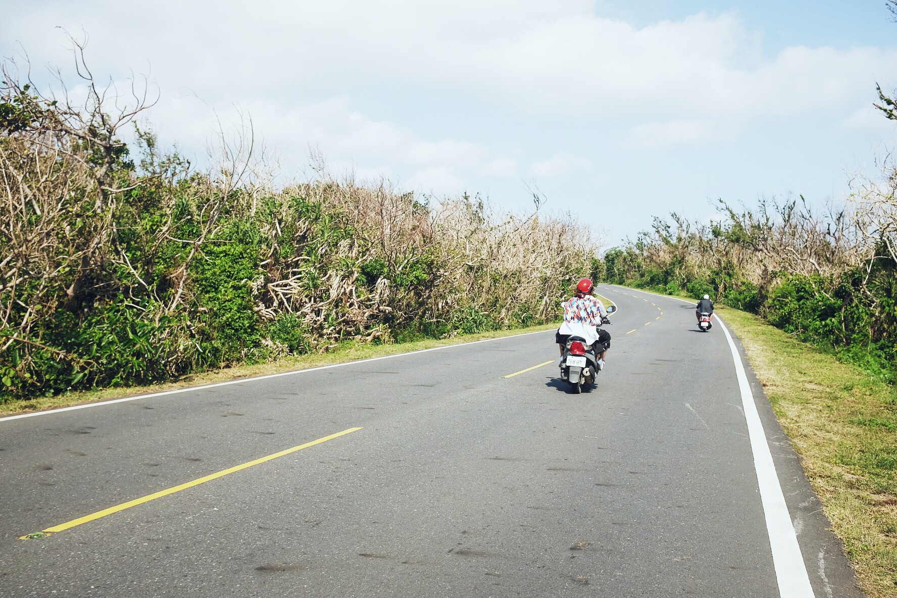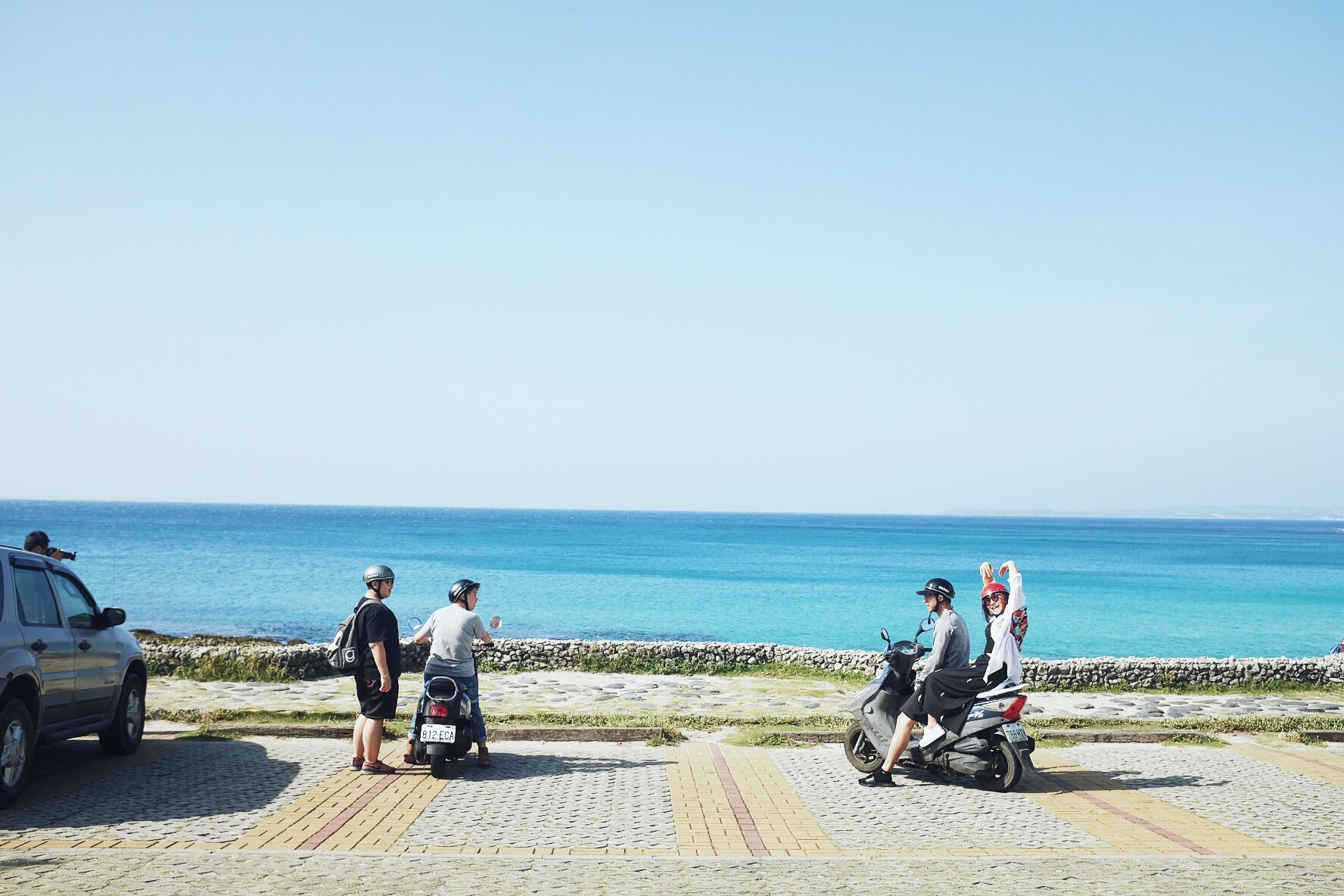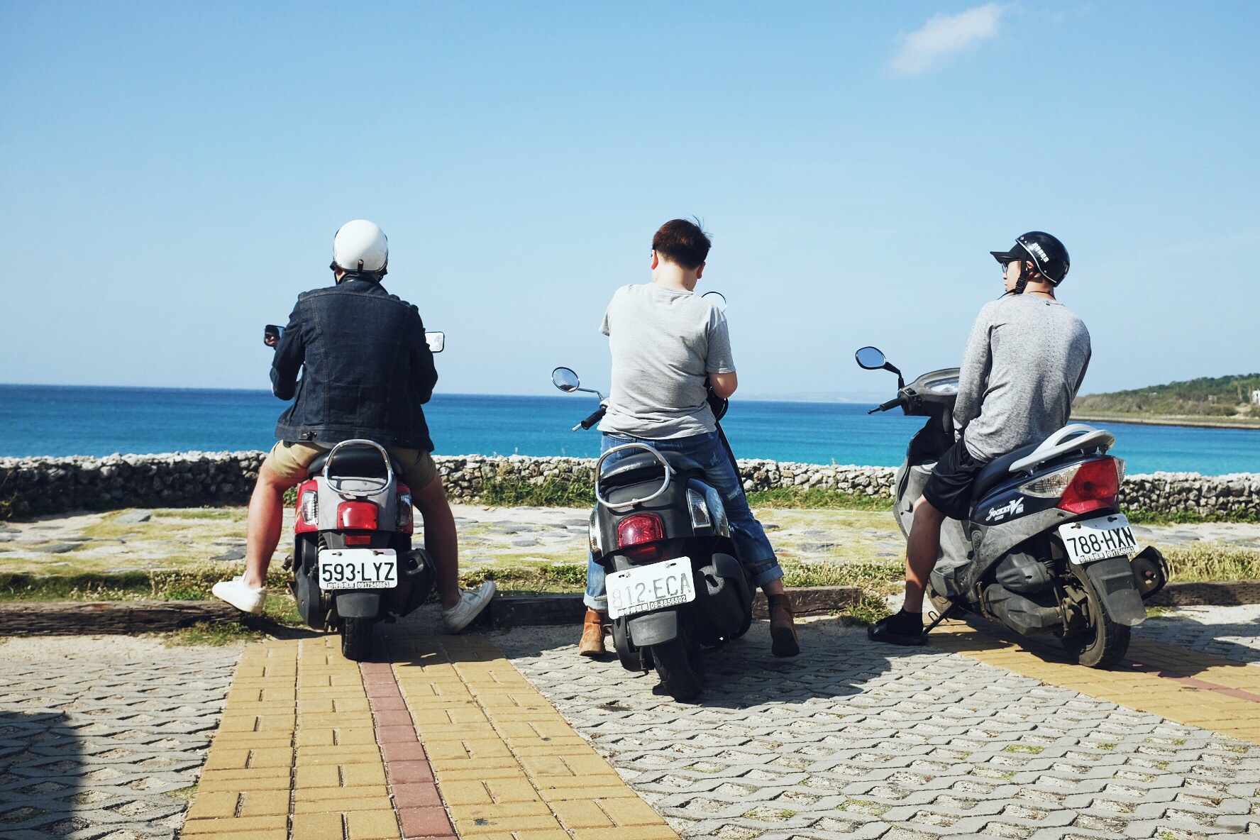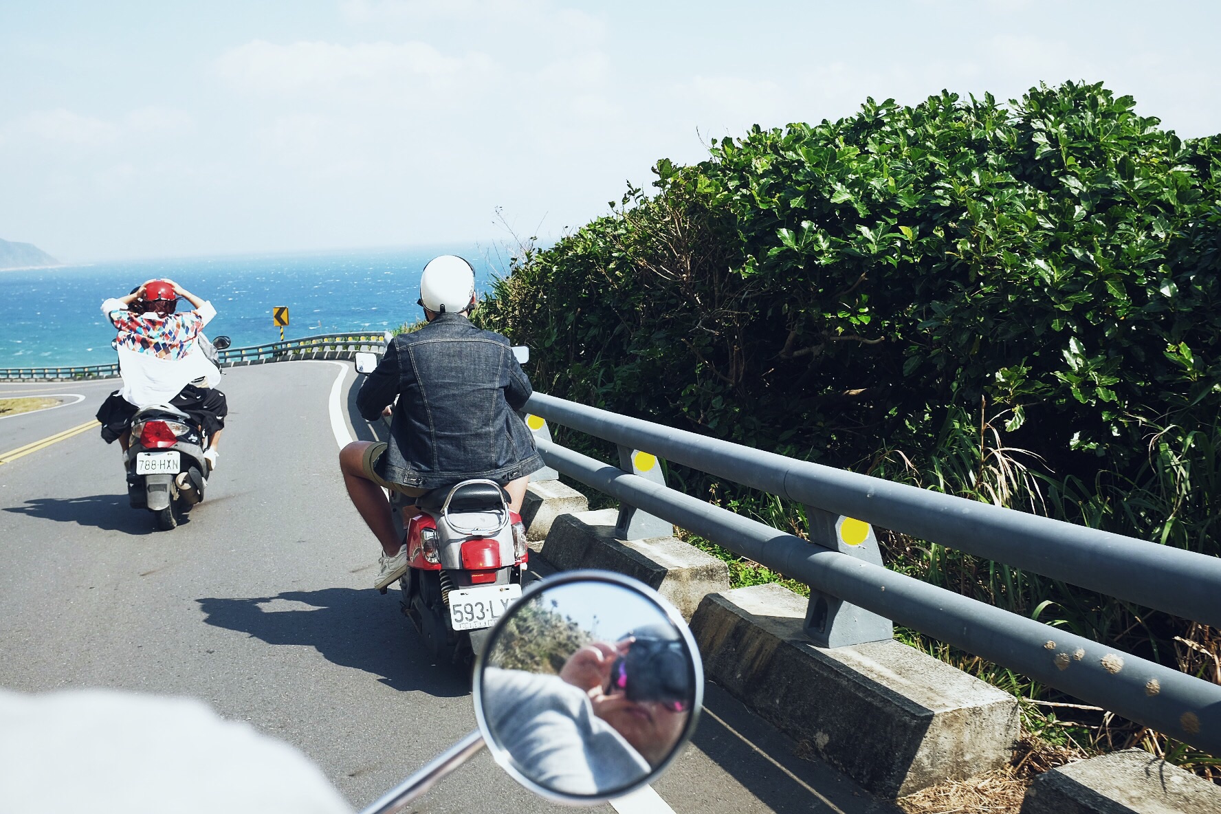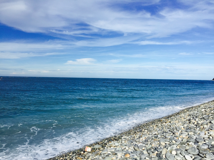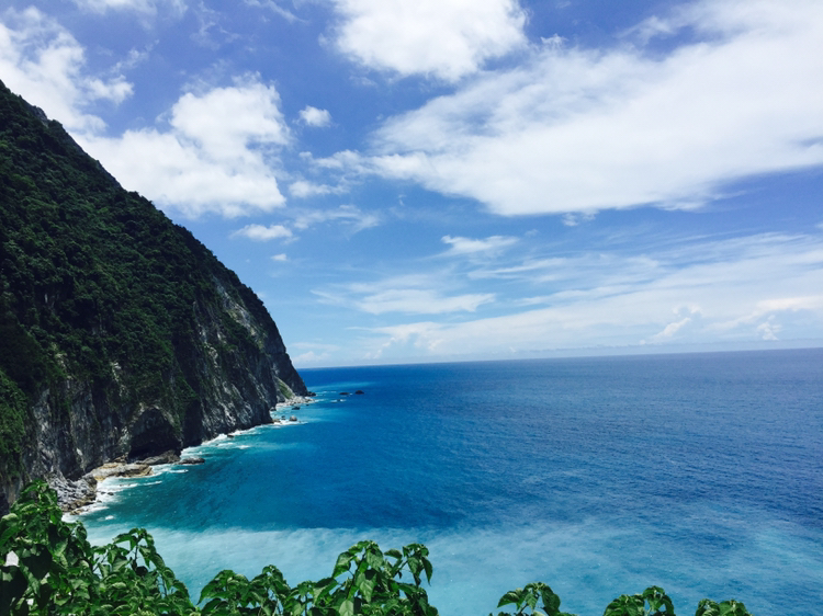 哇,终于开始像偶像剧般的,骑着机车乘着海风闻着海水的味道开始环岛!坐在后座有更多精力可以多看旁边的美景,比如海水的渐变和分层,还有越到中午越蓝(在