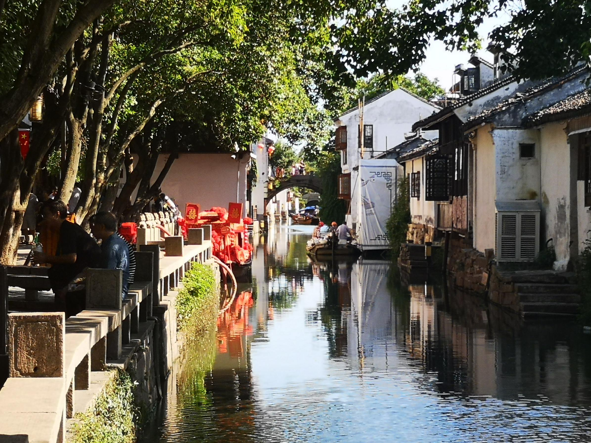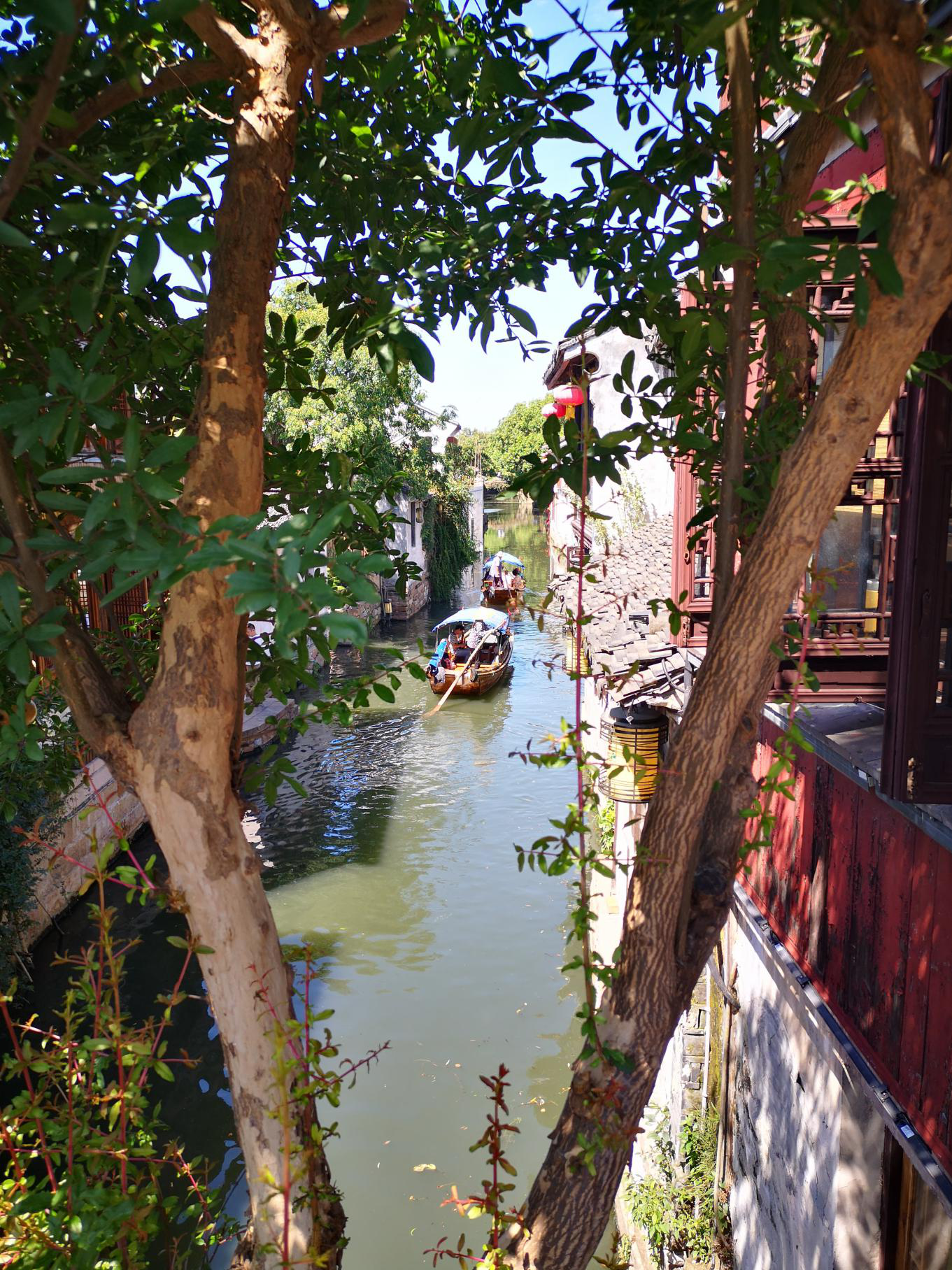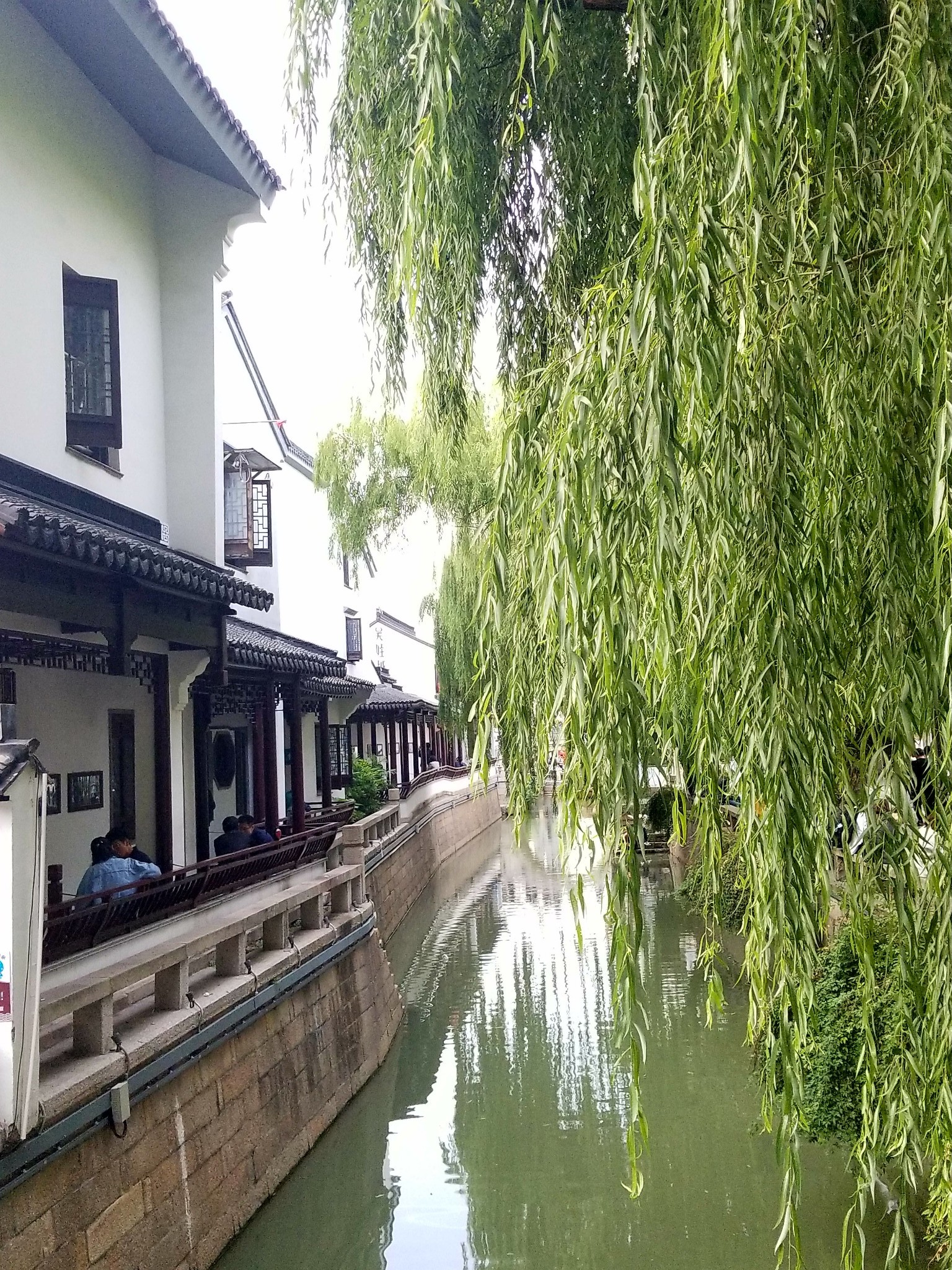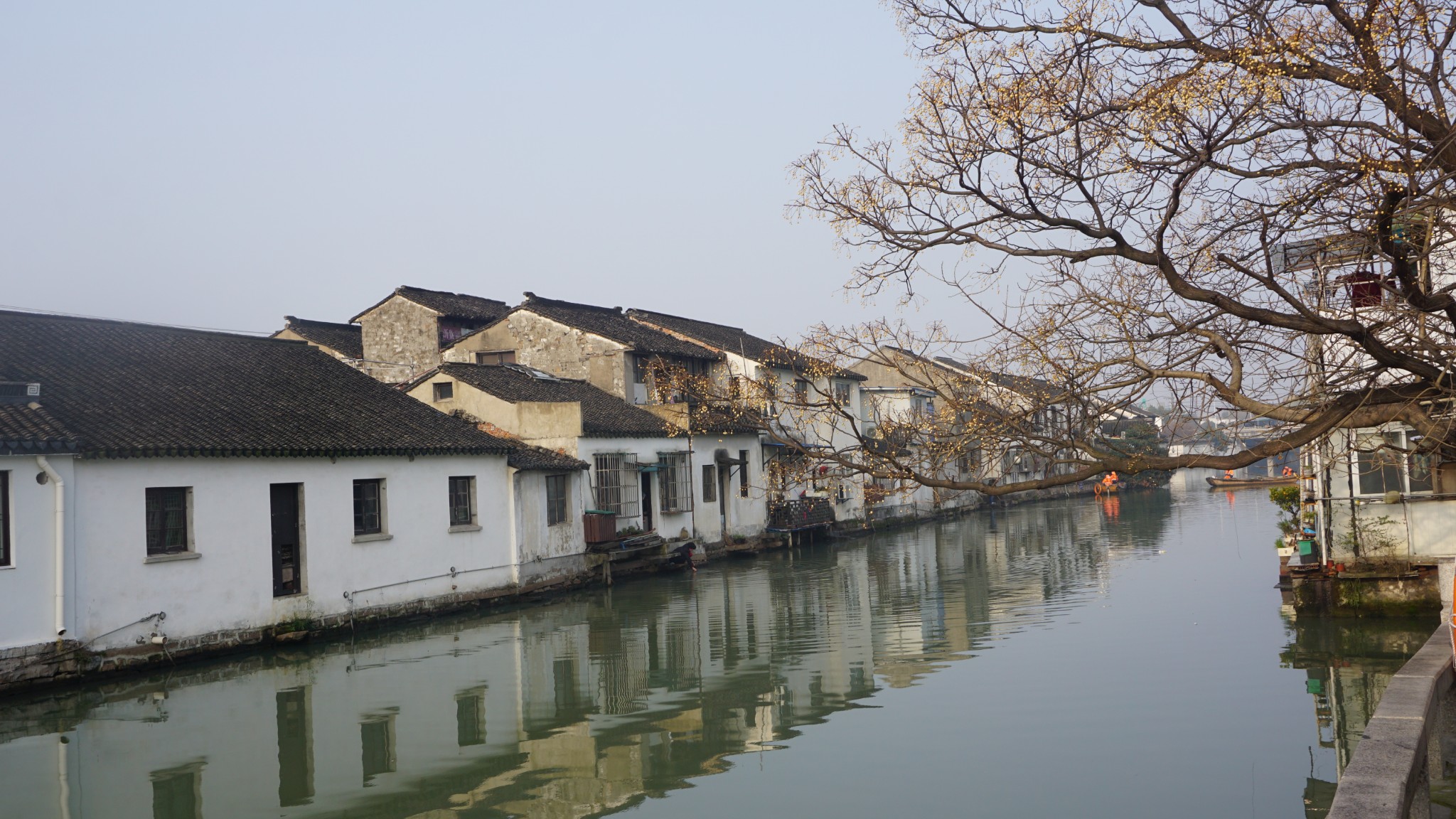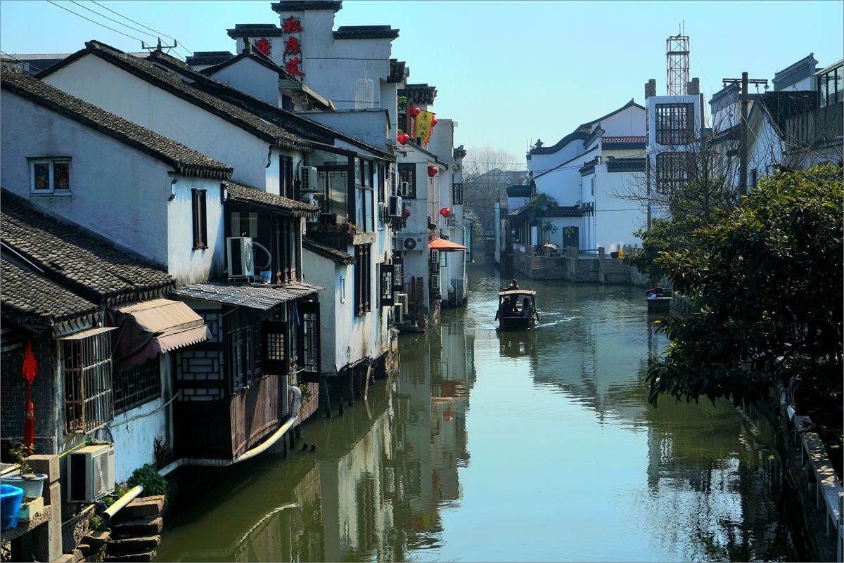 平江路幽静的河道与粉墙黛瓦的房屋、楼阁、小桥、花木之间彼此借景,宛如一幅长卷画。偶然一枝柳树斜斜地倚到河面上,颇有拂波之意。河道窄处两岸似乎援手可握,宽处可容一船周转,也不过隔水可呼。
