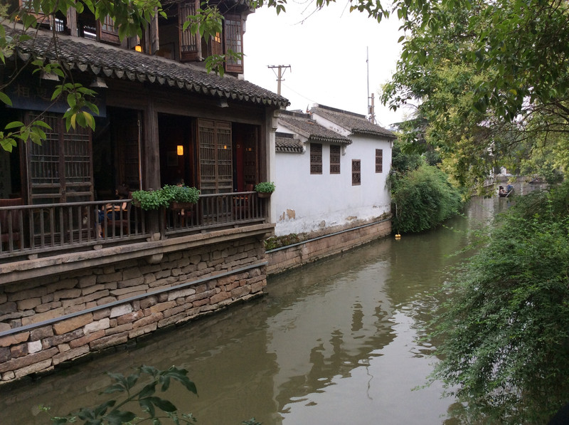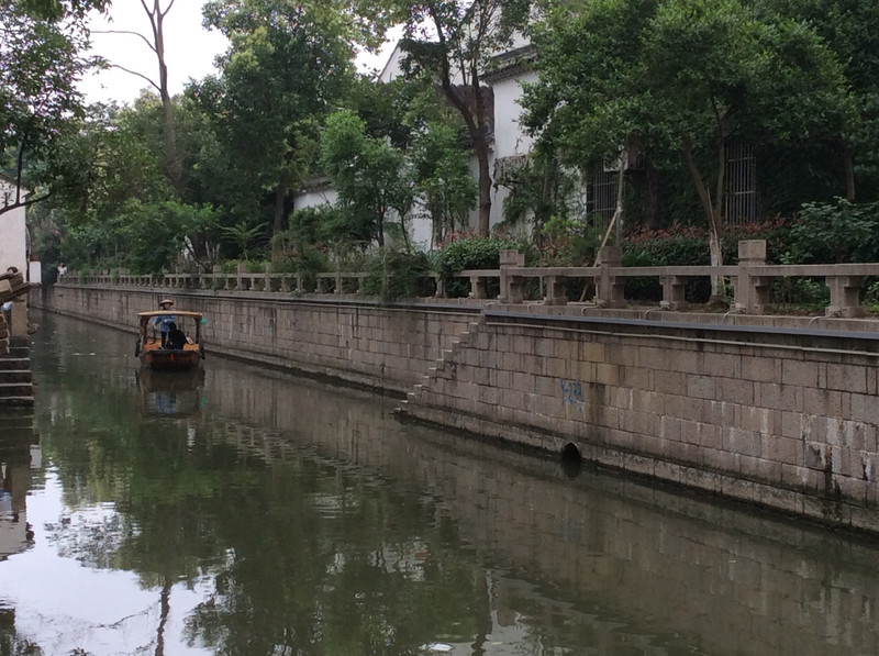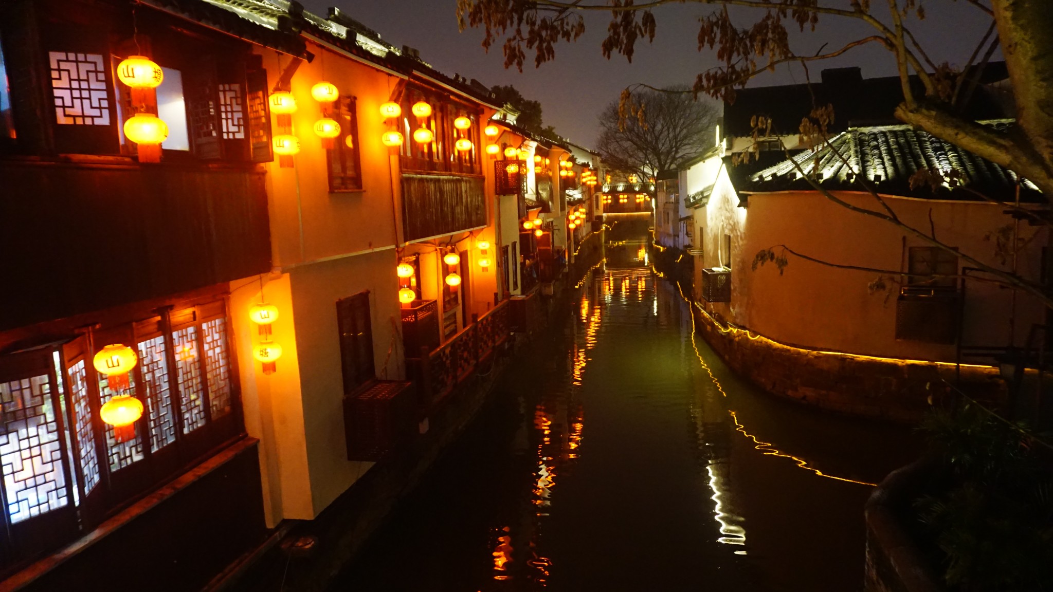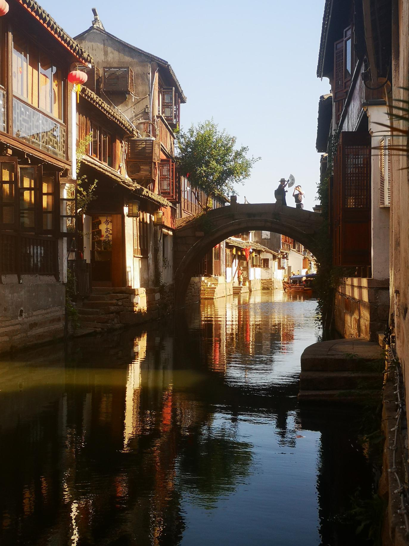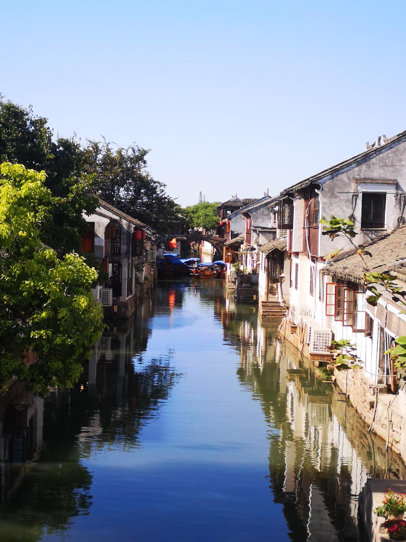 平江路幽静的河道与粉墙黛瓦的房屋、楼阁、小桥、花木之间彼此借景,宛如一幅长卷画。偶然一枝柳树斜斜地倚到河面上,颇有拂波之意。河道窄处两岸似乎援手可握,宽处可容一船周转,也不过隔水可呼。
