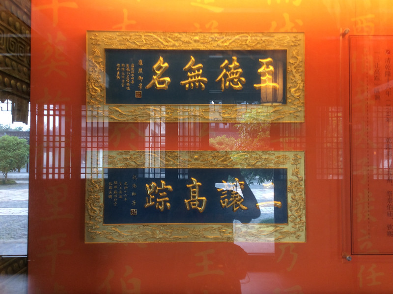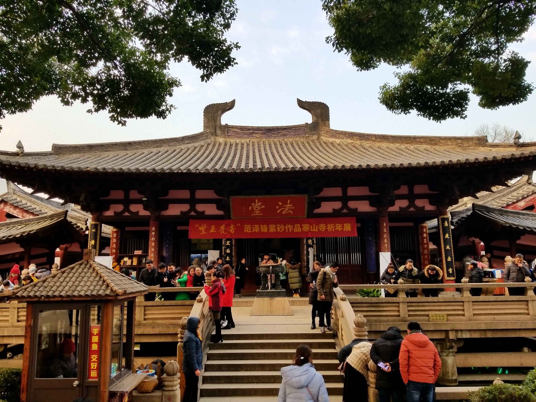 寒山寺此时的寒山寺法堂,正巧有一个大师在举办紫砂壶展览,热闹非凡。抬头看去,这座大殿必然有过许多的故事,经魔历劫,屡废屡兴。或许也曾悲催到只剩下一尊佛像,一盏青灯,一个守门的僧人。然而它却像白居易诗中的“离离原上草”,一遇春风。就在下一个时代里重开法席,燃旺香火。香客络绎,不绝于途吧。