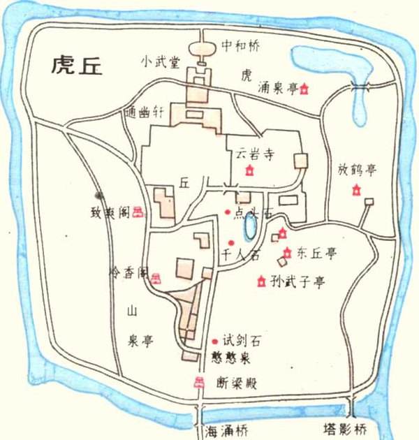 不到虎丘,乃憾事亦”的感叹。西山庙景区有西山庙桥、席场弄、西山庙与小普陀遗迹等景点,以小桥流水,水乡人家,暮鼓晨钟,梵音塔影,画船箫鼓,水上风情为规划目标。金鸡墩景区发现了鸡墩新石器文化遗址,景观以波光云影,众水汇集,鱼跃鸢飞,湿地萋迷为特色。市井景区有山塘历史街区(虎阜桥至万点桥段)、李公祠等。虎丘风景名胜区虽面积不大却融合了自然景观和人文景观,展现了山丘、奇石、峭壁、池潭、泉水、河流、古树名木以及新石器文化层遗址、名胜古迹、摩崖石刻、碑刻、古建筑、古桥梁、民俗节庆于一体的旅游风貌。
