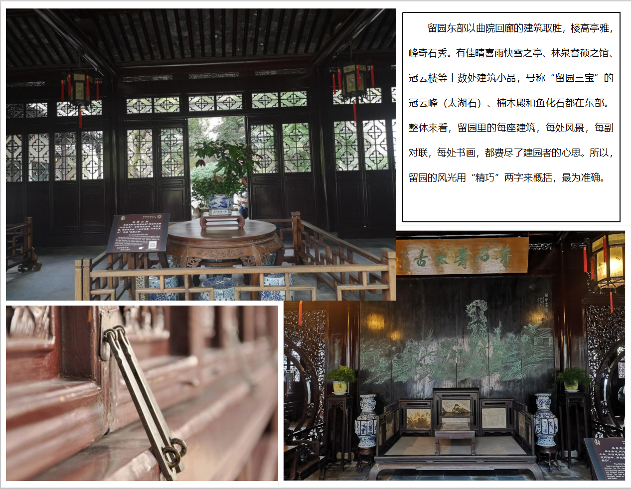 留园建筑物将园划分为几部分,每个建筑物都设有多种门窗,每扇窗户各不相同,可沟通各部景色,使人在室内观看室外景物时,能将以山水花木构成的各种画面一览无余,视野空间大为拓宽。
