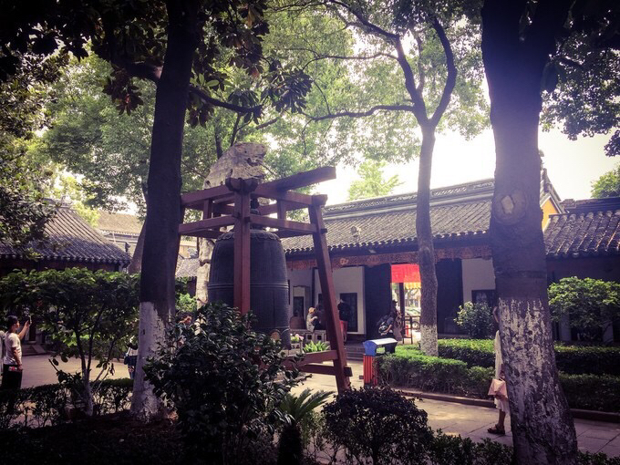 寒山寺此时的寒山寺法堂,正巧有一个大师在举办紫砂壶展览,热闹非凡。抬头看去,这座大殿必然有过许多的故事,经魔历劫,屡废屡兴。或许也曾悲催到只剩下一尊佛像,一盏青灯,一个守门的僧人。然而它却像白居易诗中的“离离原上草”,一遇春风。就在下一个时代里重开法席,燃旺香火。香客络绎,不绝于途吧。