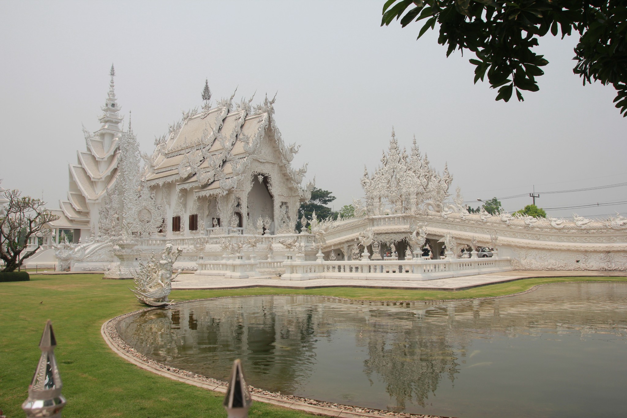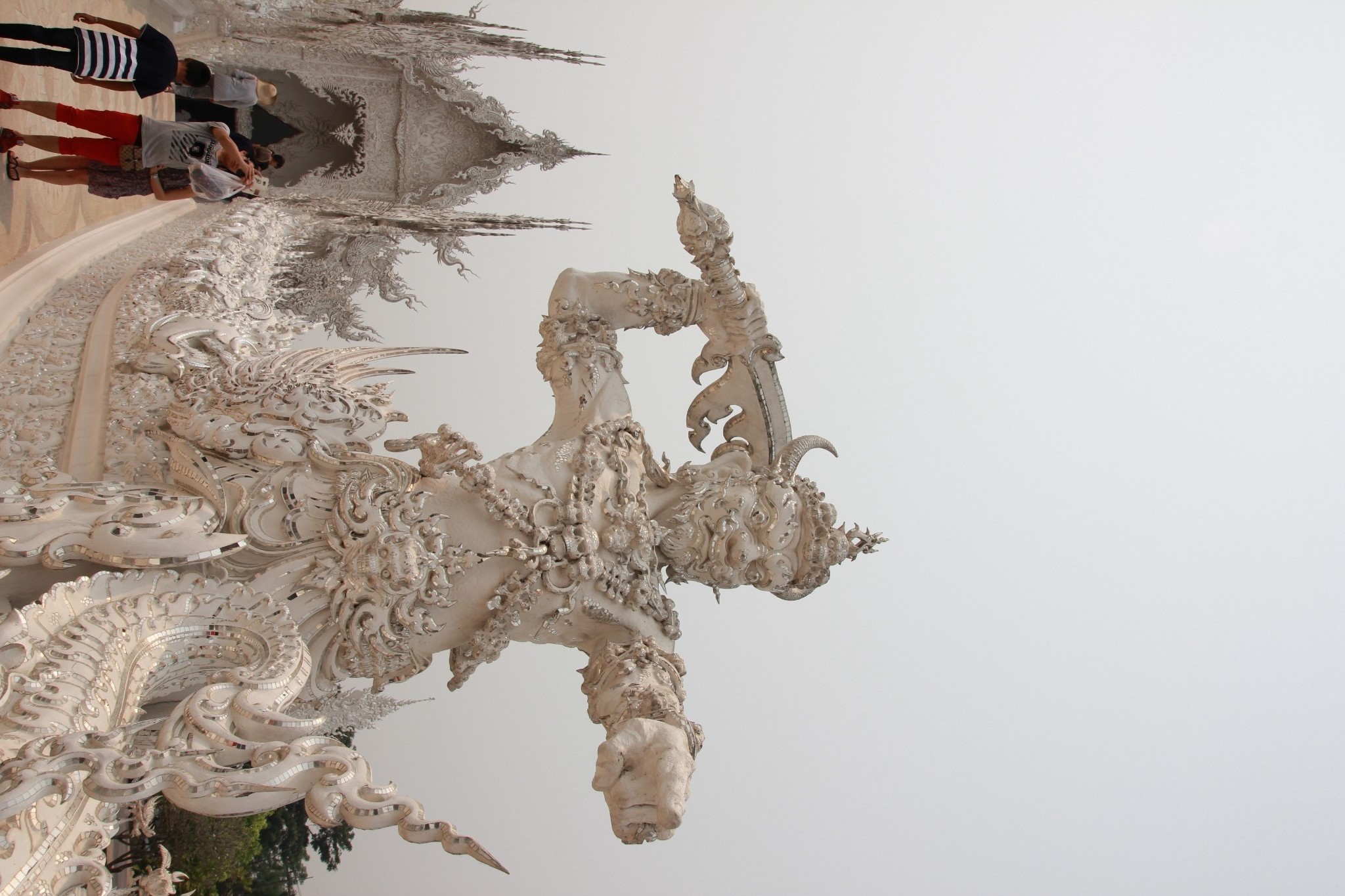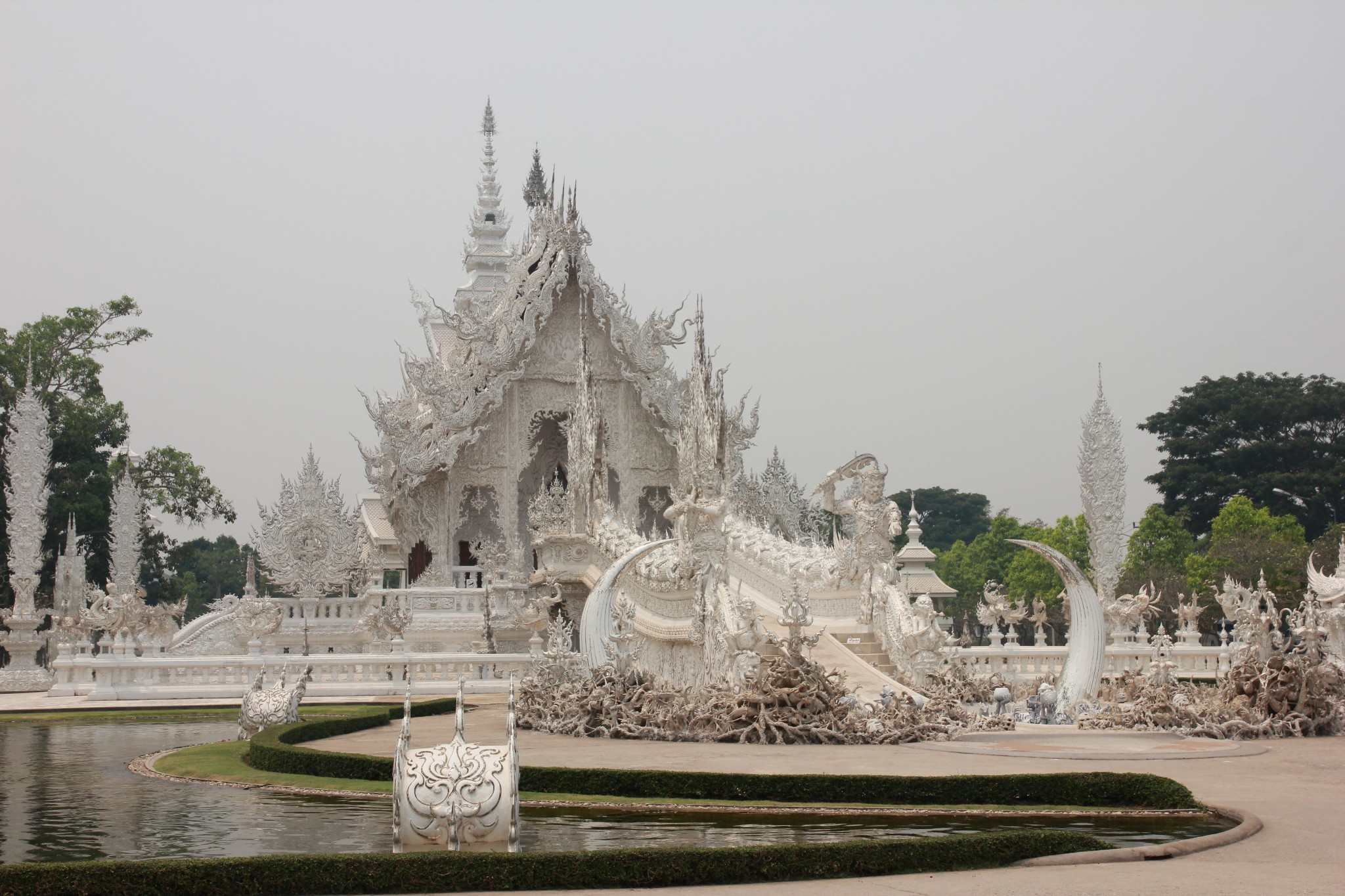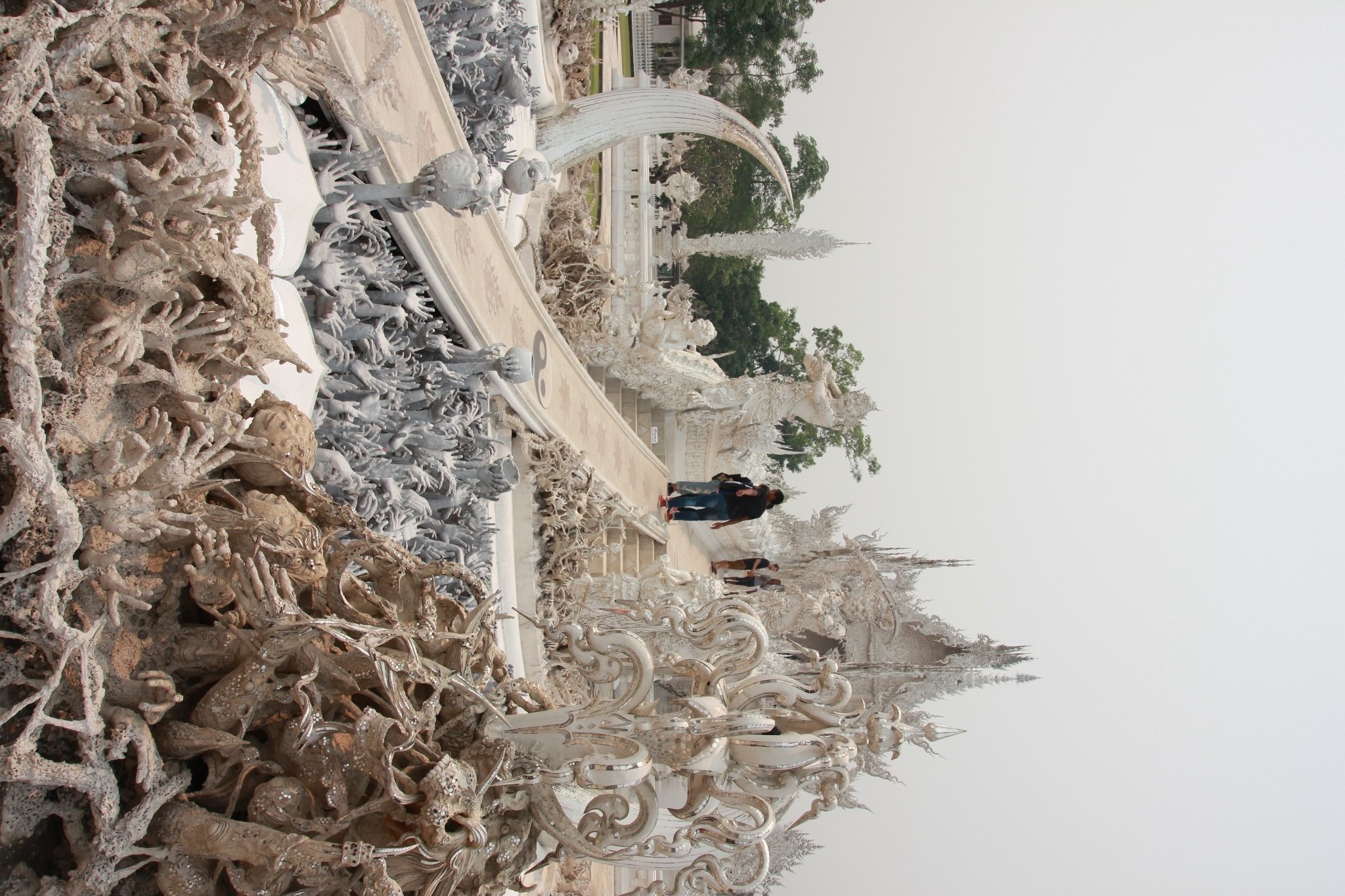 第五:清莱白庙:去白庙的时间不是太好,因为跟团,到点是大中午,阳光直照,又有点多云,所以拍出来的照片不甚满意,同事清莱的白庙也是唯一在清迈跟团去的一个景点,我只能说这里一定一定要来一次,她的美纯白无暇,她的美无法用言语形容,感觉每一寸都是精雕细作,没有一个地方不是费尽人类的极尽思考来完成的,而且刻画出了天堂与地狱的模样,据说白庙还要再建70年才能建完,不过白庙里面真的好普通,外表真的是无可挑剔了,下图中金色的就是传说中的黄金厕所。