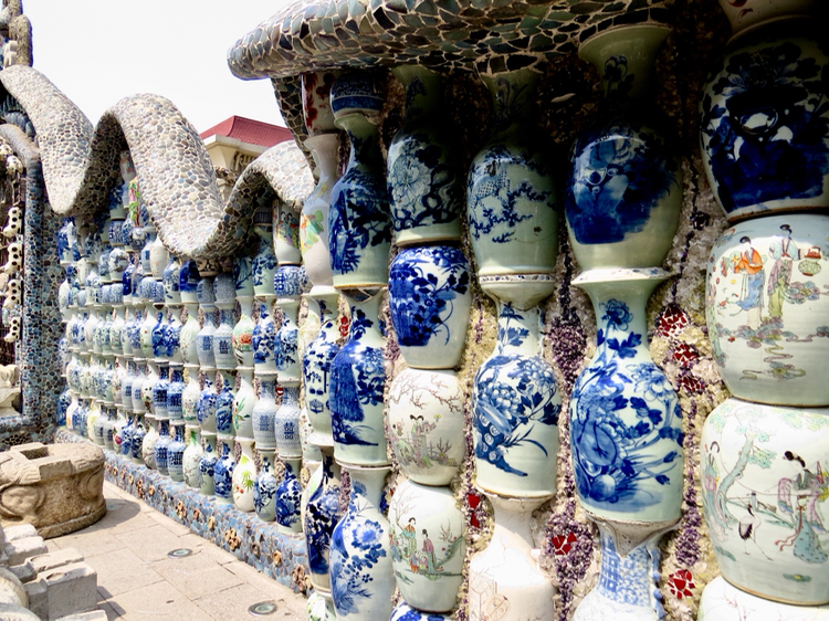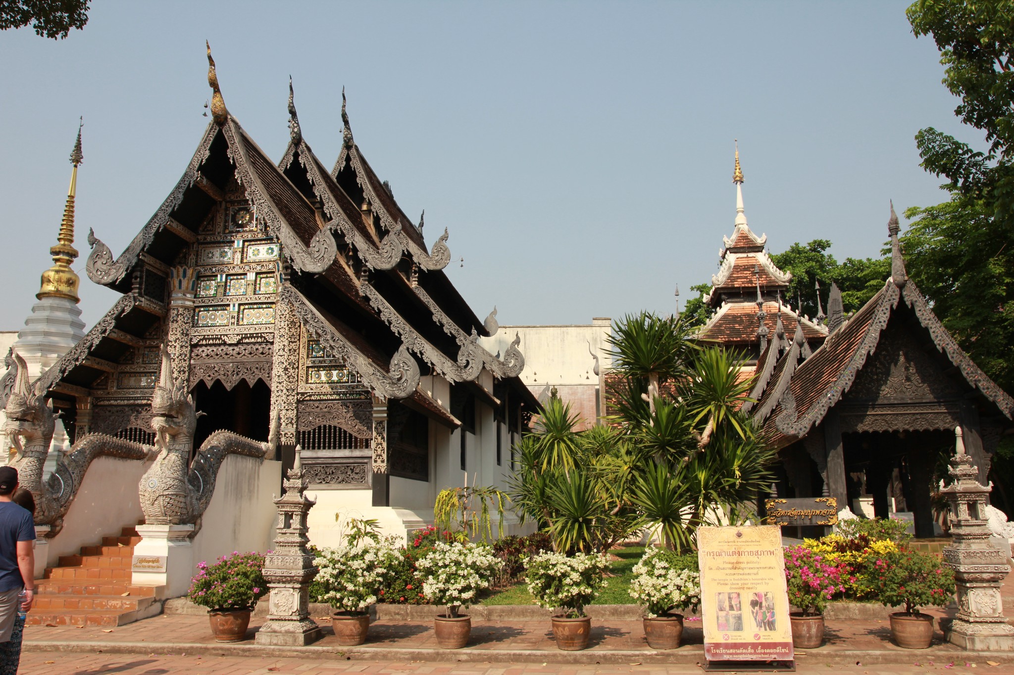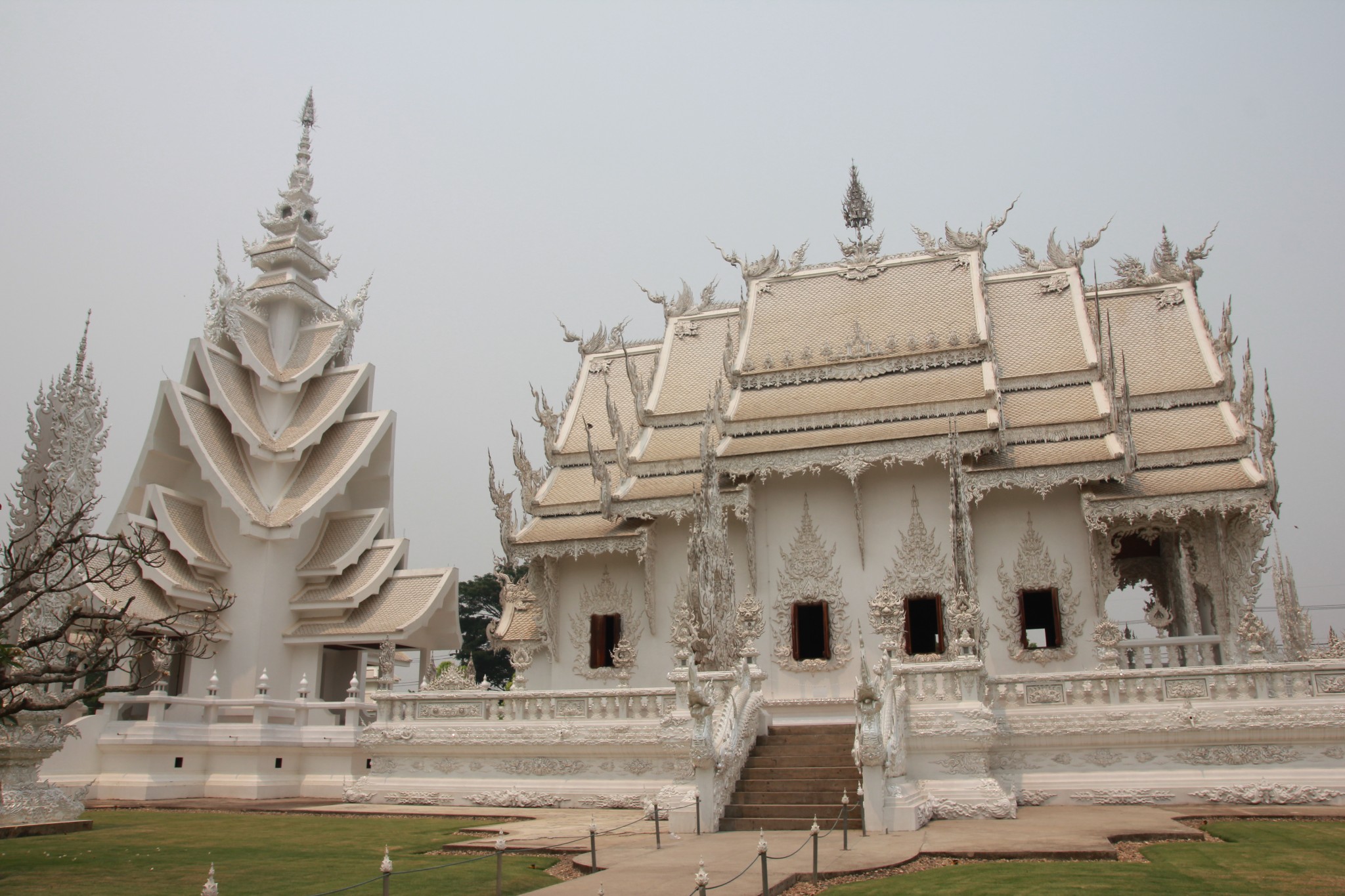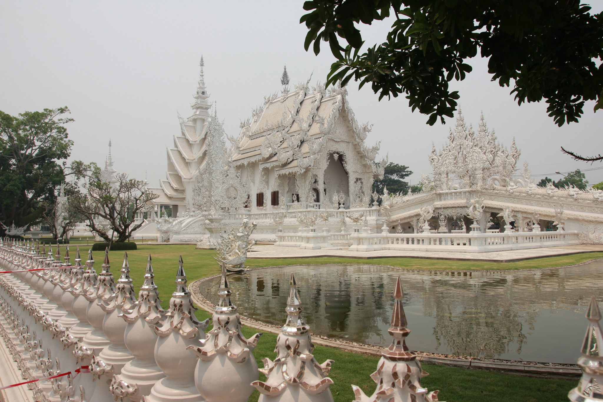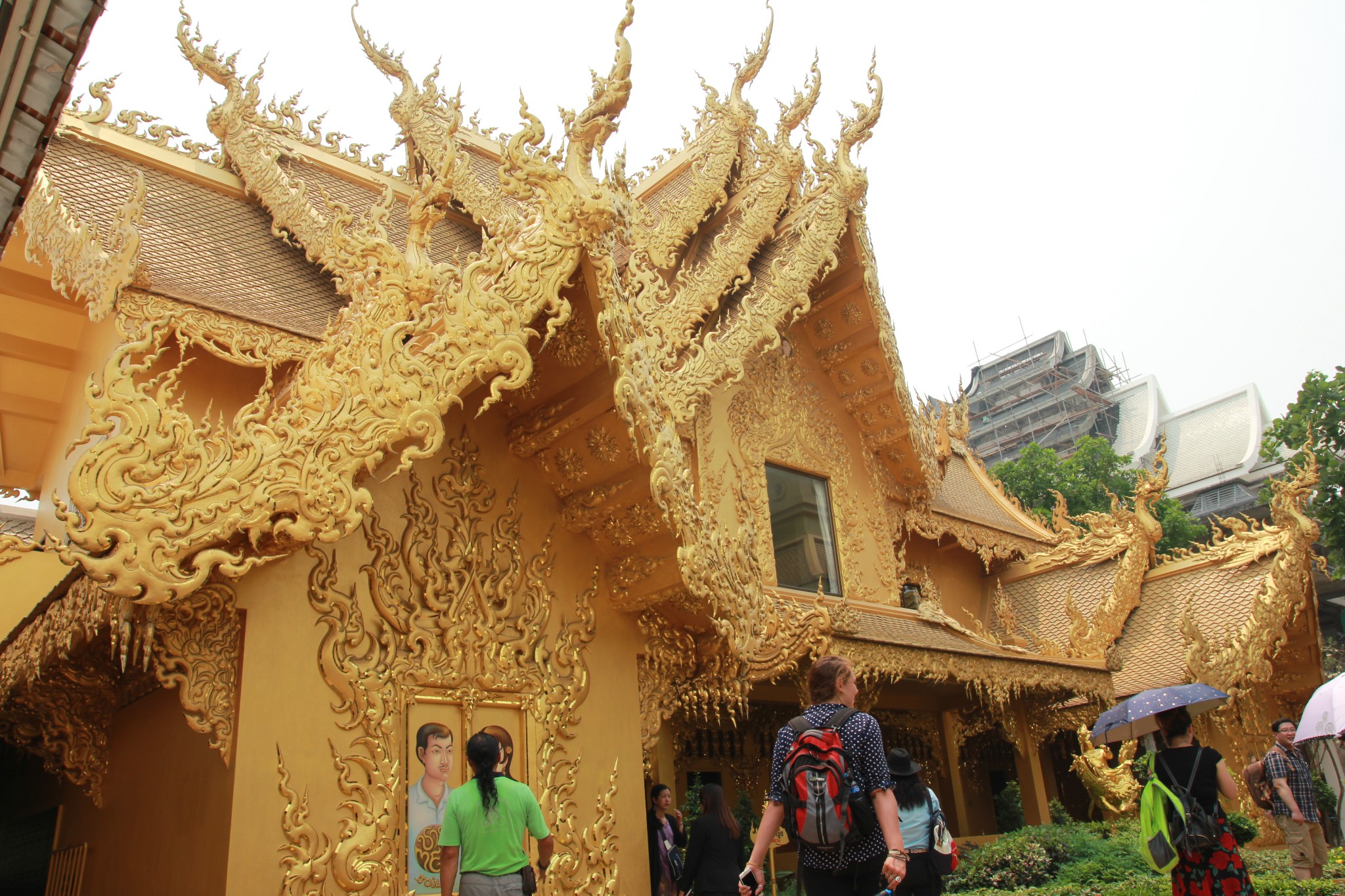 第五:清莱白庙:去白庙的时间不是太好,因为跟团,到点是大中午,阳光直照,又有点多云,所以拍出来的照片不甚满意,同事清莱的白庙也是唯一在清迈跟团去的一个景点,我只能说这里一定一定要来一次,她的美纯白无暇,她的美无法用言语形容,感觉每一寸都是精雕细作,没有一个地方不是费尽人类的极尽思考来完成的,而且刻画出了天堂与地狱的模样,据说白庙还要再建70年才能建完,不过白庙里面真的好普通,外表真的是无可挑剔了,下图中金色的就是传说中的黄金厕所。