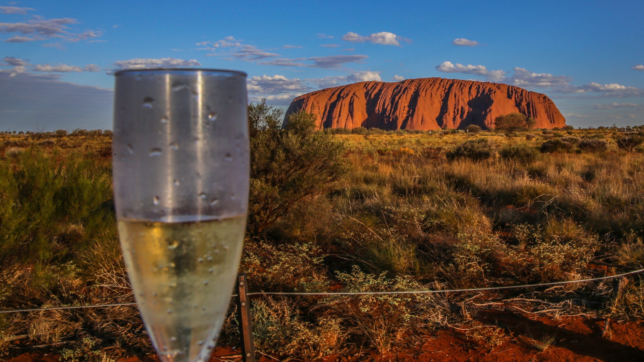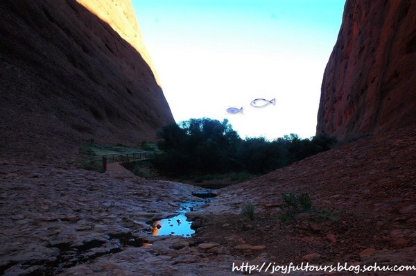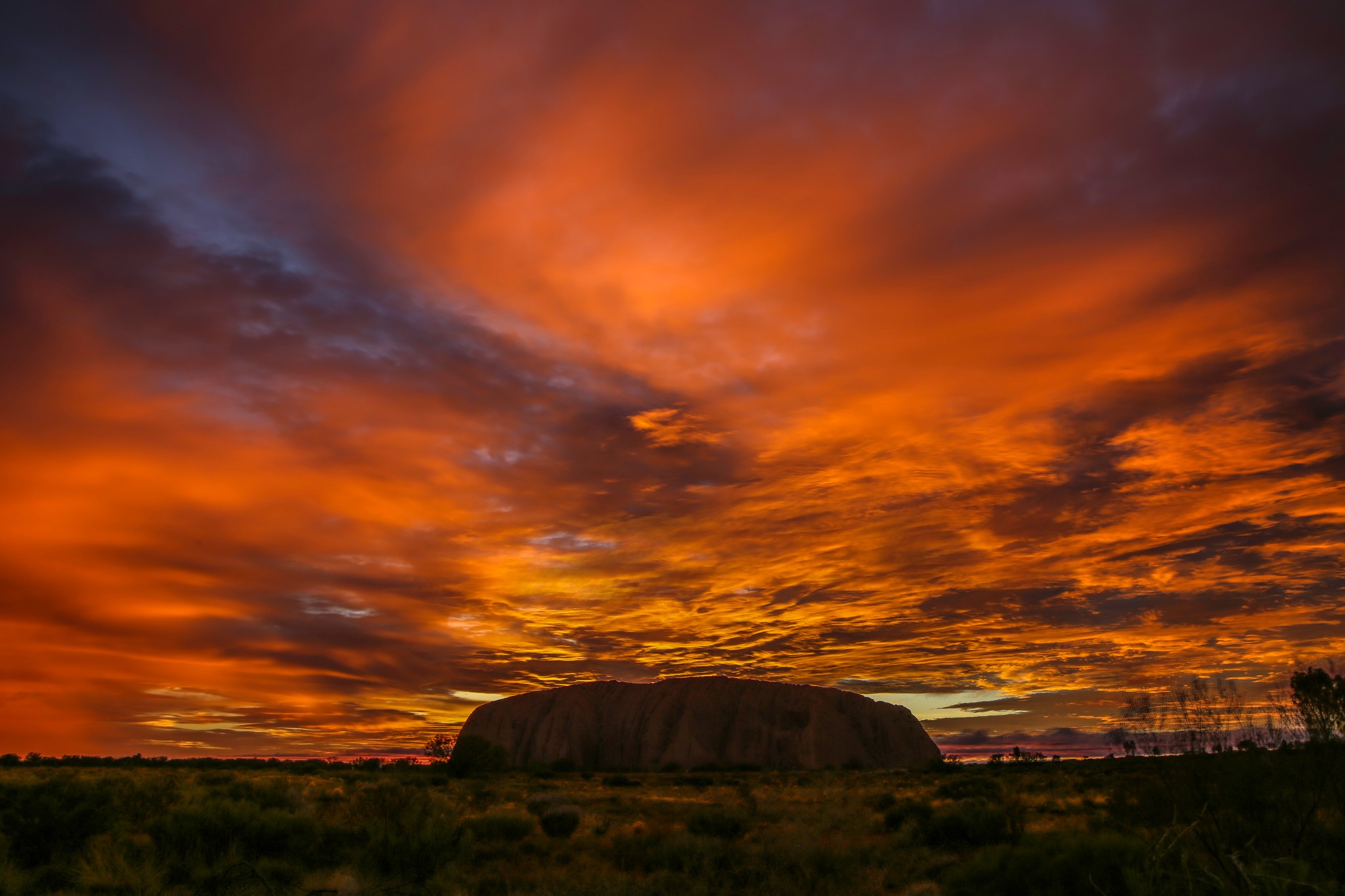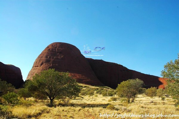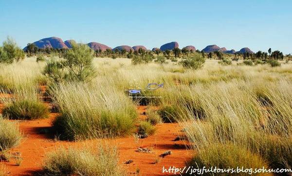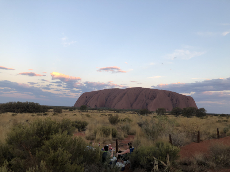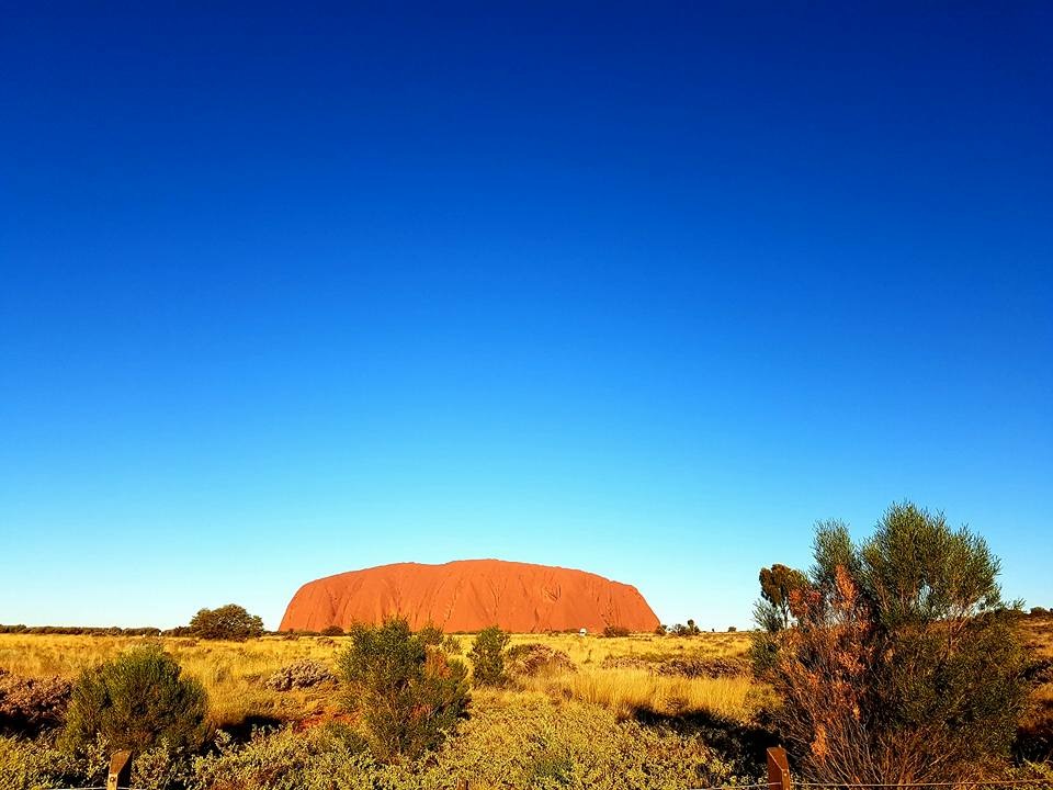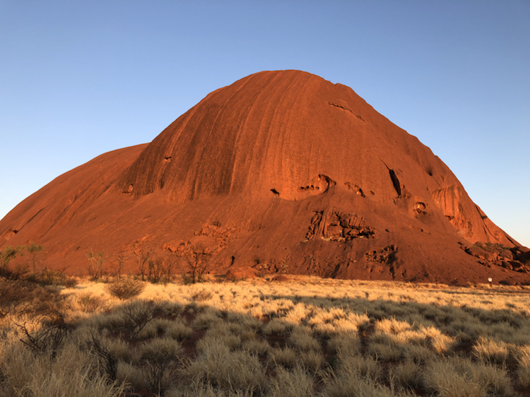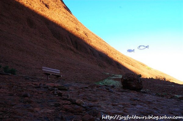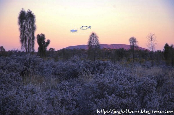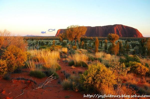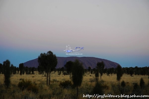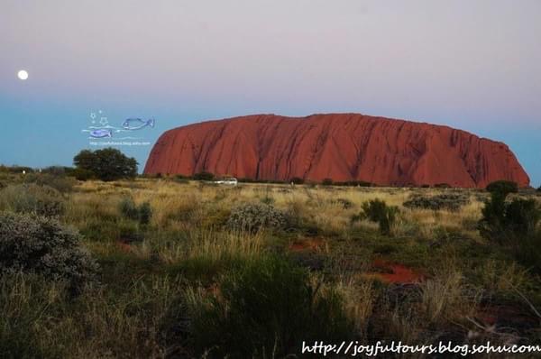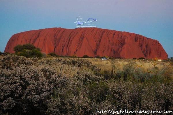 乌鲁鲁在日落时分最惊艳,夕照的照射使它呈现出火焰般的橙红,在周边荒芜的红土地衬托下,显得原始粗犷而又神圣。