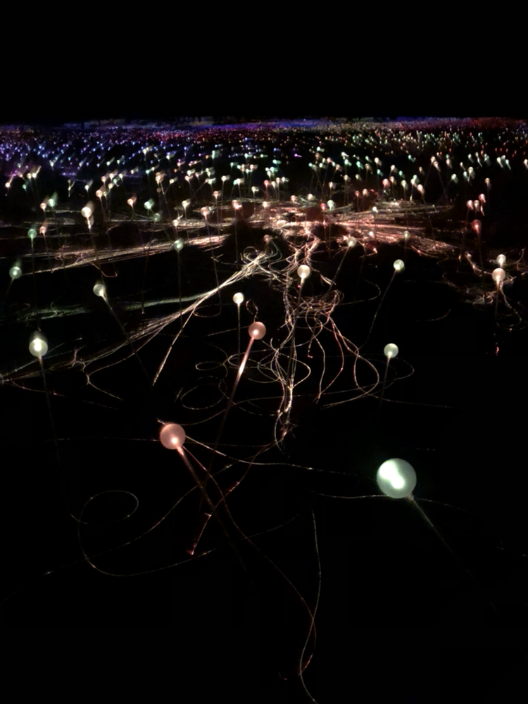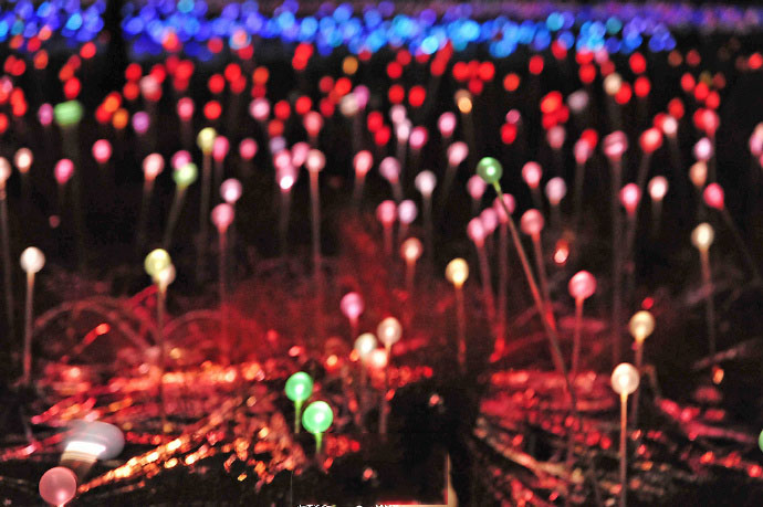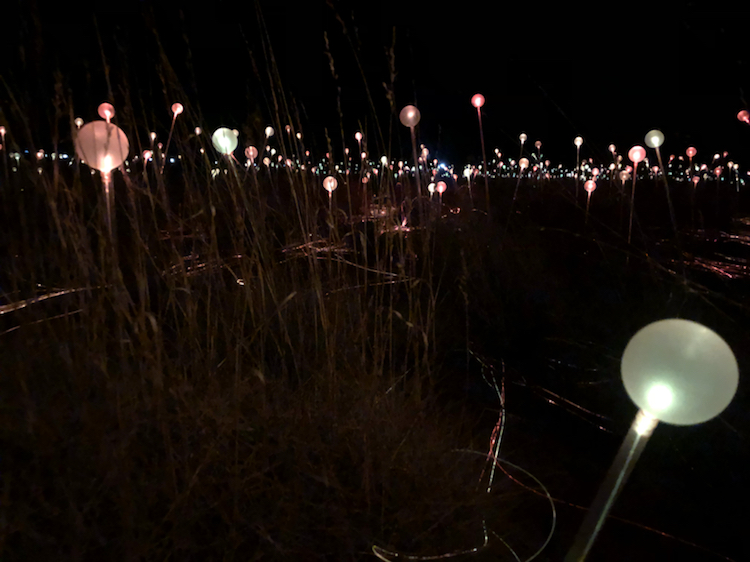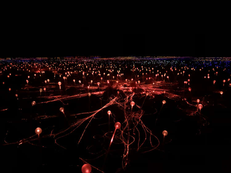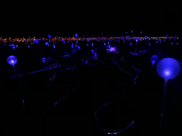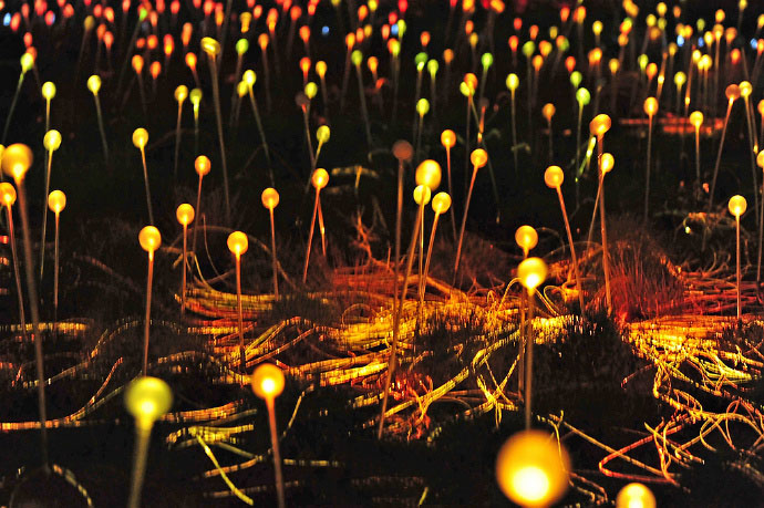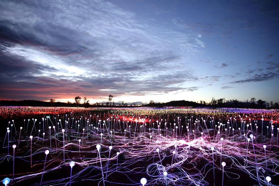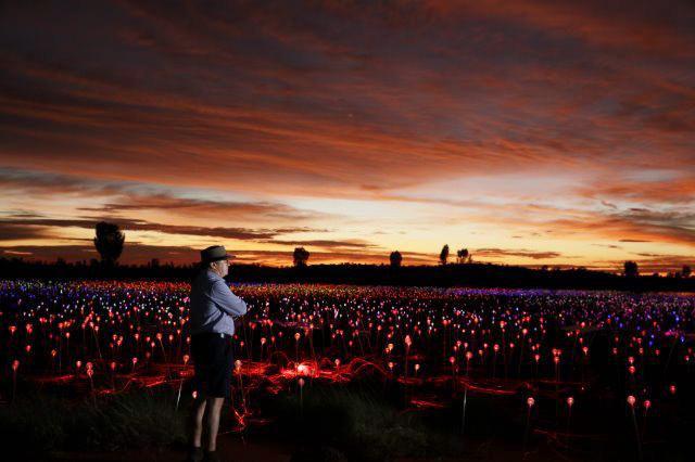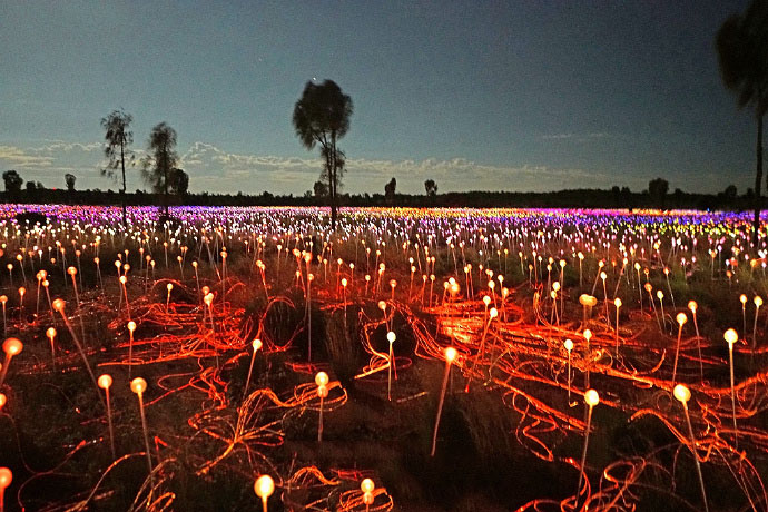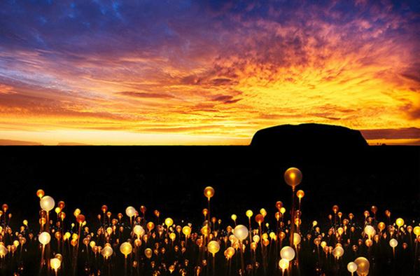 为了与红土中心广阔的地域相适应,Bruce Munro和他的团队安装了50000多个覆盖着磨砂玻璃球体的发光的管子,规模足有4个足球场那么大!