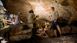 参观诺兰基岩(Nourlangie Rock),一个阿纳姆地区悬崖(Arnhem Land Escarpment)边缘的岩层,观看当年化身为短耳岩袋鼠的梦幻时光(Dreamtime)祖先们刻下的岩缝,这些裂缝至今仍清晰可见,而岩袋鼠们则通常会在清晨和黄昏时出没。附近的Anbangang艺术馆展示着一幅闪电人( Lightning Man)的画像,这位梦幻时光的祖先依然掌控着每个雨季狂暴的闪电雷雨。著名艺术家Najombolmi于1960年代在不远处的Nanguluwu创作了一幅梦幻时光精灵米米(Mimi)的岩画,画像上的人物正在投掷一支长矛。此外,还有描绘欧洲殖民者到来的画像 —— 包括一艘带着锚链的双桅船,船后还拖拉着一个小舢板。