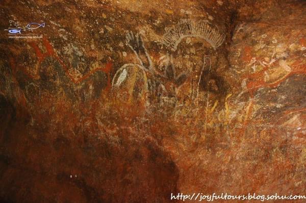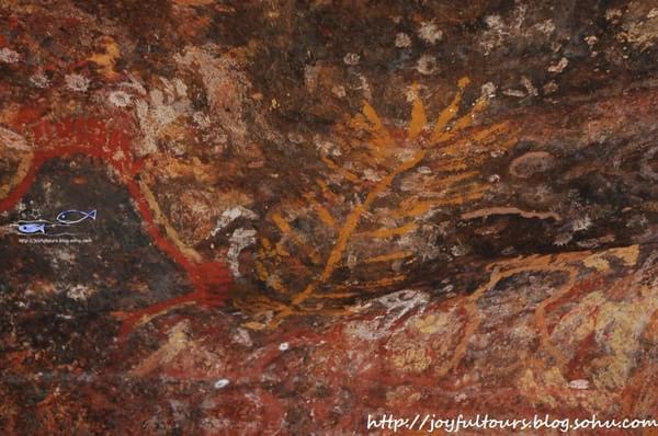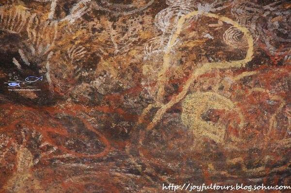 艺术馆不远处就是Namarrgarn姐妹的岩画 —— 一对生活在星星上的狡猾神灵,她们只要轻挥一条绳索就能让人生病。邻近另一处地点则是已有23,000多年历史的彩虹蛇(Rainbow Serpent),当地的Gagudju 部落将这位于平静之中蕴藏着强大力量的“女王”称为Garranga’rrelito。
