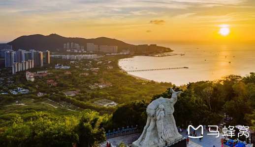 图:观景台上的“小鹿”。听说还有猴子出没呢!鹿回头屹立在五岭之巅,扬名于山顶白鹿雕塑背后的黎族爱情传说,是本地人常去光顾的市民公园。因其高地势和三面朝海的特征,它现在更是游人登高望远、拍摄日出日落、以及饱览市全景的好去处;尤其是夜色降临,当凤凰岛上5座帆船型建筑变身为璀璨的光幕,从观景台远眺,是一场真正的视觉盛宴。想要将和市区的夜景尽收眼底,非鹿回头山顶公园莫属。建议大家早些去北亭观景台,找一个树丛相对稀疏、视野开阔的地方等待落日。