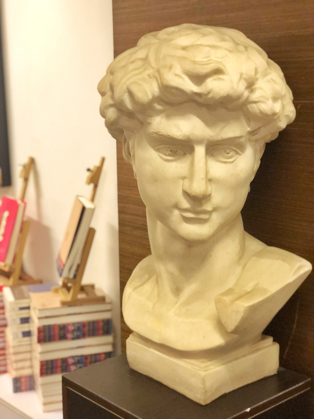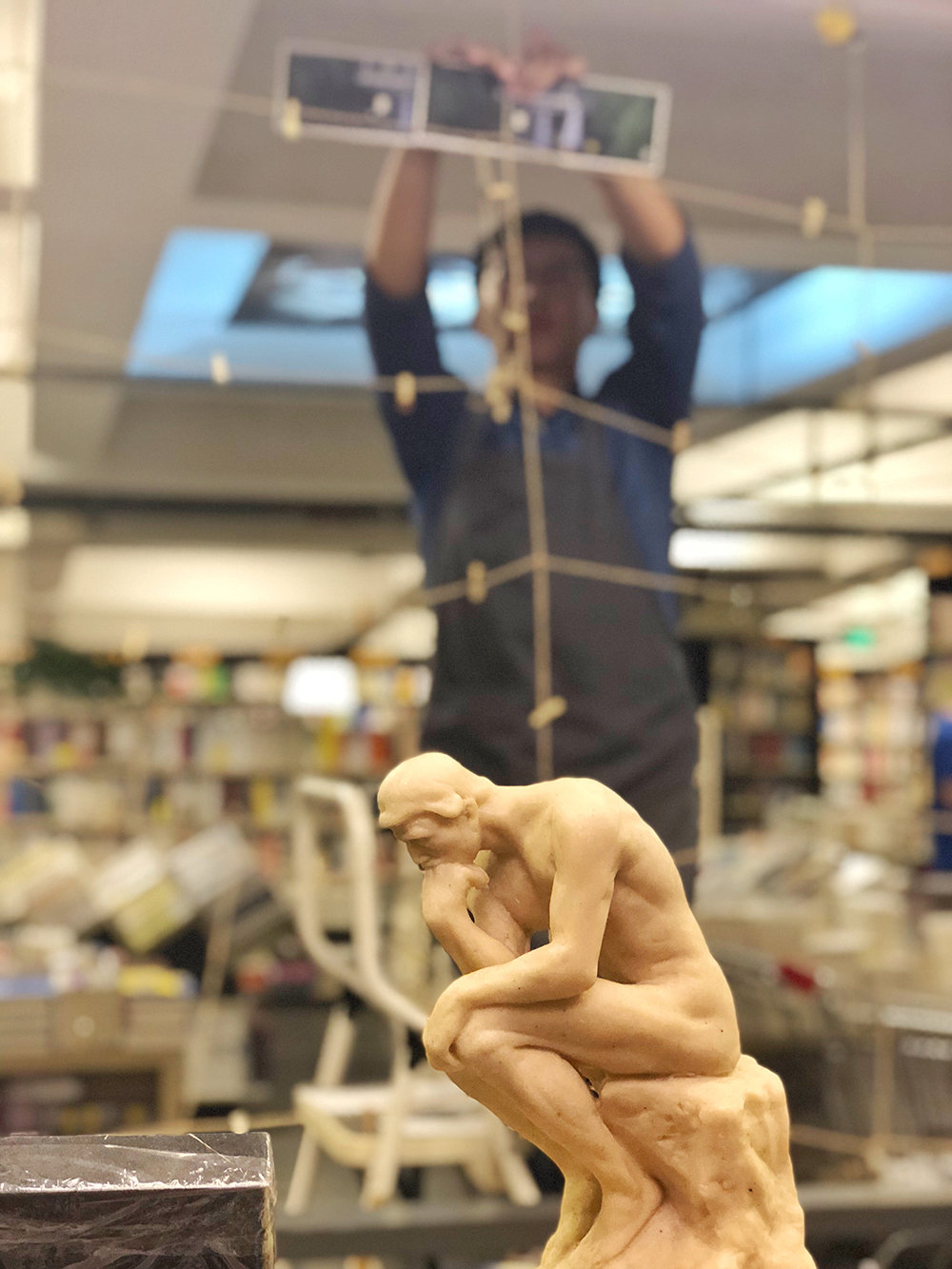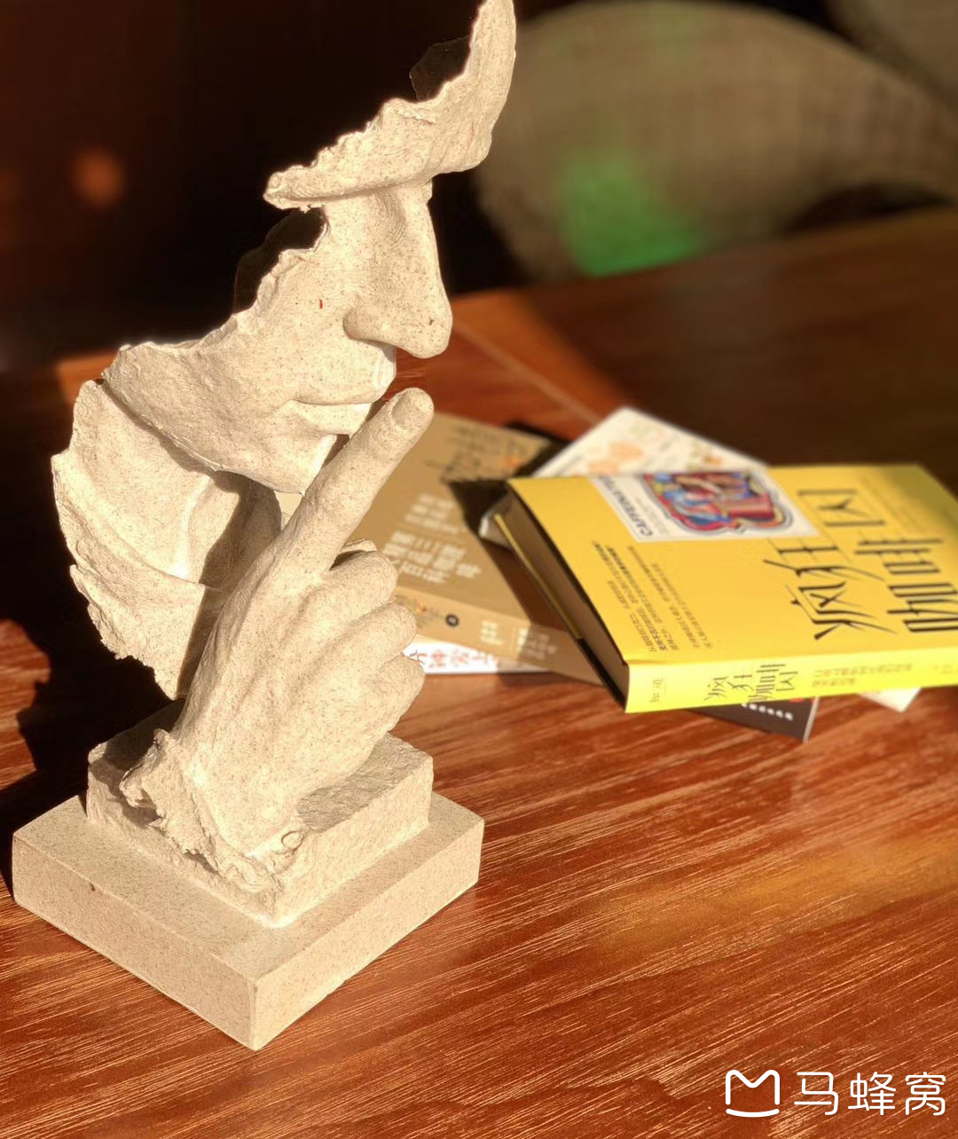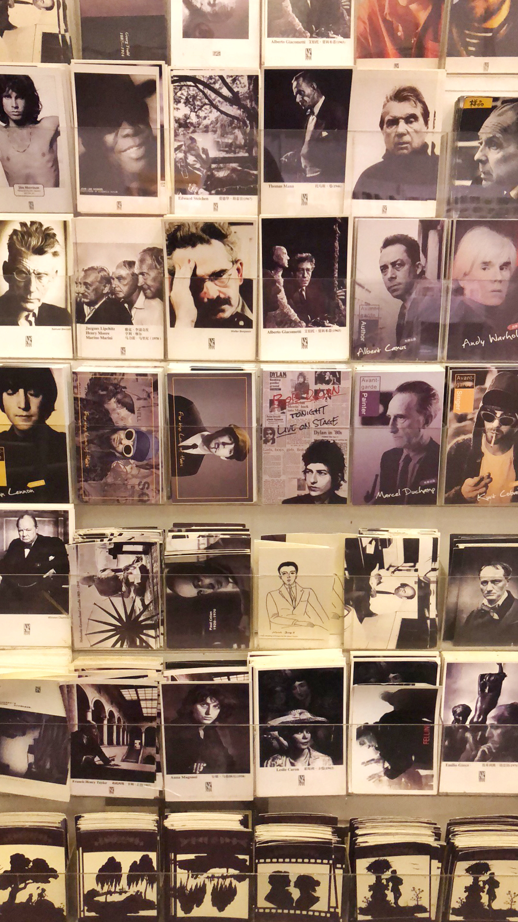 先锋书店楼上相对热闹些,有很多很多的石膏头像摆件,有让人歇脚的咖啡吧,远处的小哥哥在挂网上挂着什么,走近一看原来是写满话语的明信片。
