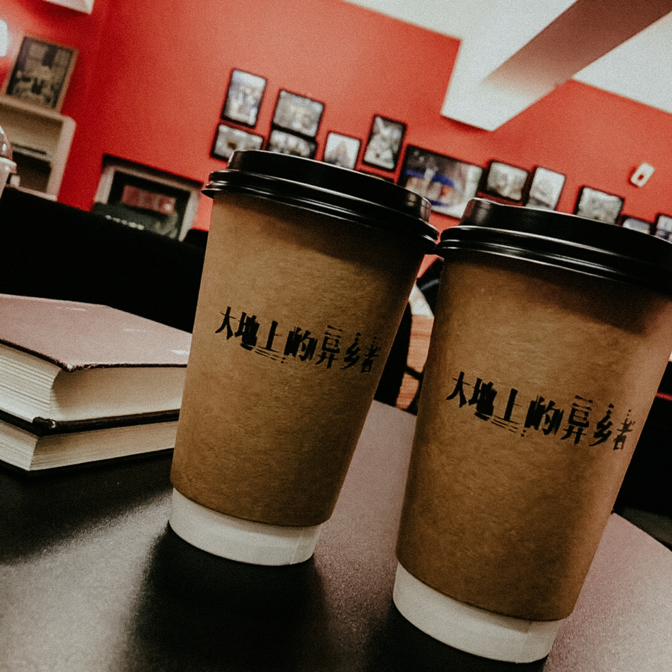 点了一杯热巧,喜欢杯子上的这句话——“大地上的异乡者”。