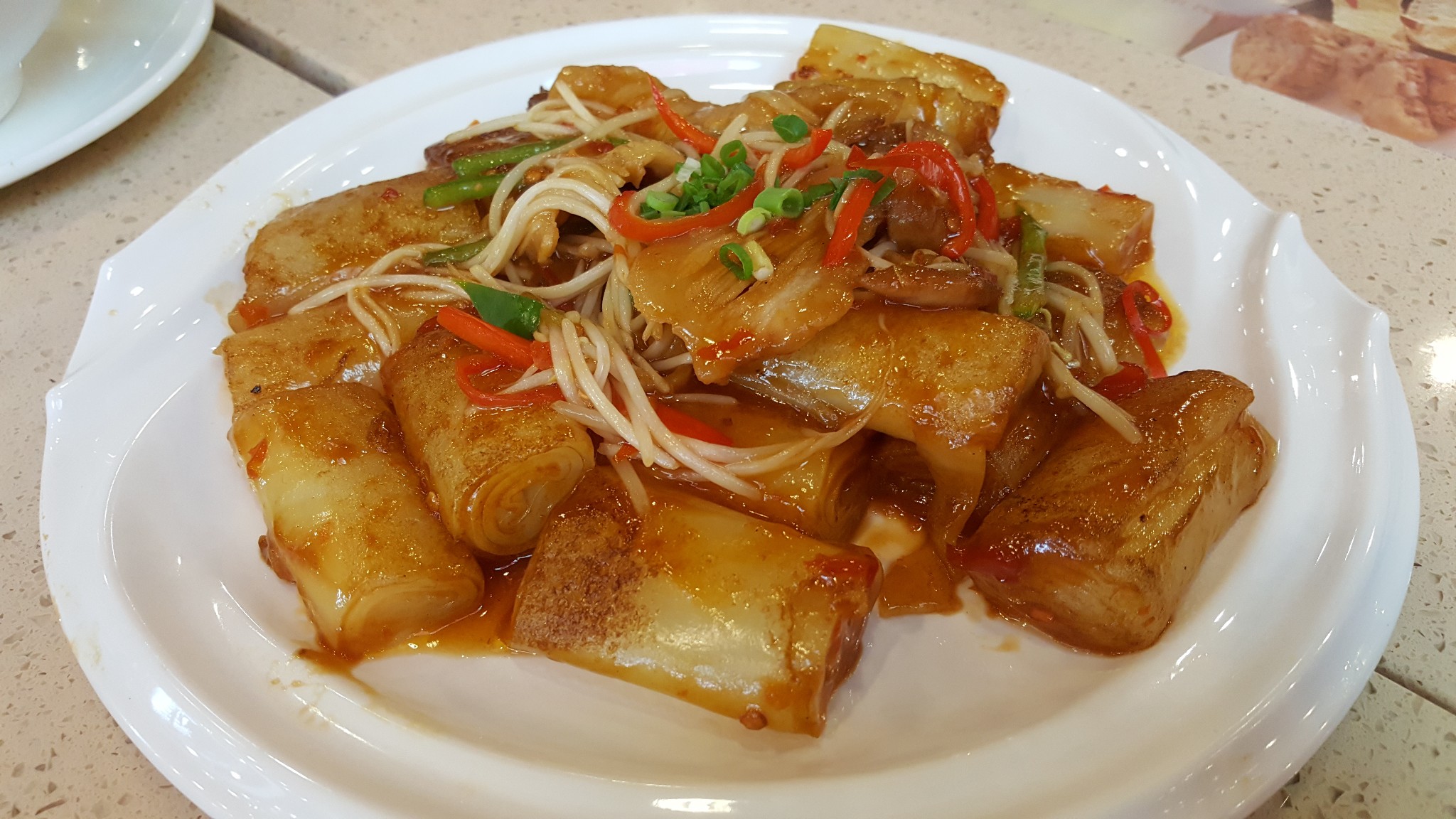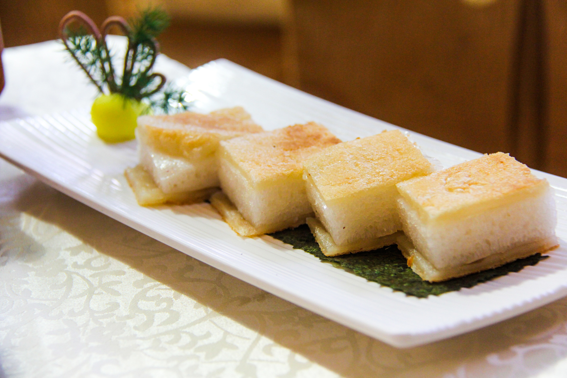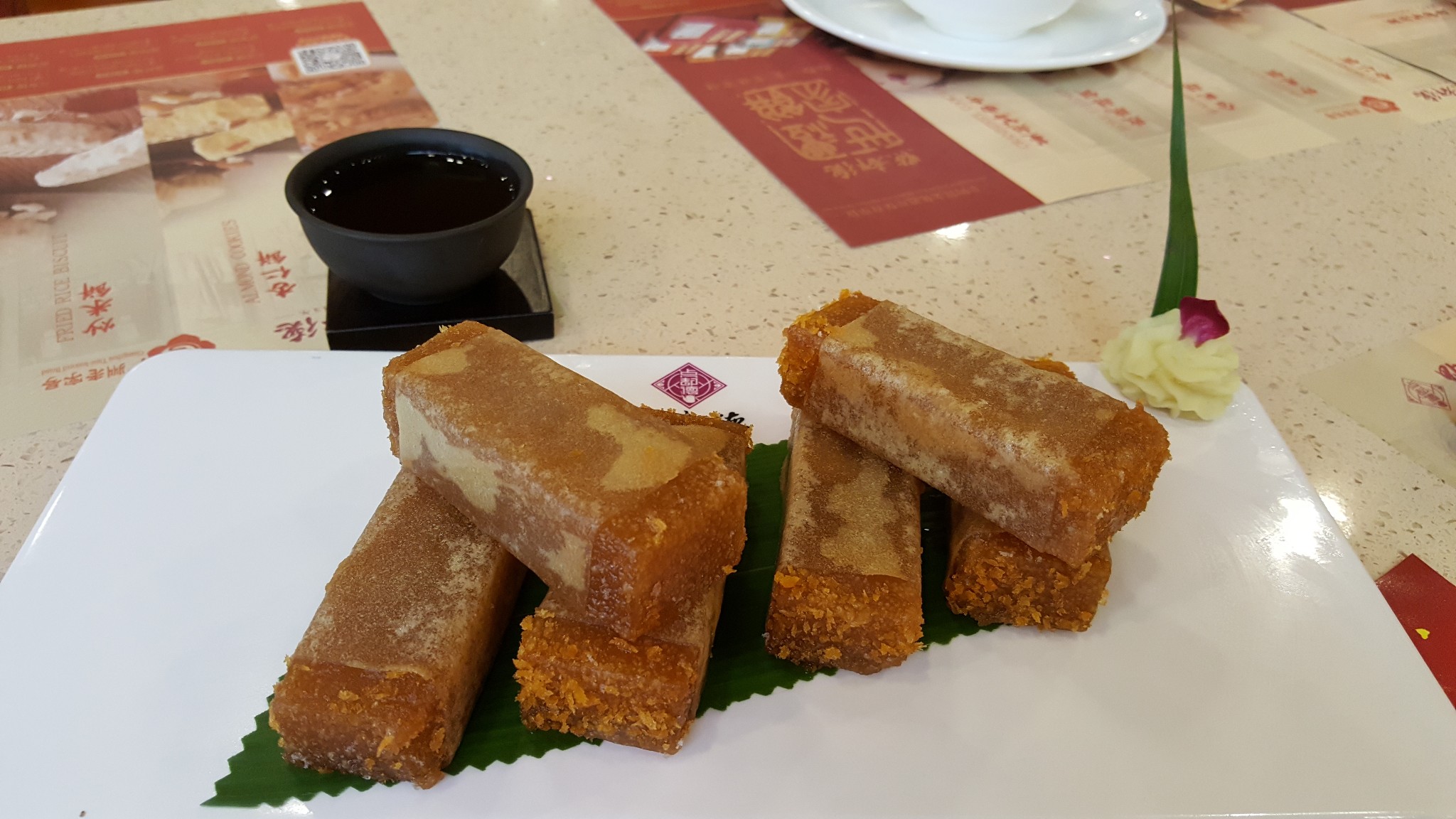 萝卜糕,有萝卜味,腊肉够香,粉和萝卜比例刚刚好,吃的时候一定要蘸上辣椒酱。如果煎的时间长一点就更好,我更喜欢外面脆脆的感觉。