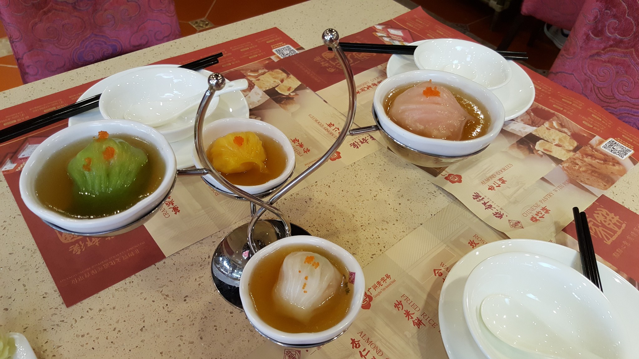 颜值更高的是四色虾饺,四个小锺,颜色各有不同,像极了春夏秋冬,里面的点心精致而小巧,皮吹弹可破,里面的馅料似乎随时满溢而出。