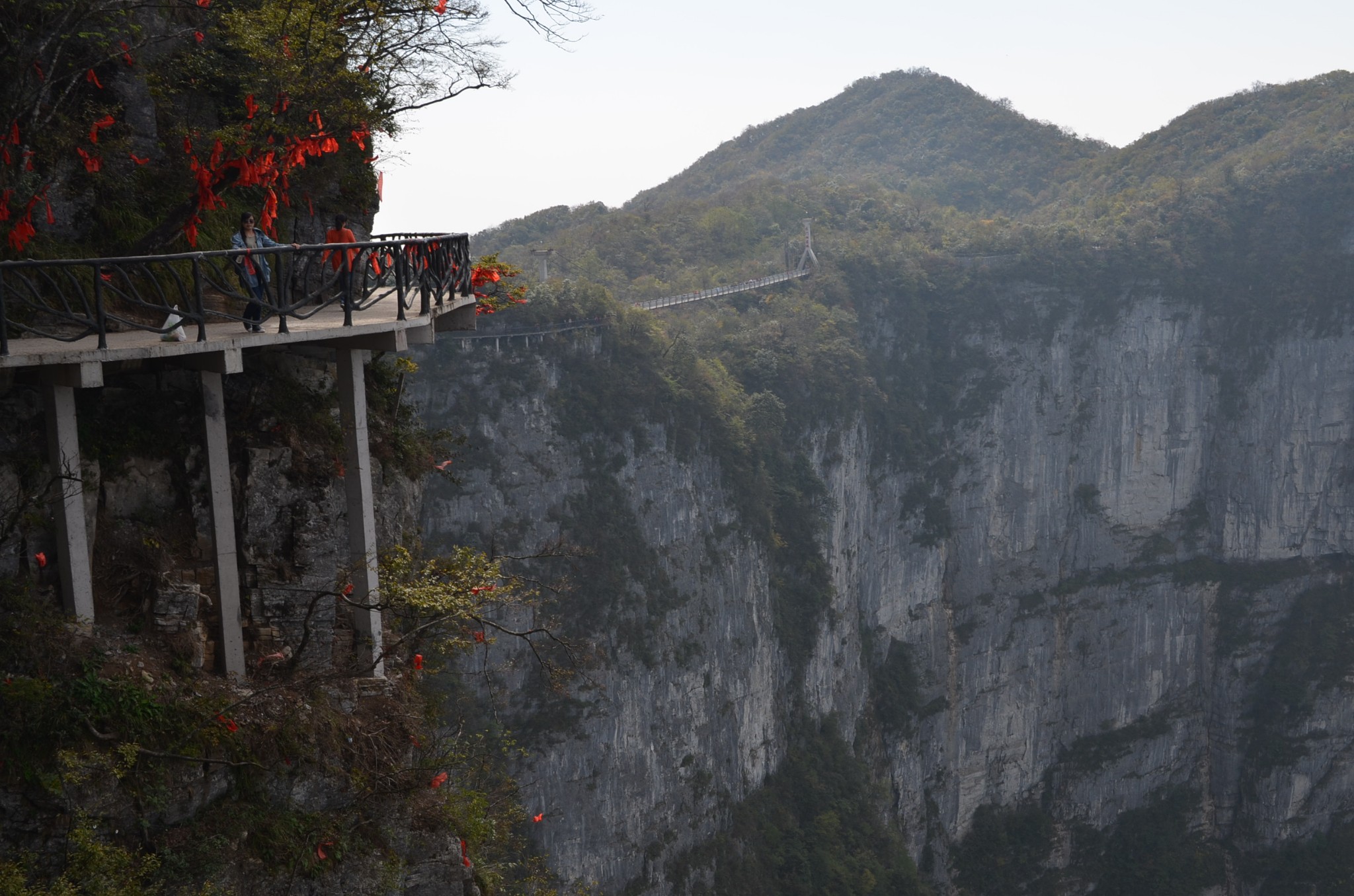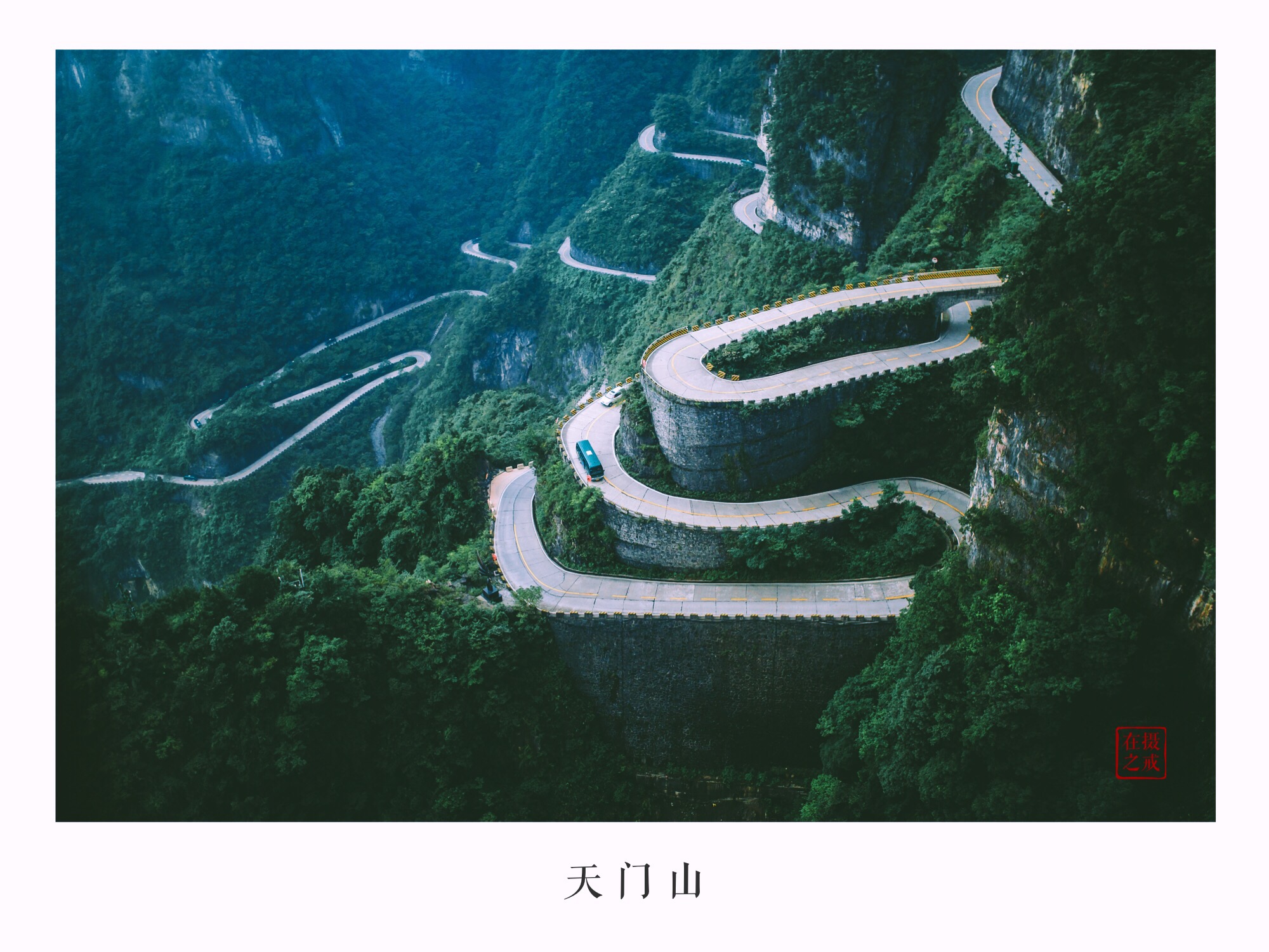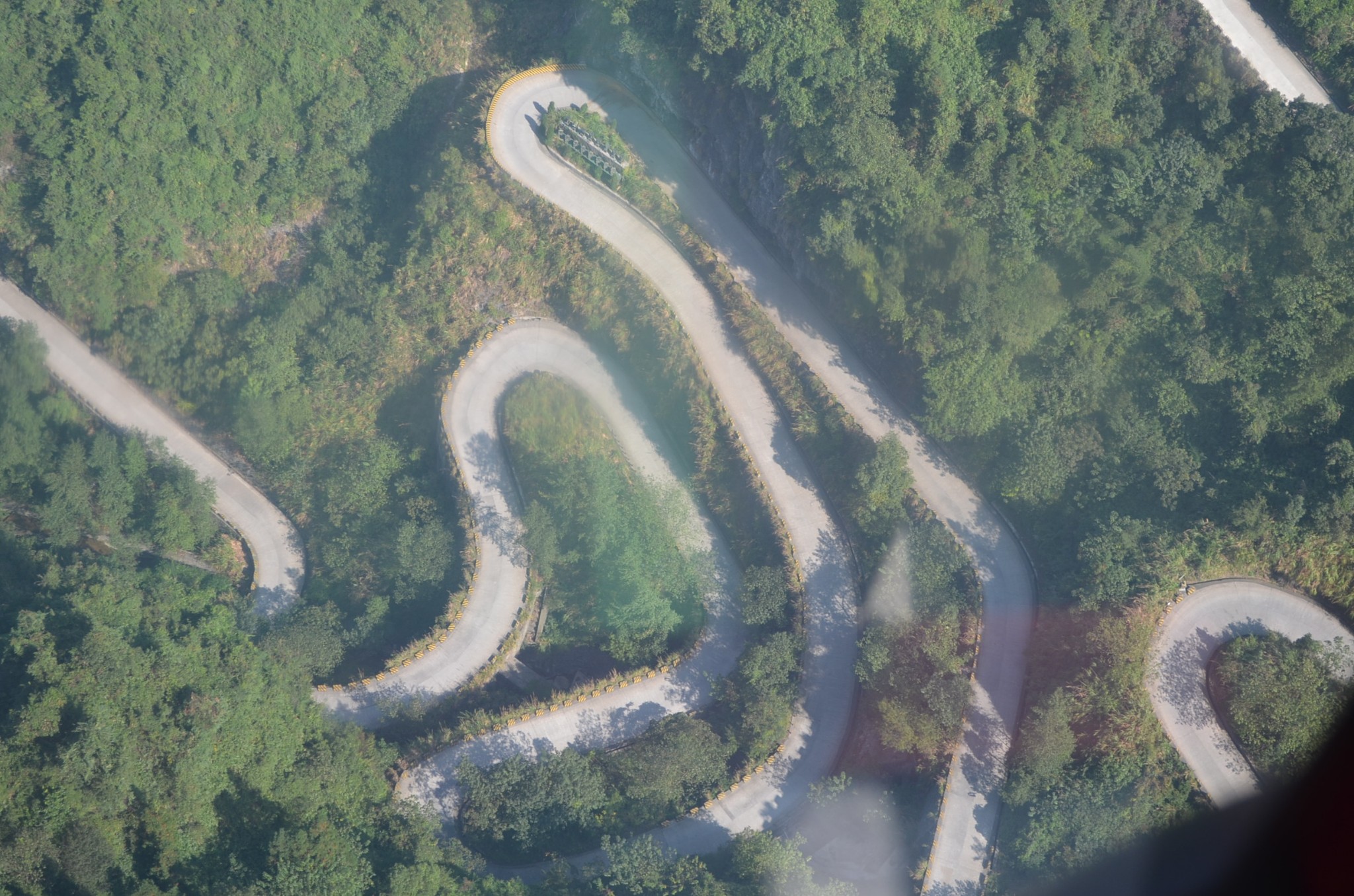 索道上的风景还是很赞的。左手能看到天门山的亮点之一,号称通天大道的盘山公路。通天大道全长近11公里,海拔从200米急速上升到1300米,全部共有99道拐。号称老子天下第一是有点夸张,不过也算得上个不小的奇迹了。为此还有不怕死的法国人到这儿玩了把轮滑;还举办漂移挑战赛,反正就是怎么刺激怎么玩儿。