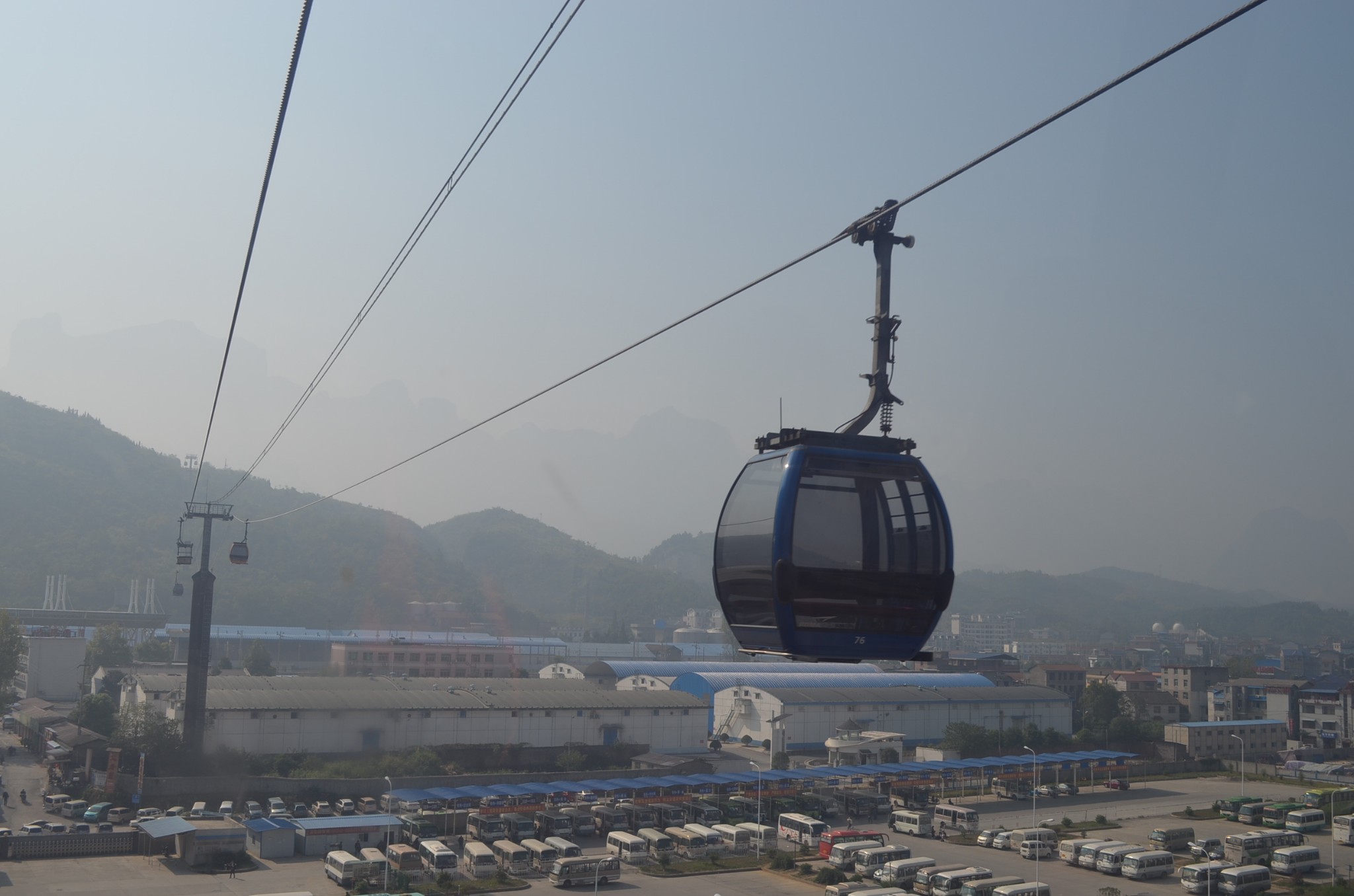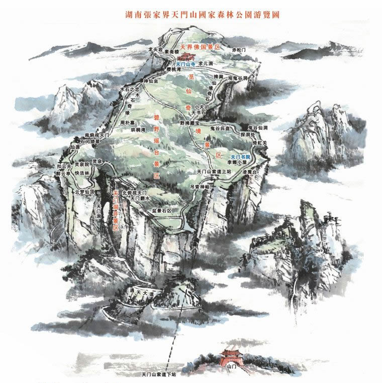 天门山索道·索道全长7454米,高差1277米,是世界最长的高山观光客运索道,单程运行时间约28分钟。 ·其中站到上站之间的局部斜度更高达37度,世界罕见,是国内局部斜度最大的索道,同时也是支架最多的索道。 ·索道共有轿厢98个,索道支架57个(含3个救护支架),全部采用欧洲原装进口设备。 ·以