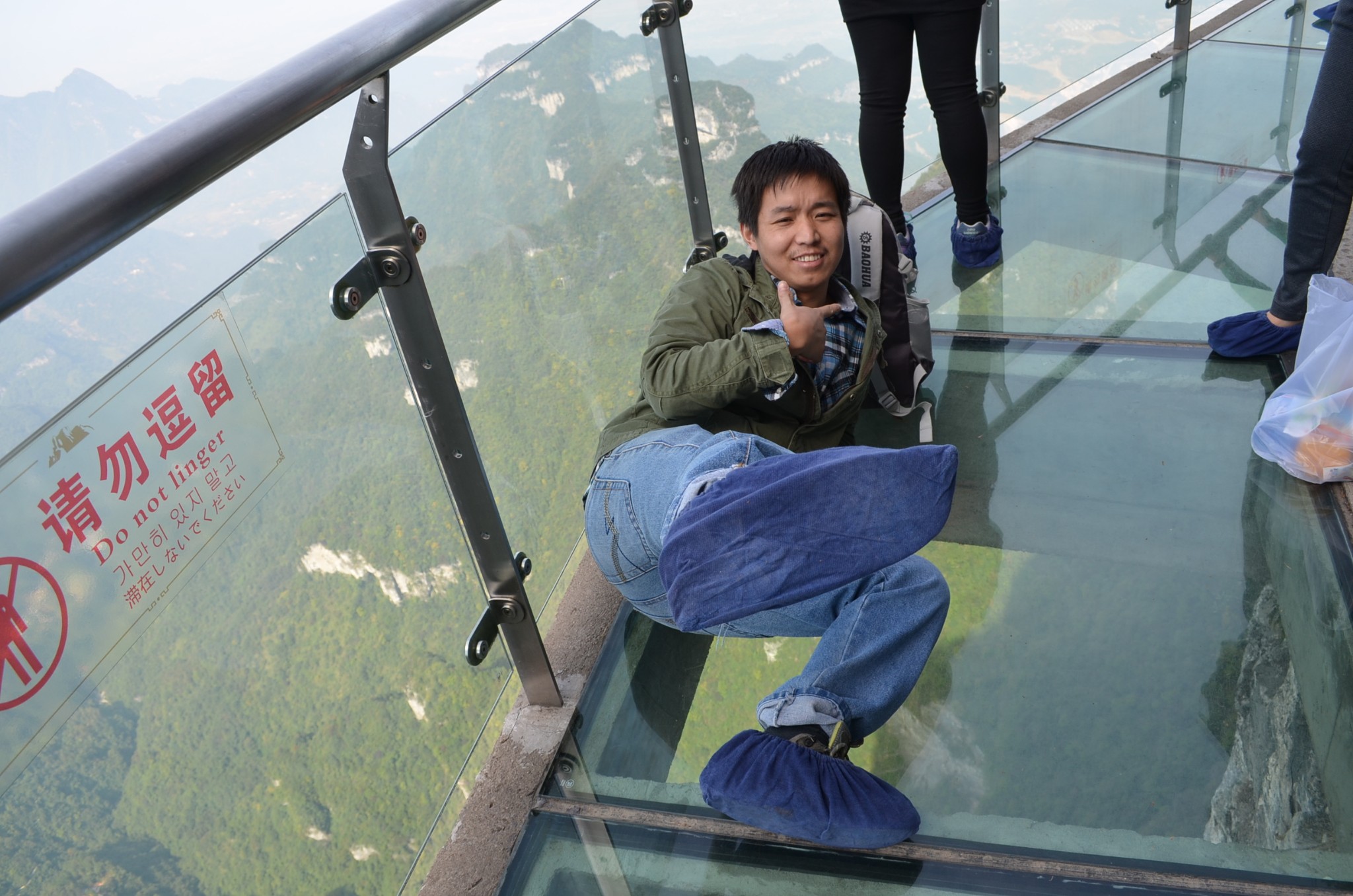 玻璃栈道来天门山不得不提下玻璃栈道,其实现在天门山有三段玻璃栈道。东西线各有一段,今年又开放了一段盘龙崖玻璃栈道。东西线的玻璃栈道各长60米,盘龙栈道长100米,在盘龙栈道上可以俯瞰通天大道的99道拐。上玻璃栈道需要交5块钱的鞋套费。