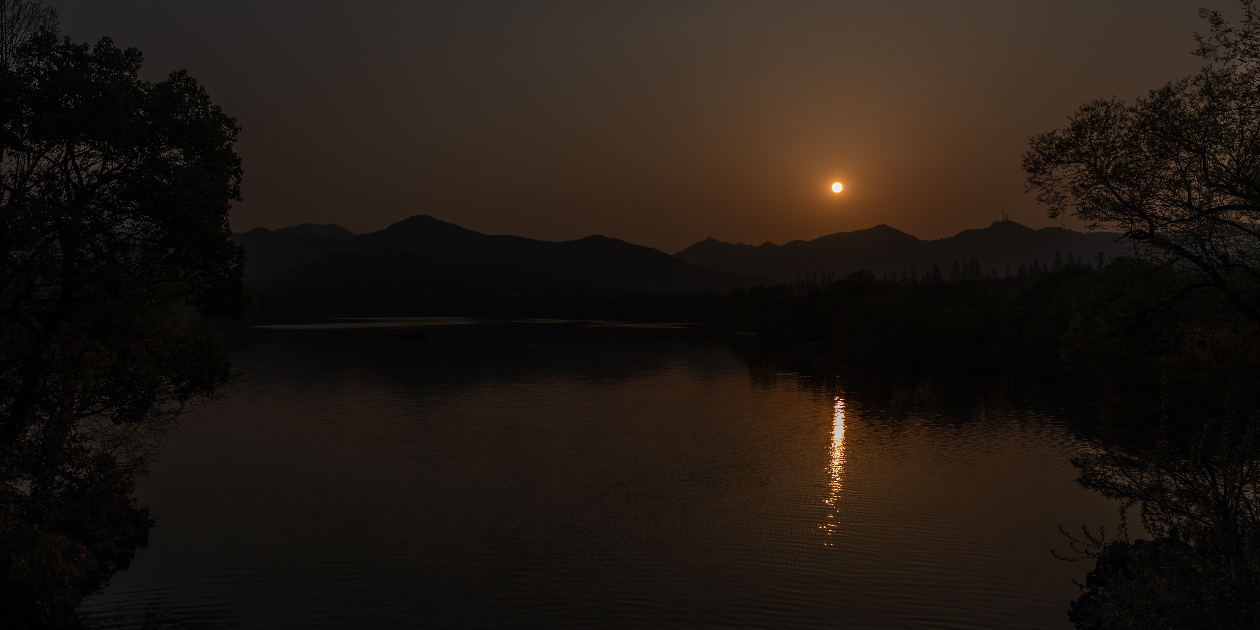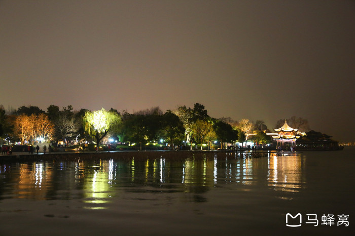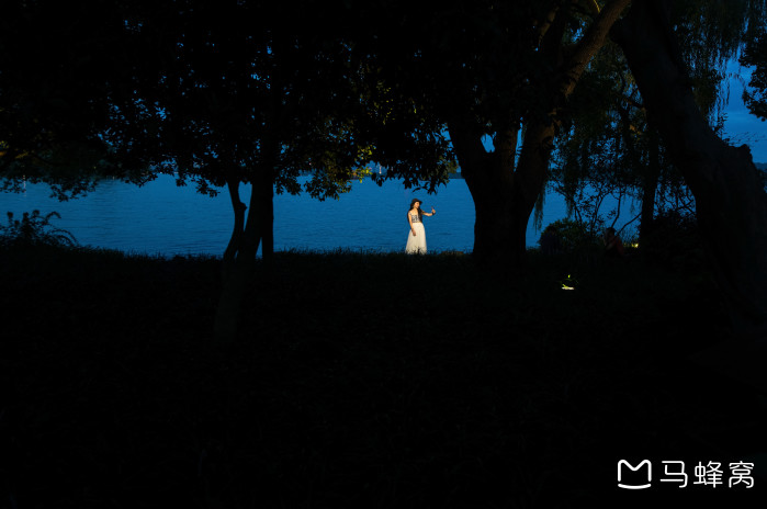 拍过晚霞之后,反过身来面向西湖、城区方向可以看见苏堤的浓荫之下,湖对岸满城灯火,也是一种绝美的夜景。