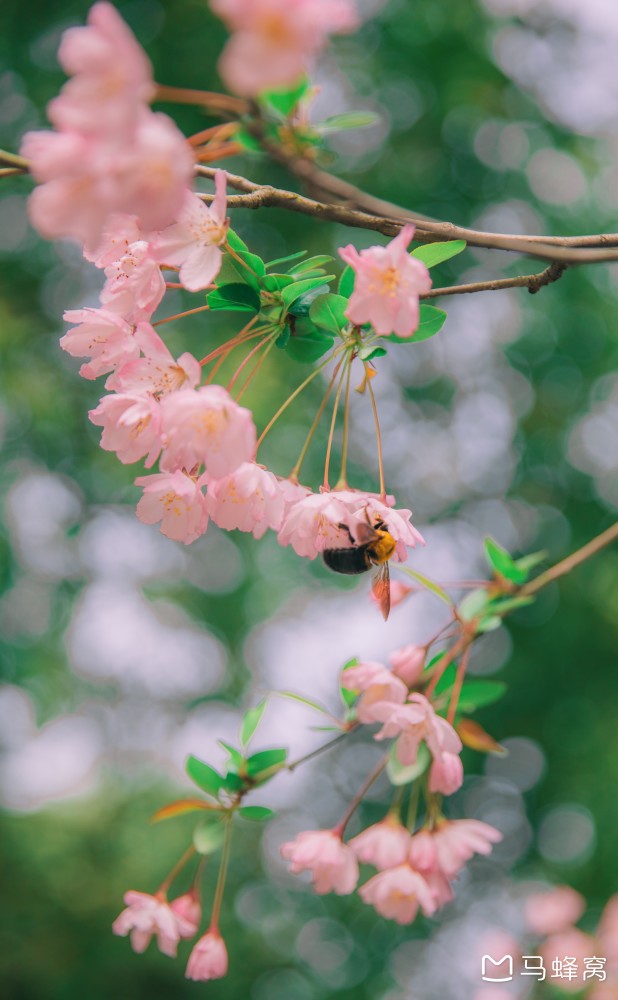 从太子湾公园北门出来,走进对面的杨公提道路,一直向前,就来到了浴鹄湾。公路旁开满了樱花,因为是小景点,人群很少,没有太子湾那样人潮如流。看见一只蜜蜂,正在辛勤的工作,这段时间的花粉,够它辛苦一阵子,才能好好休息。