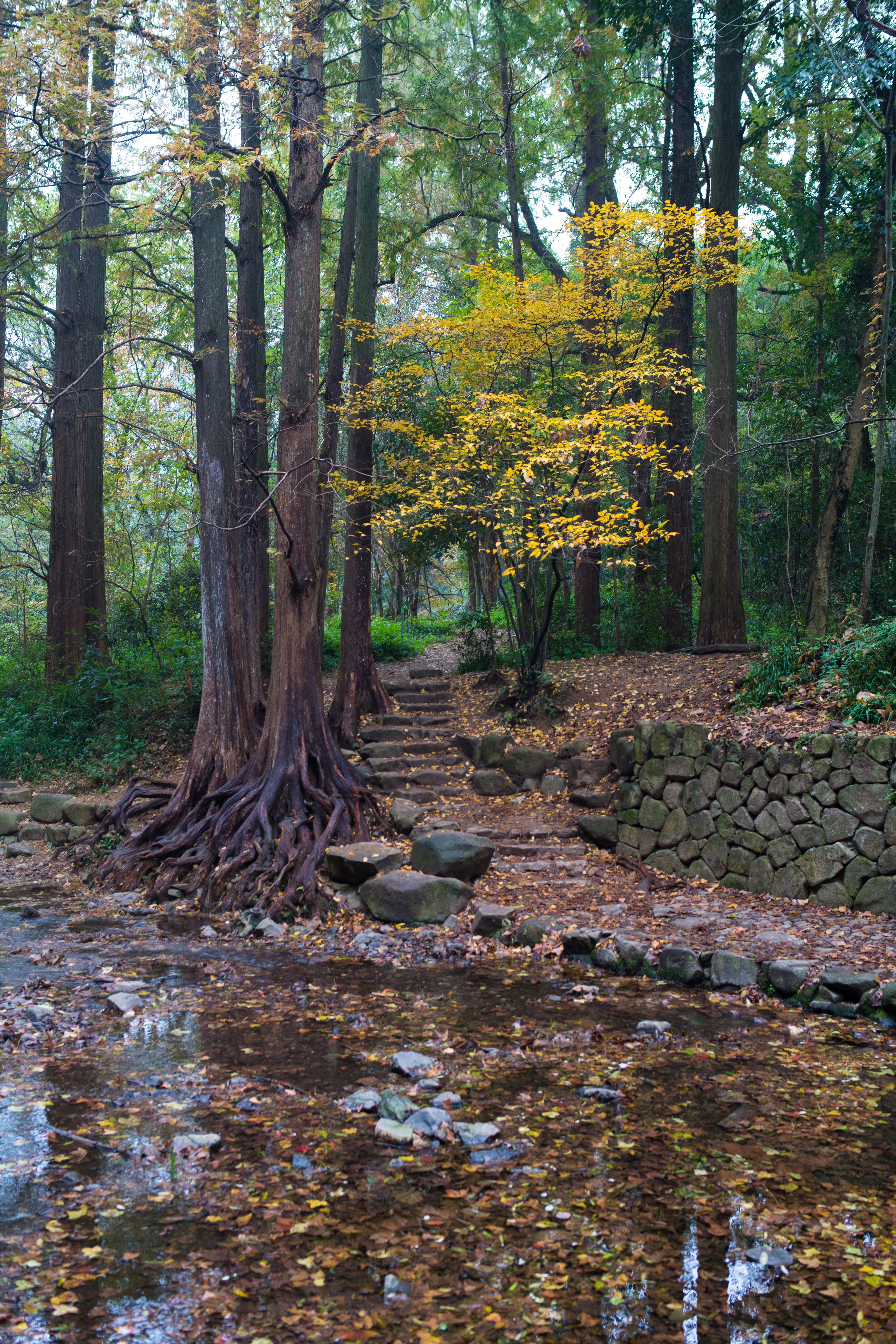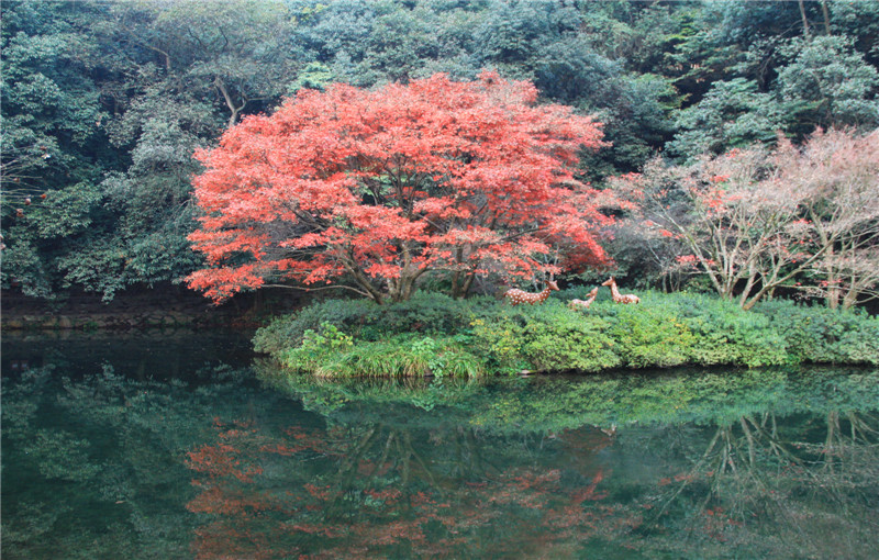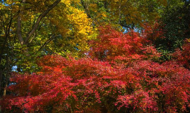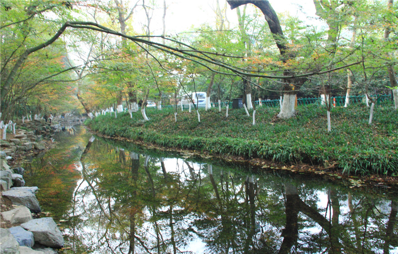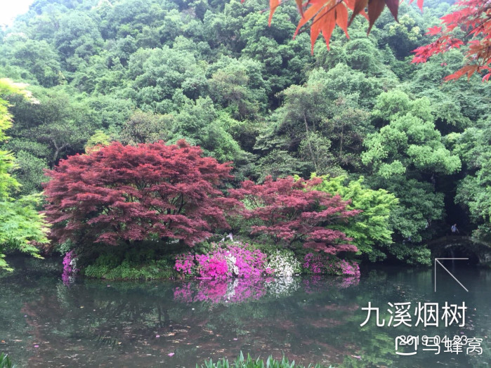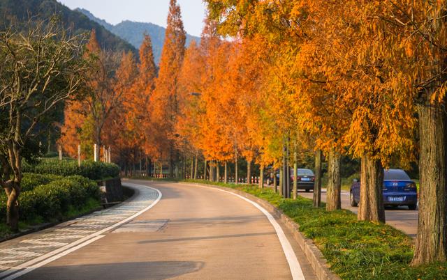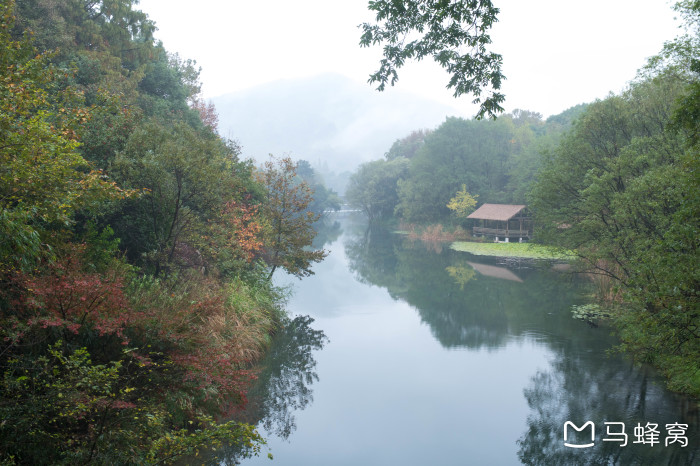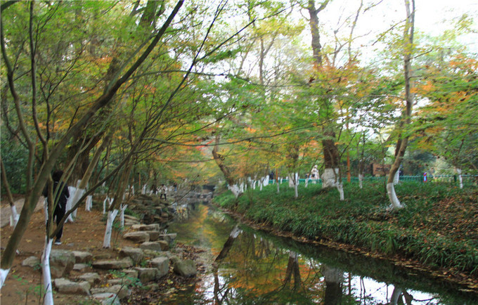 九溪十八涧,顾名思义,便是在一条古道上,需要步行跋涉,穿越多条自然形成的山溪,这些溪流水量不大,但十分清澈,道路也都是碎石子和鹅卵石等必然条件下的步道,完全没有用机械化手段铺就,充满了野趣。尤其是每到秋季,这条从龙井村,穿越九溪十八涧,直达九溪烟树,再到钱塘江边上的古道,红叶烂漫,法国梧桐、水杉、鸡爪槭、枫香等多种秋叶,将这条路渲染成一个红叶秘境。