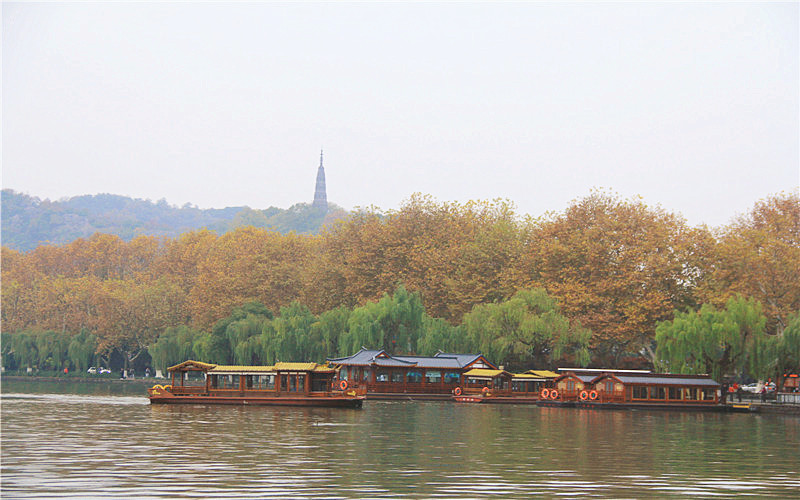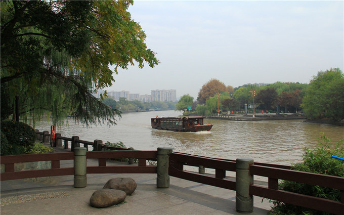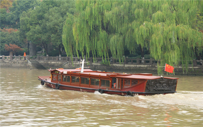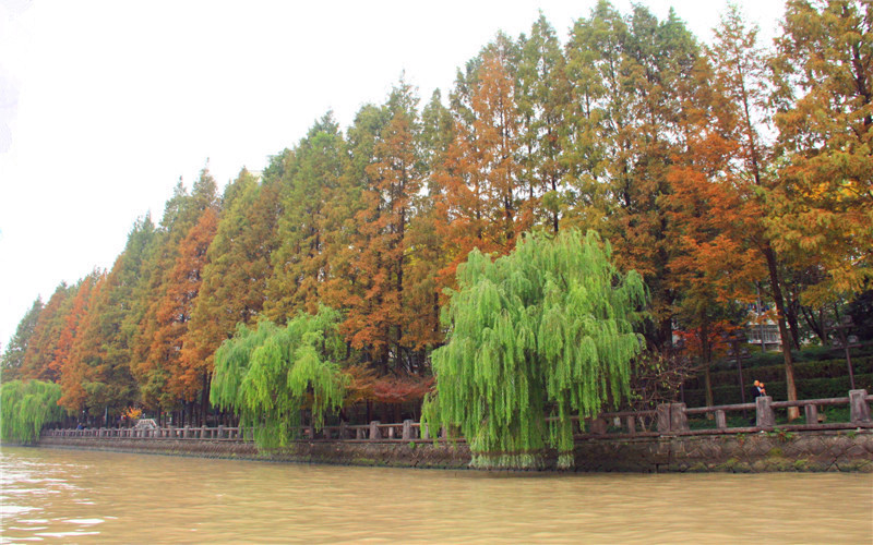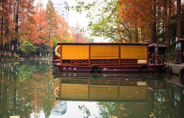 这段路并不长,如果走的急,公交、滴滴,都能够很快到达。但是这条名字听起来有些媚俗的水上路线,却承载了许多人多秋天的美好幻想。船不大,不是周末的话,经常一班船都坐不满人。这种船在并不难见到,毕竟是以一个山水文明的城市,西湖有很多,不奇怪,但在这里,独特成为了风景。船缓缓驶动,两岸的松柏垂柳也随之变化。深秋,你看树还是泛绿的,可是河水里漂浮的黄叶,零零星星,优哉游哉。天要是再冷一些,这些落叶就要变成突如其来的工作量了,人们要去打捞,以此来保持河道的清洁。秋意浓,最忆是。当然的秋色并不仅限于此,只有亲身来经历过之后,才能感受到置身其中的,天凉好个秋。