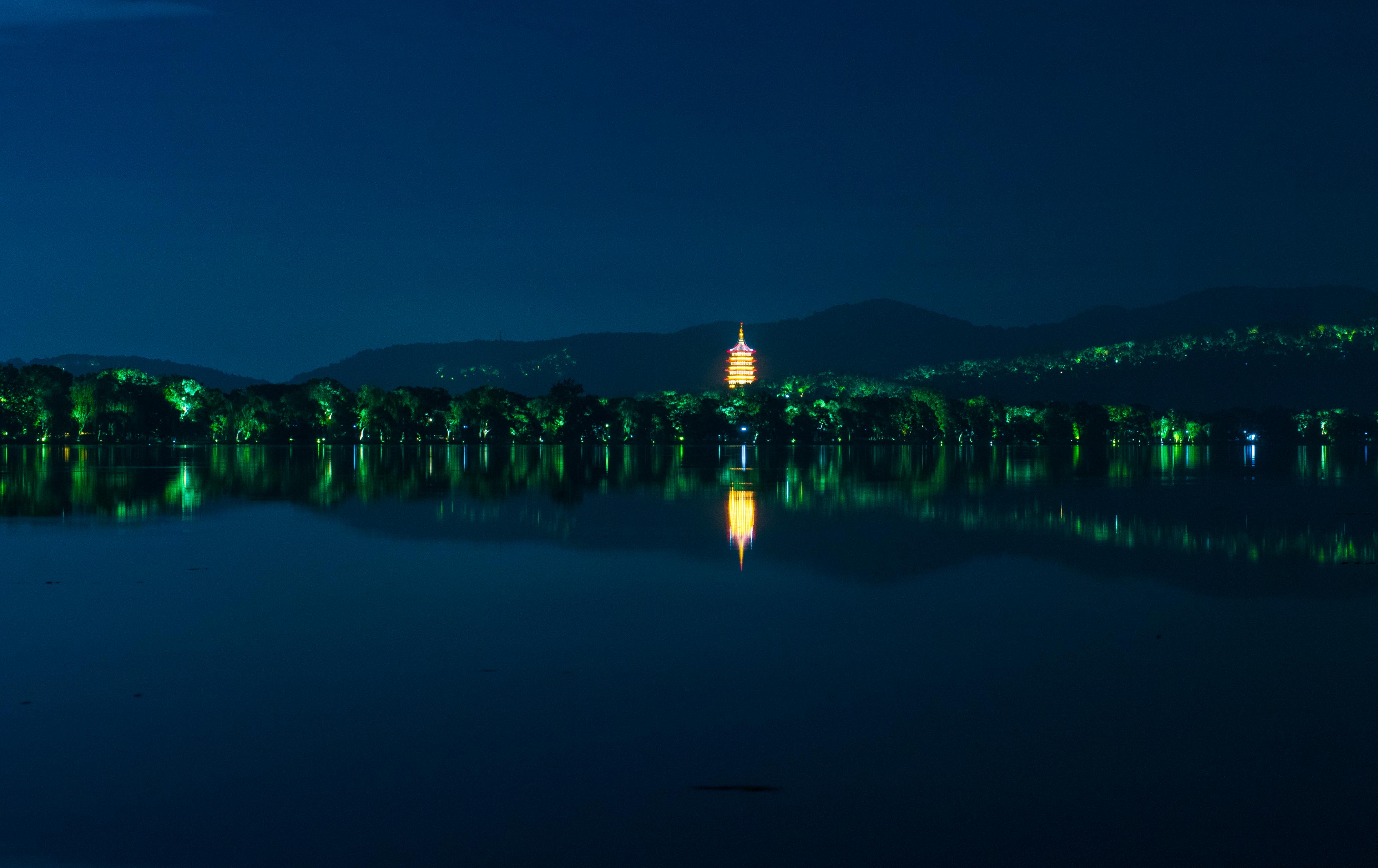 夜幕下的雷峰塔,与周围的西湖山水相映衬,构成一幅青绿山水的意境,夜幕过滤掉了白天雷峰塔及周边的人流,显得澄净安宁,更像是《白蛇传》里面那种仙气飘飘的场景。