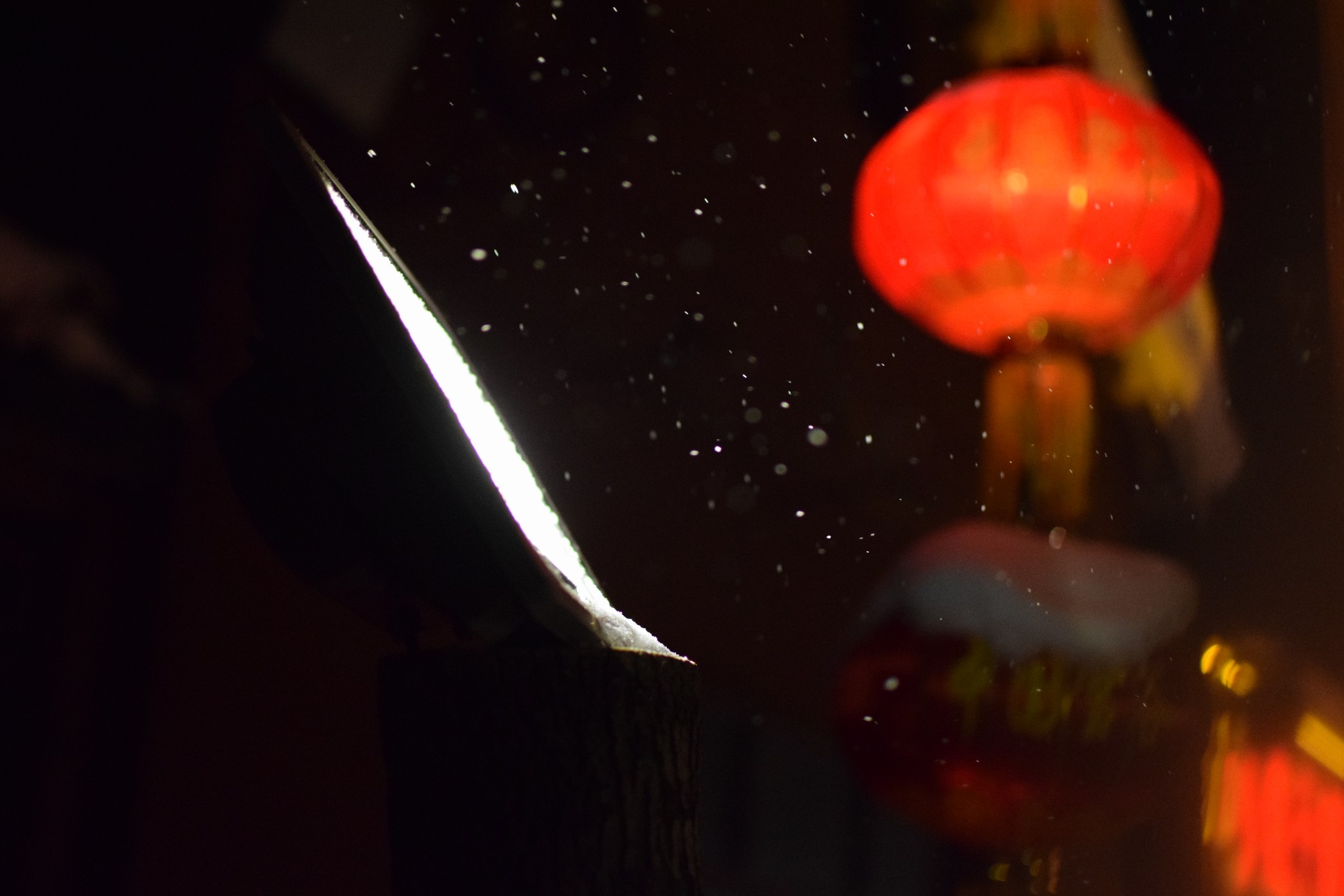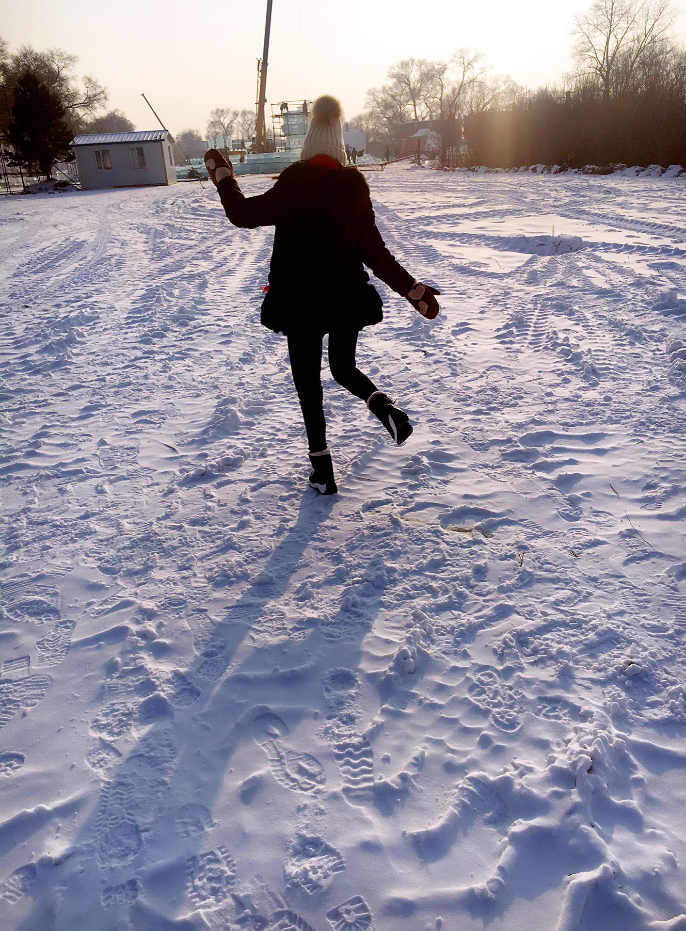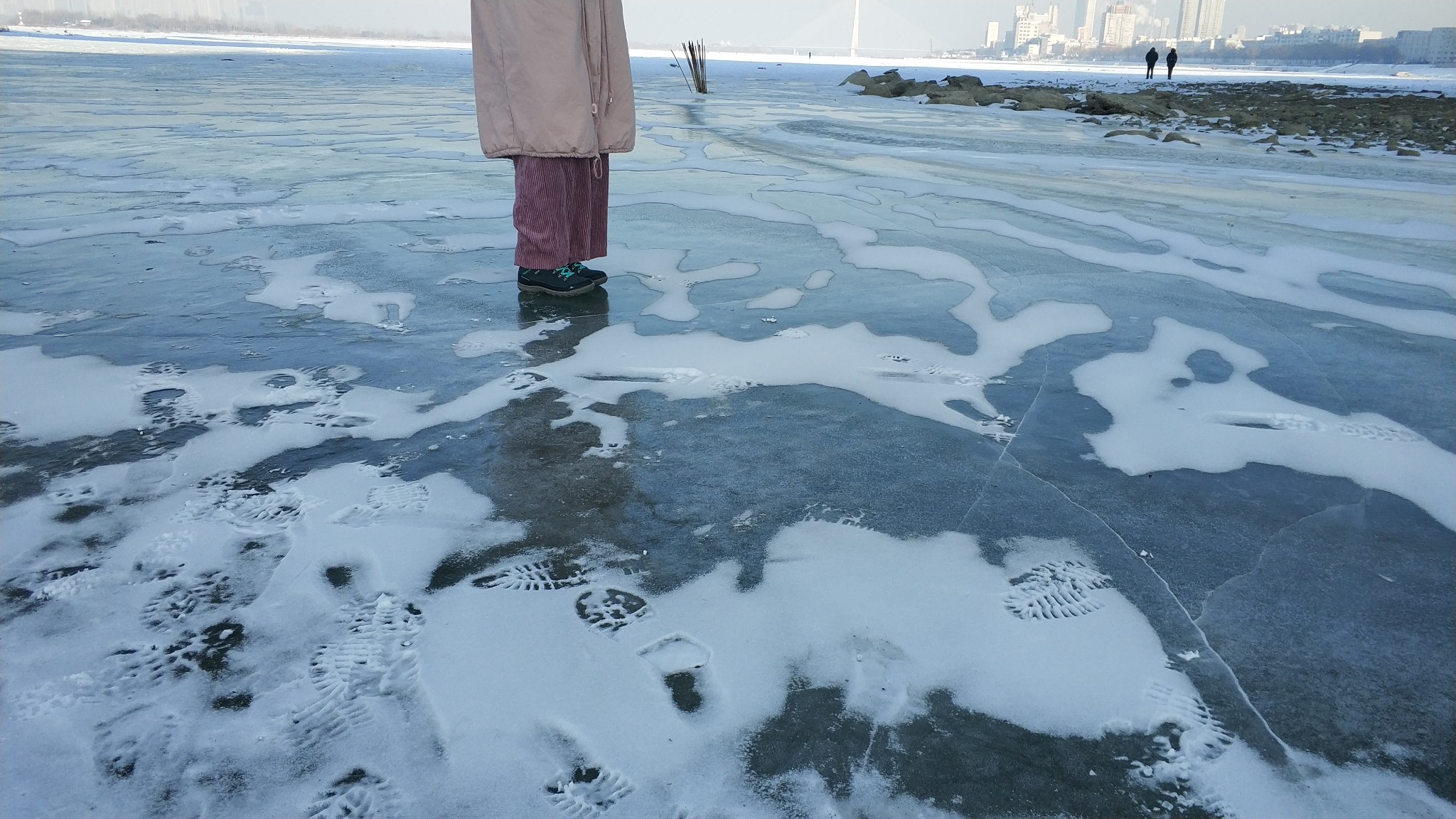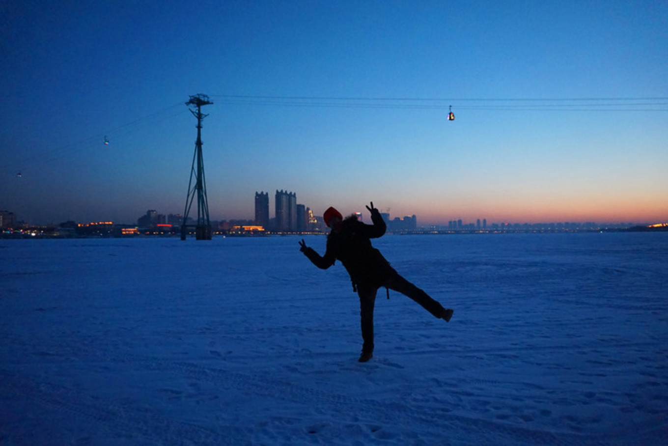 傍晚,我们来到松花江江边,江面结了厚厚的冰,车开在上面都可以安然无恙。夜幕降临,我们从松花江面穿越,到市区。这时候开始降温,手和脸都冻得生疼,但是抬头看看壮阔的江面,昏黄的灯光,一点都不觉得冷。