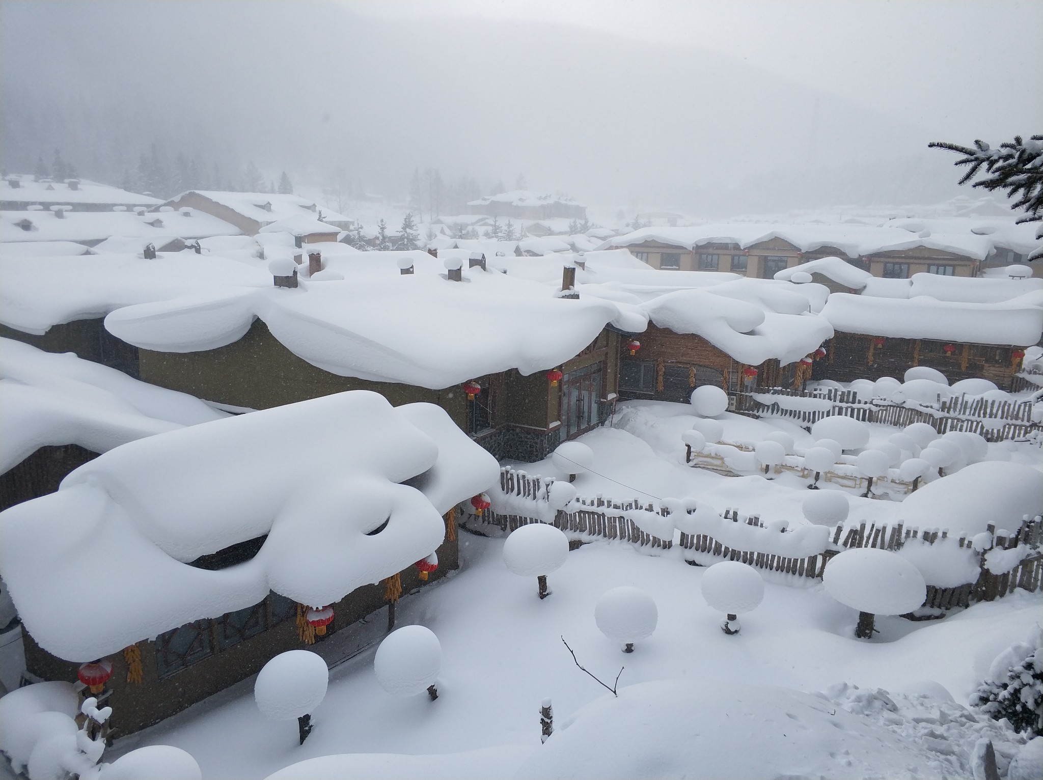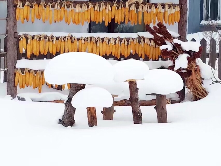 本日支出:雾凇岛 到雪谷包车150*2住宿雪谷~缘来客栈118客栈吃饭90零食补给65D3 雪地穿越~雪乡蘑菇早上起来还在下雪,而且还不小,买了一个小滑板,可以在穿越下山的路上玩,敲黑板!想去 冰雪大世界的话小滑板别扔,后面会讲!穿越从早上7点到9点都可以出发,再晚就没有行李托运的车了,老板帮我们联系的托运的人,50元一件,到 雪乡 后在固定的行李寄存点处取,可能还会再收10元/件的保管费(我怀疑是乱收费的。。。)老板开车给送到穿越入口,入口离小街很近的,如果有人跟你说要马拉犁(100元/位貌似)拉过去八成是在坑你。对了,雪谷有很多卖穿越道具的,防滑冰爪,登山杖,雪套啥的,如果你想在雪里趟雪走,雪套是可以有的;如果你鞋子不防滑,冰爪是可以有的;登山杖感觉真没啥用。小滑板买最小的那种就够了,参考价10元。在入口处买穿越门票,40元/人。一进去仿佛穿越到纳尼尔传奇里去了,好看!从来没见过这么厚的雪!兴奋!(此时依然在下雪)一开始的人行道是和马拉犁合一起的,马粪味浓醇。