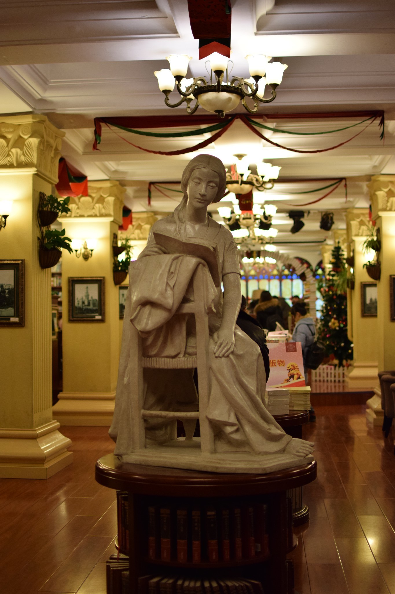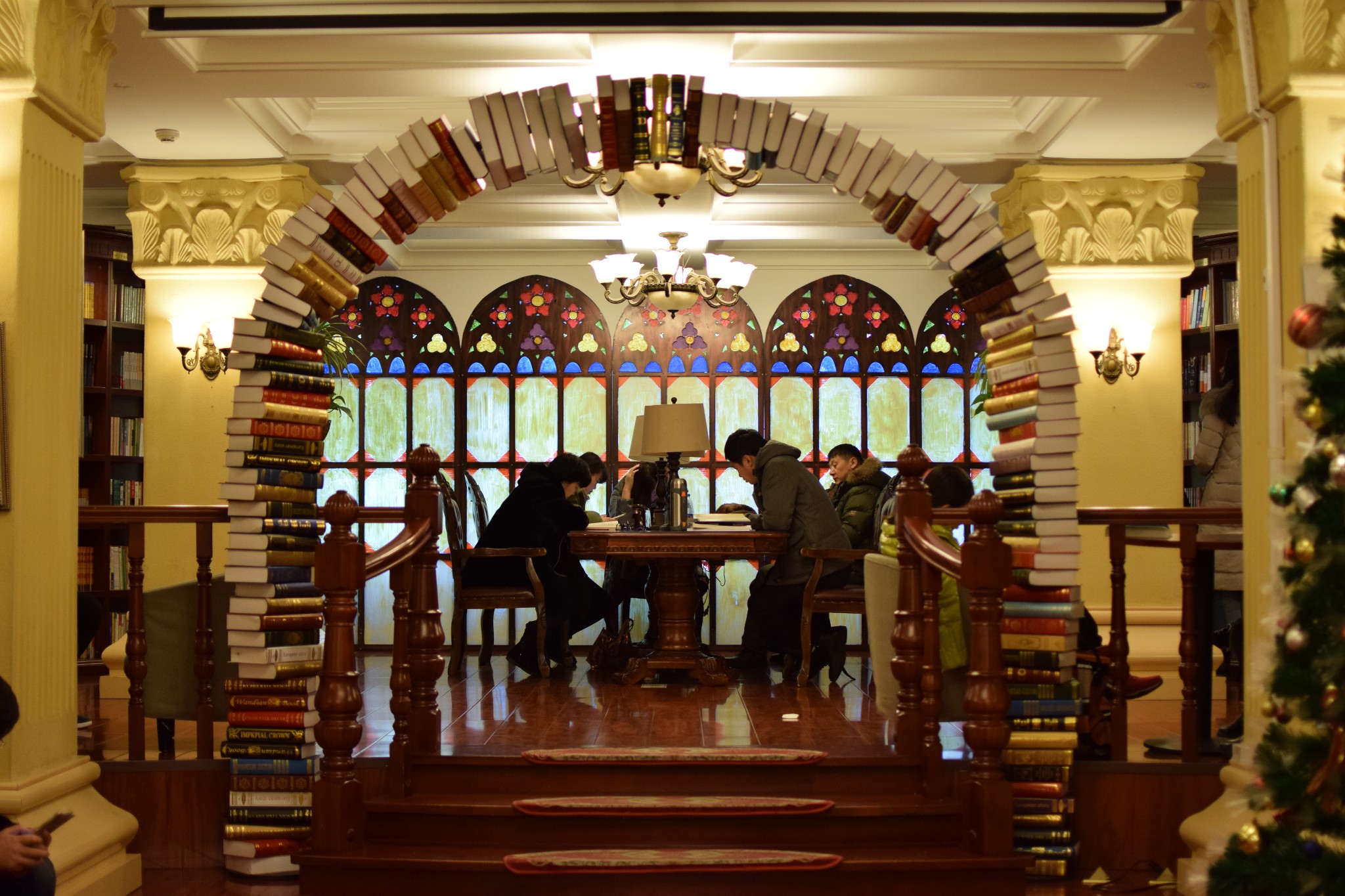 三层楼,一楼没东西,二楼是书店,三楼有个会客厅,比较小,没啥好玩的。背后的彩窗是水粉颜料糊的,意不意外,惊不惊喜。