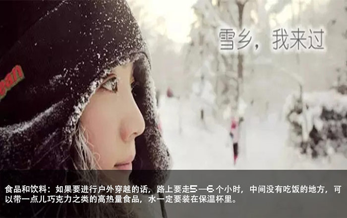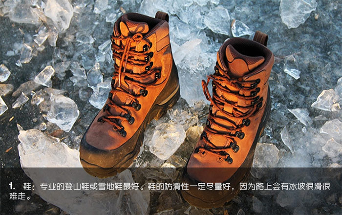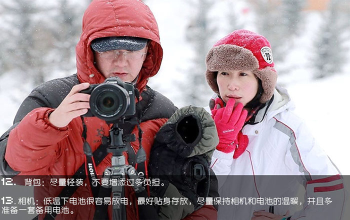 @马蜂窝用户:保䐘内衣打底,上身:羊绒毛衣,若还冷,可加一件羽绒马甲,外套加绒冲锋衣,下身加一条打底裤,外套加绒冲锋裤。冲锋衣裤可防风、防水,玩雪方便。手套必备,如果为了照相方便,可采取双层手套,里边毛线手套,外边皮手套。帽子必备,建议保暖雷峰帽,可以遮住耳朵。鞋子建议高帮防水防滑鞋,一定要防滑,袜子两层,里边一层棉袜,外边一层兔毛袜或羊毛𧙕,这样不容易因为出汗湿了后又冷。暖宝宝可带一些,主要贴在腰间,也可垫在鞋里。如果是长途坐车或徒步,建议外套方便脱、穿,车上一般有暖气,徒步会热,如果雪地徒步,一定要雪套,很多地方的雪很深。如果用单反相机,在屋外照完相,进屋前或上车前务必用塑料袋装好,放进相机包里装好,短时间内不要取出。手机在低温下会显示电量低或自动关机,照相后立即装到衣服包里保暖,如遇临时关机,可保暖后又可开机了。