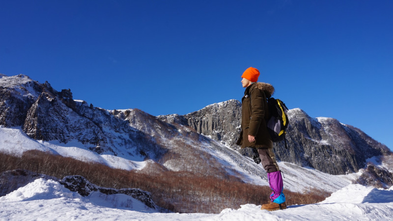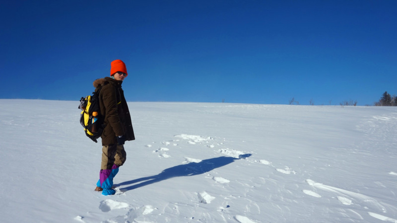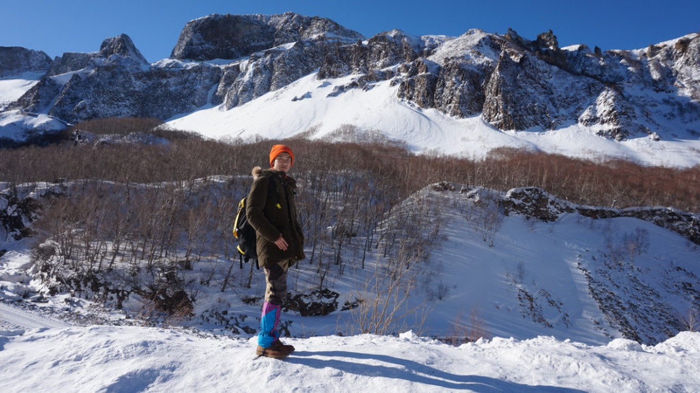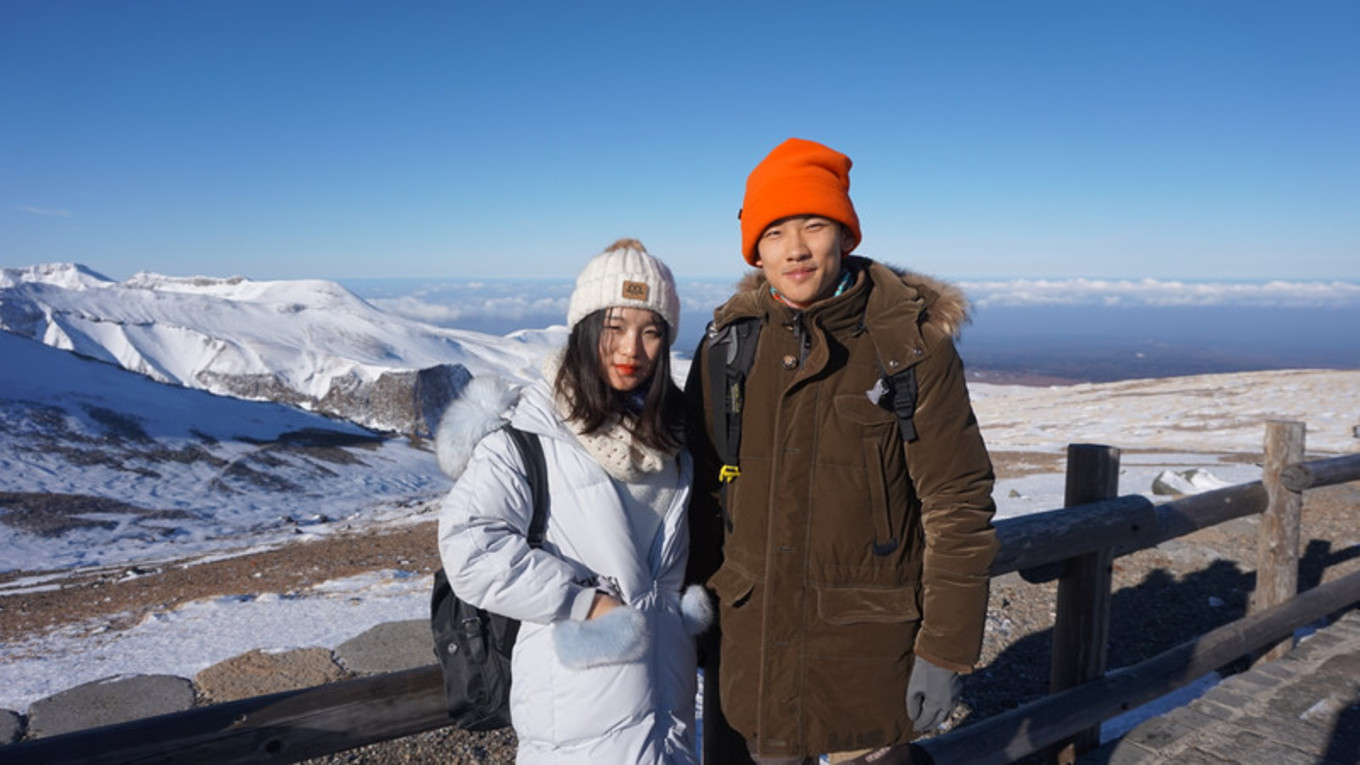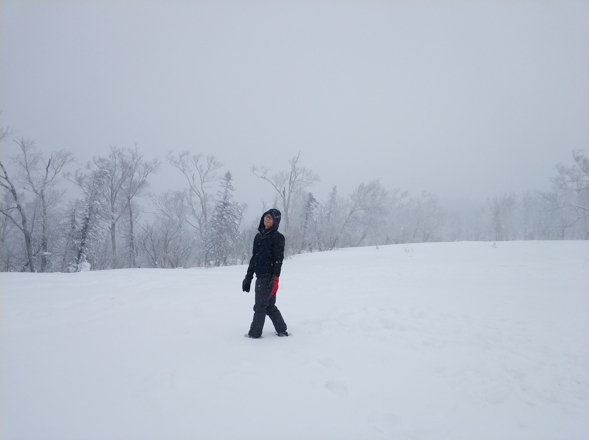 上山的路后面很抖,要手脚并用,山里又下雪又刮风。走起来热的我把外套脱了,夸一夸我的蓝色小滑板~