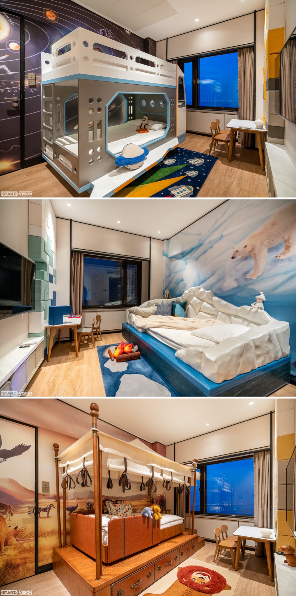 而「 香格里拉 大酒店」里最有特色的房型是主题家庭套房。六大主题包含丛林、树屋、太空、城堡、冰雪以及冬日主题。房间设计非常独具一格,无论大朋友还是小朋友都会被其设计所吸引,且不同主题的套房为主题配置的装饰品各不一样,所以要想全部体验所有主题一定要多来几次才行!