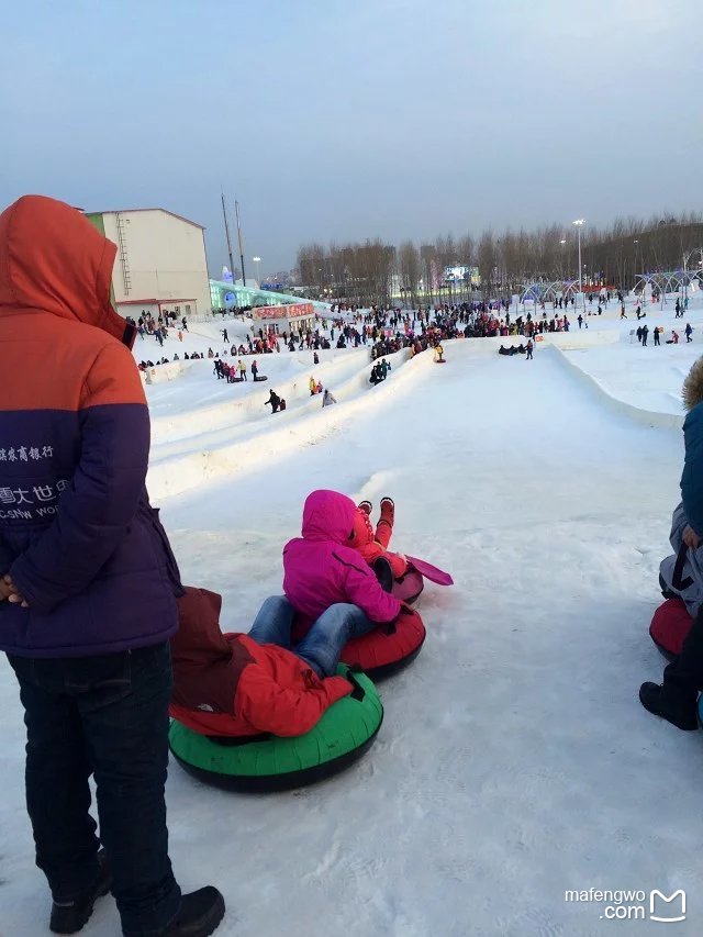 冰雪大世界当天人太多了,我们排队排了好久,有一个最喜欢玩的,6个人每人坐一个轮胎,脚搭脚从坡上滑下来,开始有点怕,但是玩了一次又玩,大人小孩都玩得很开心。下图就是我们玩的滑滑梯,很不错,其实还有一个更长滑道的,但是那个排队的人更多,我们果断放弃了。