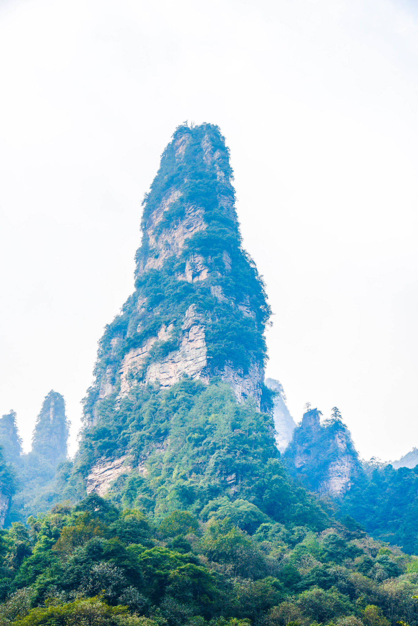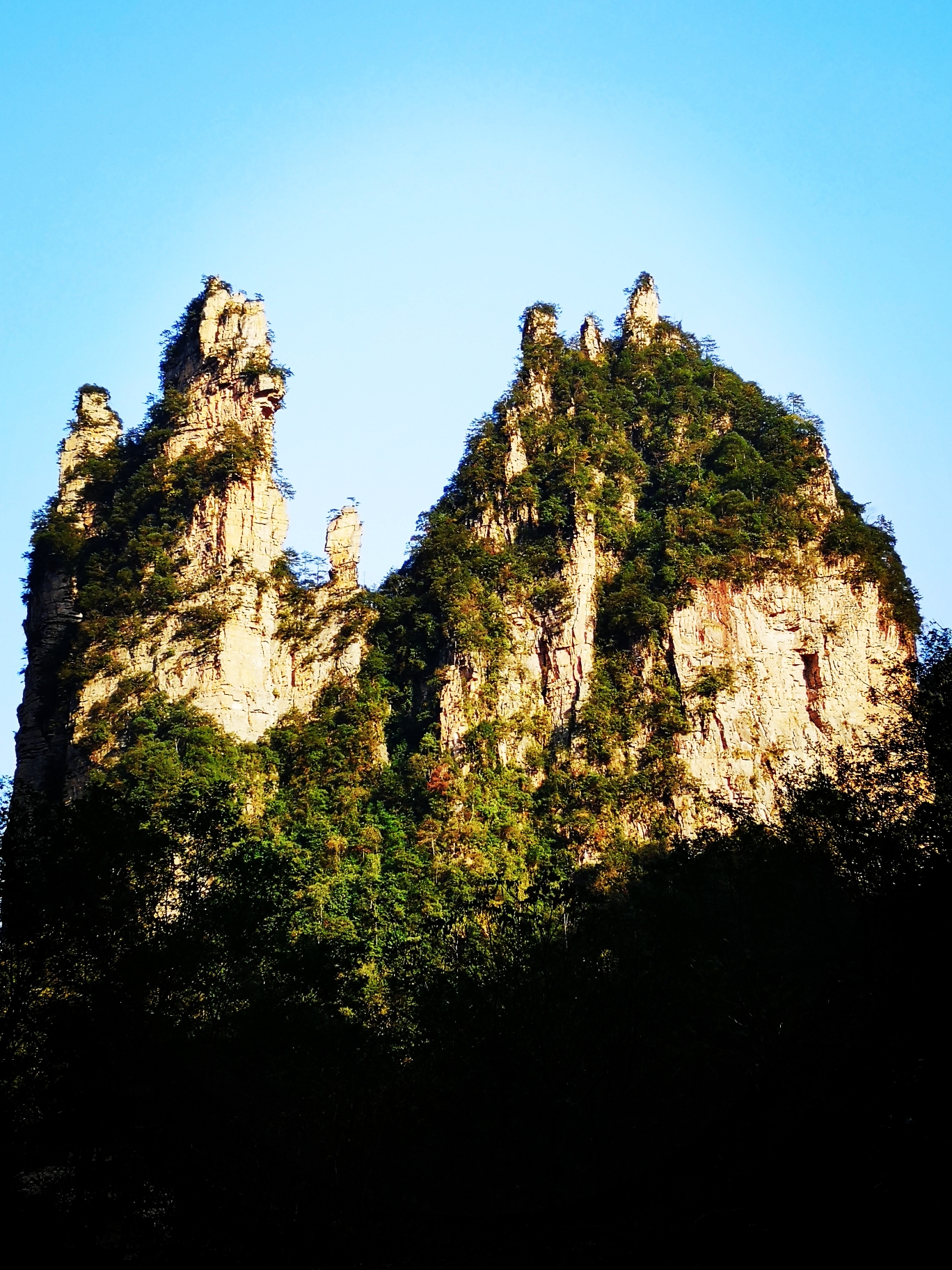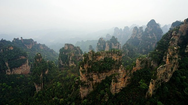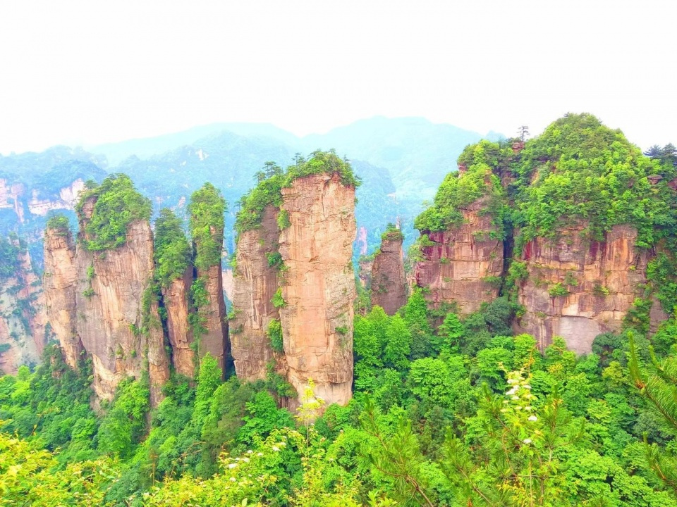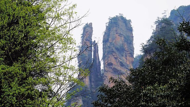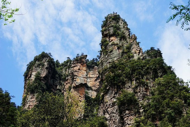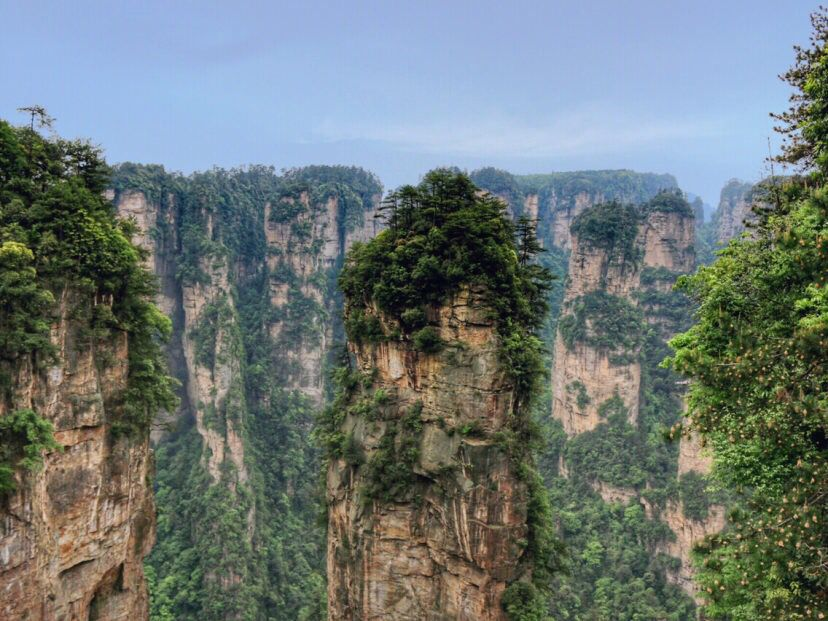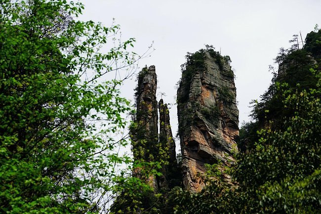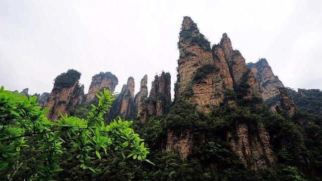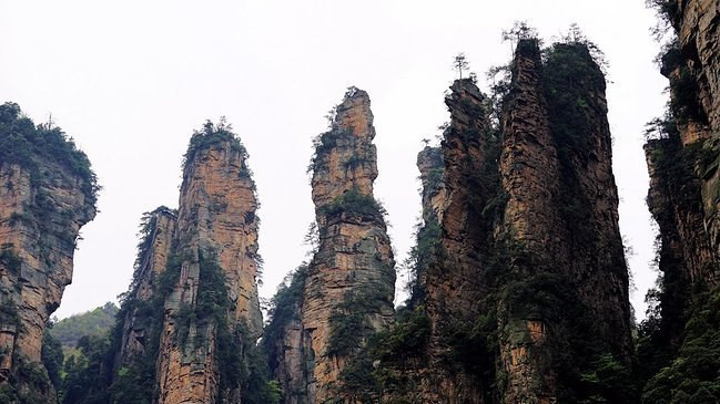 近距离下的石柱上面郁郁葱葱,陡峭异常。恐怕也只有天地之间的飞鸟才能在它们上面停留。