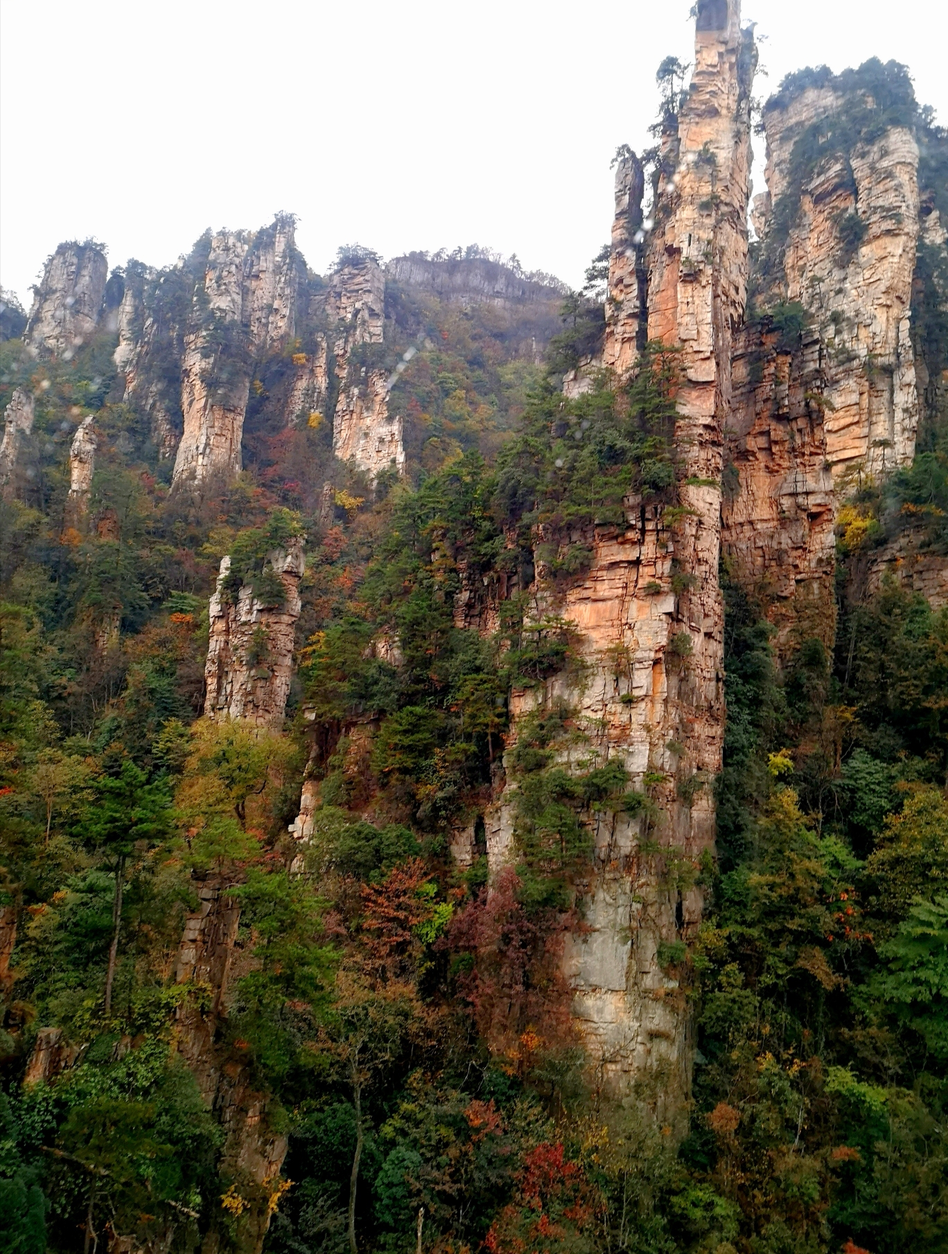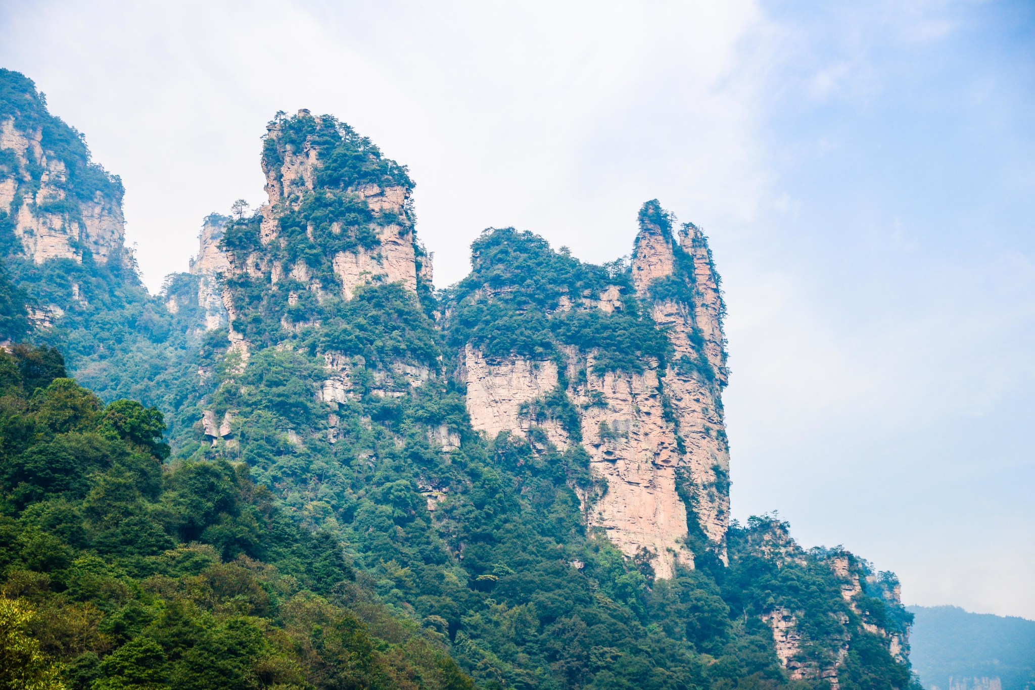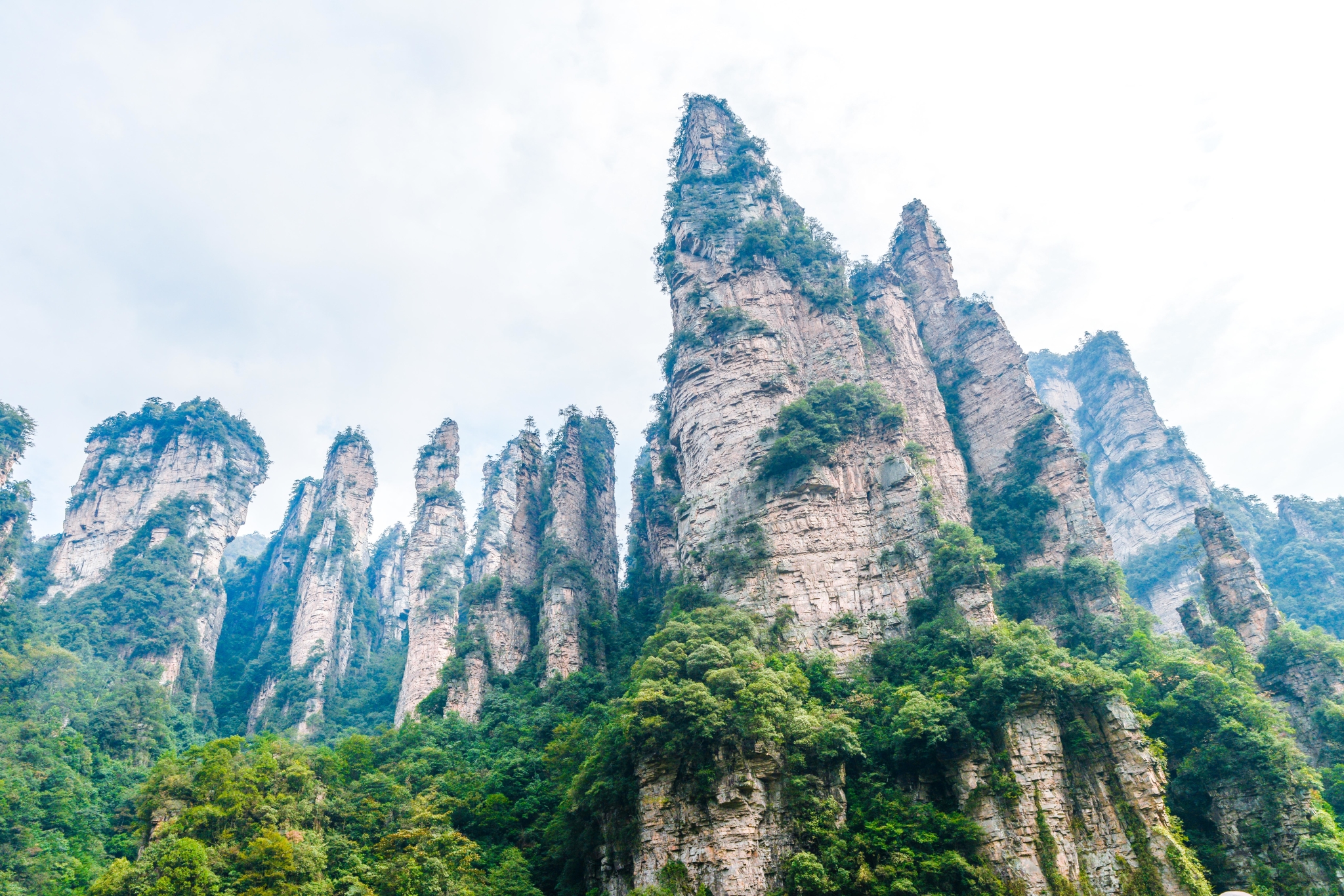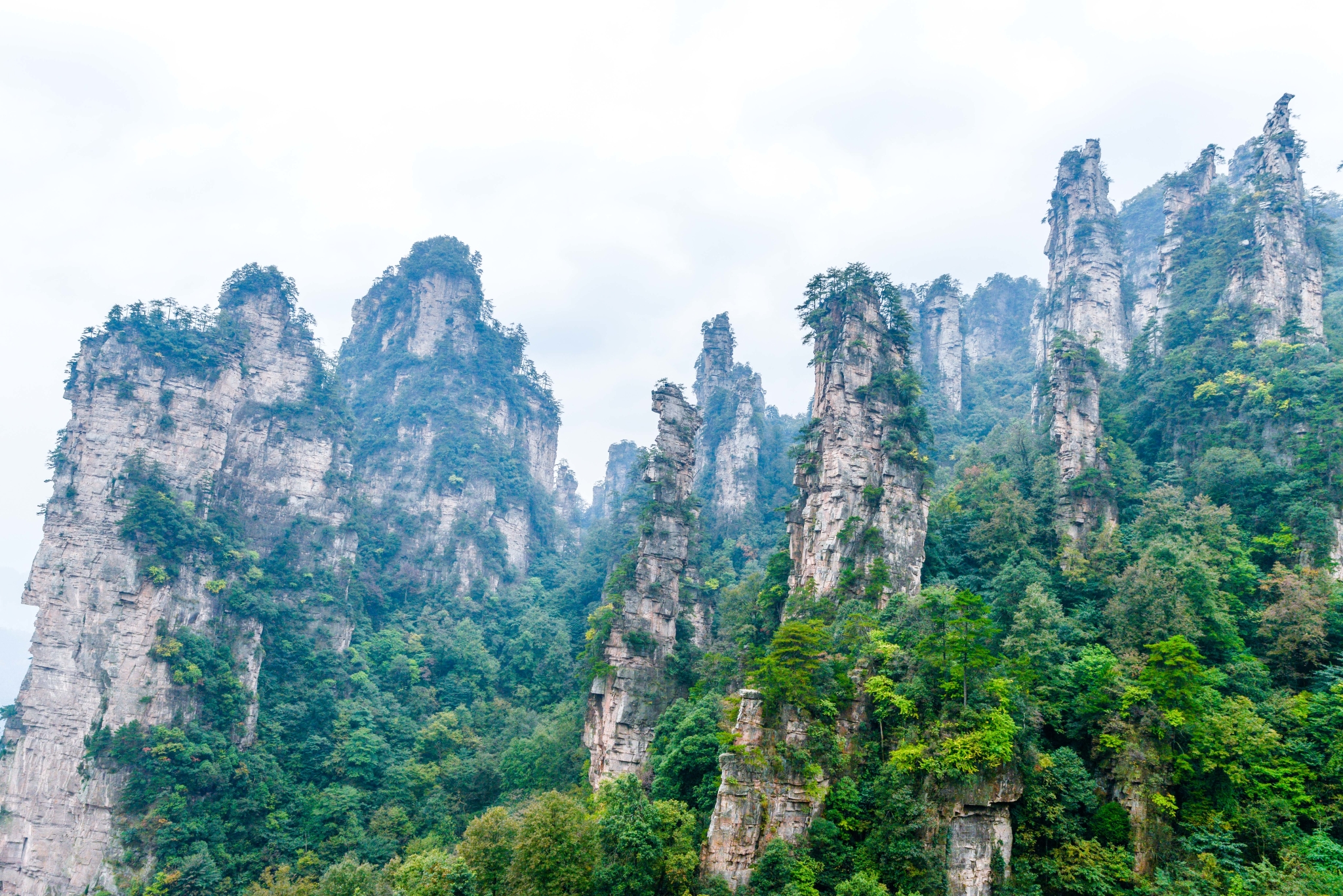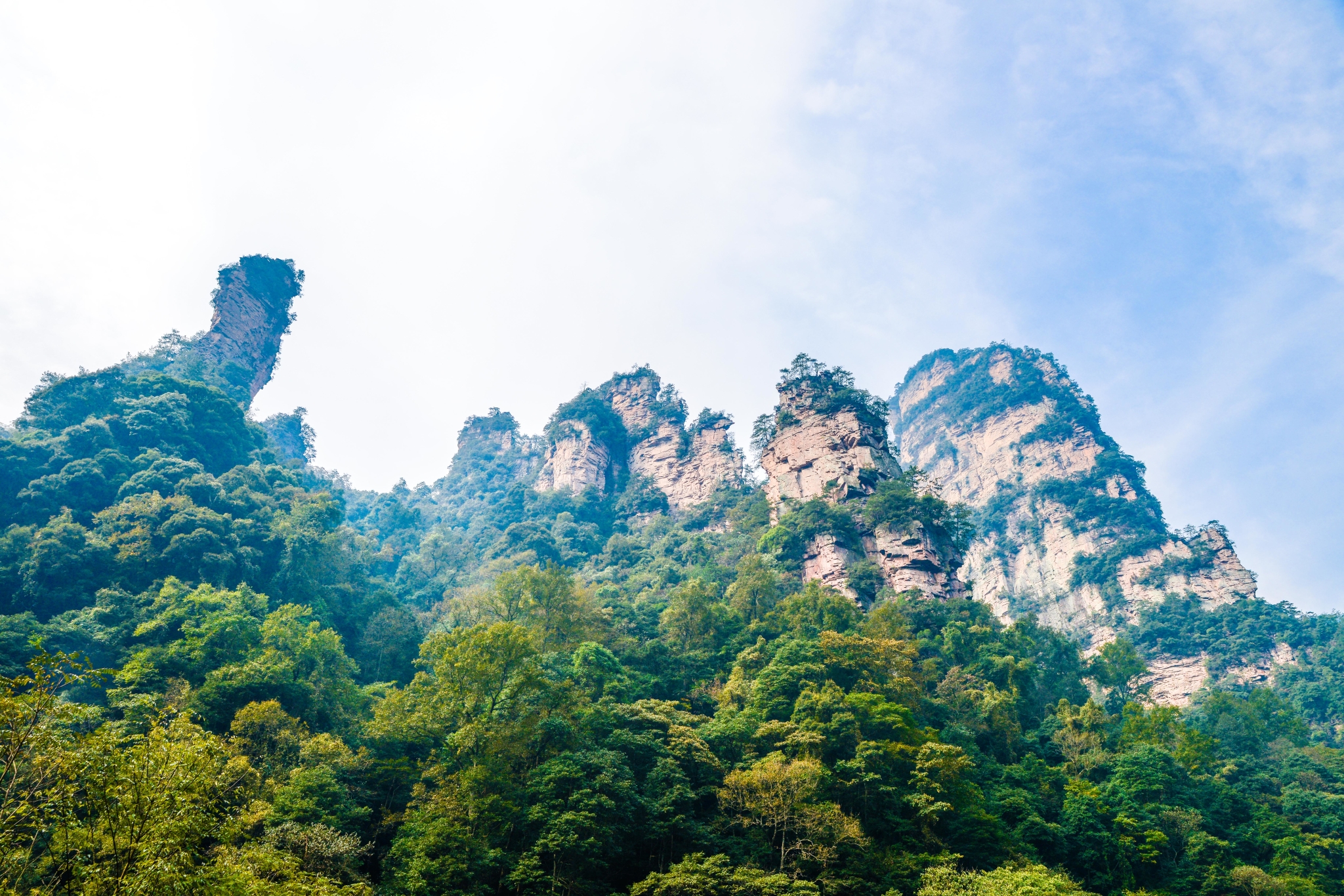 近距离下的石柱上面郁郁葱葱,陡峭异常。恐怕也只有天地之间的飞鸟才能在它们上面停留。