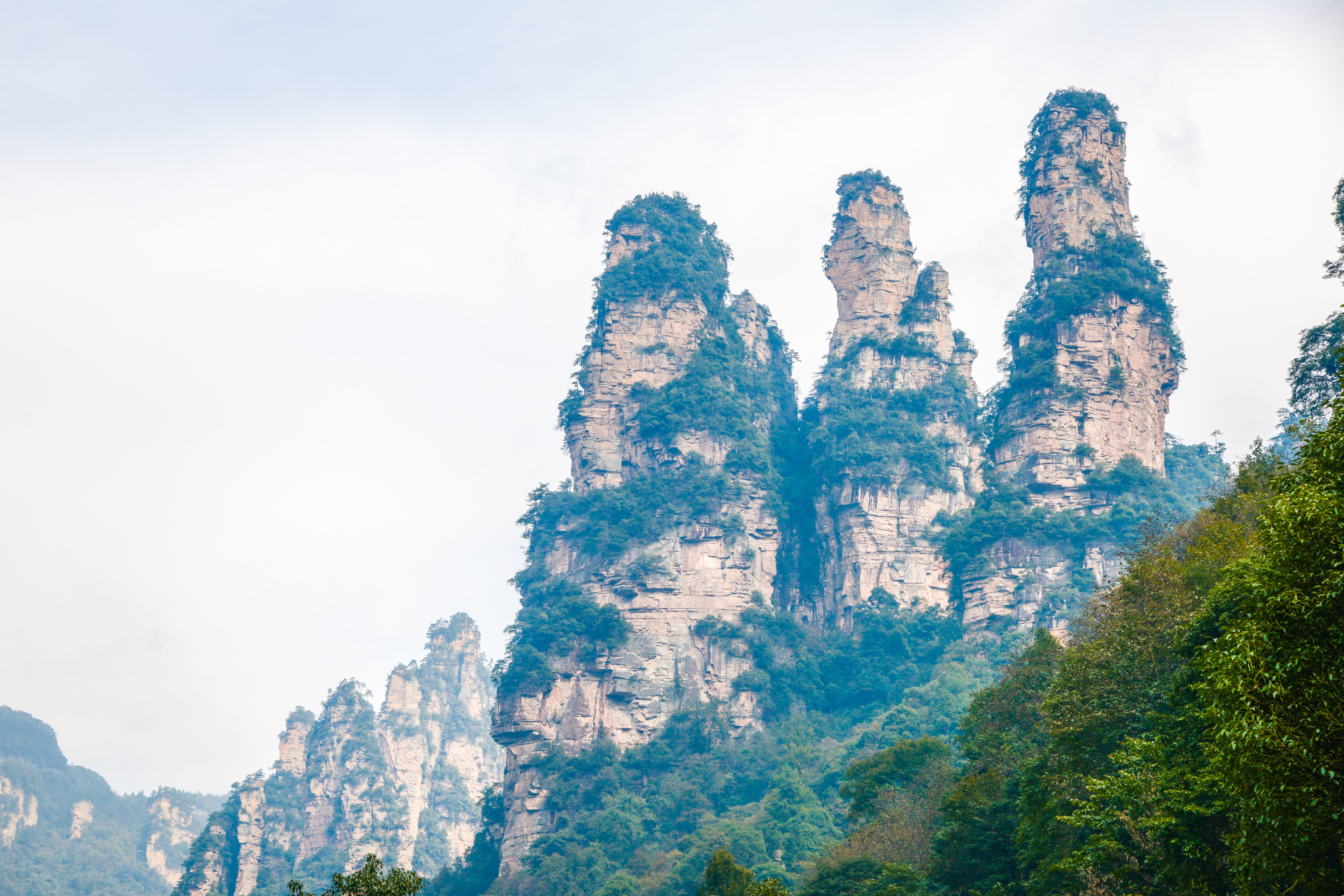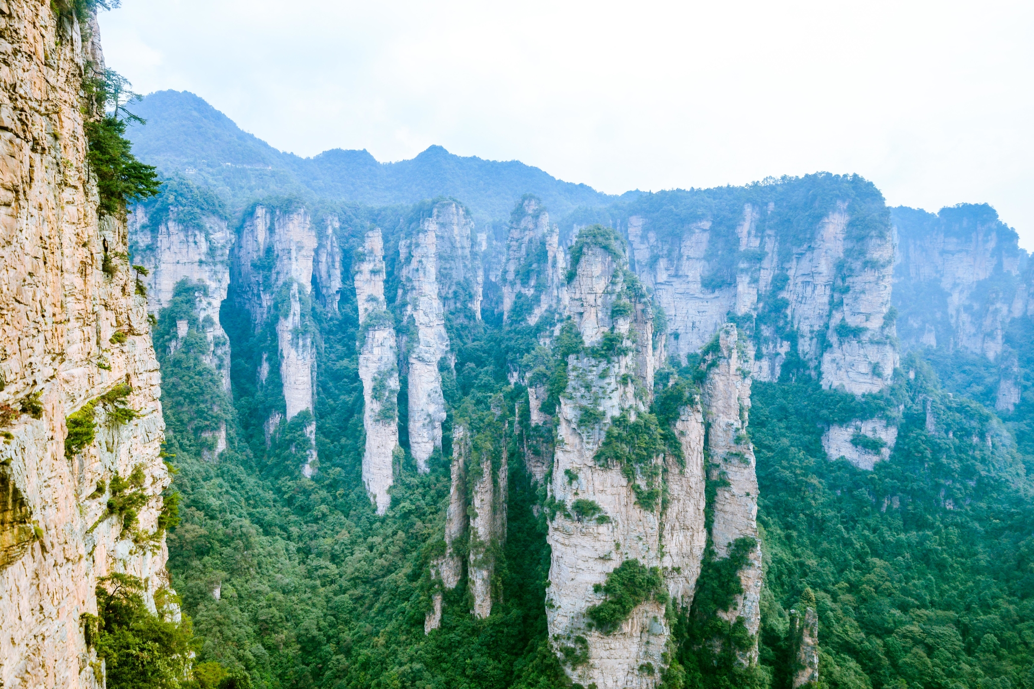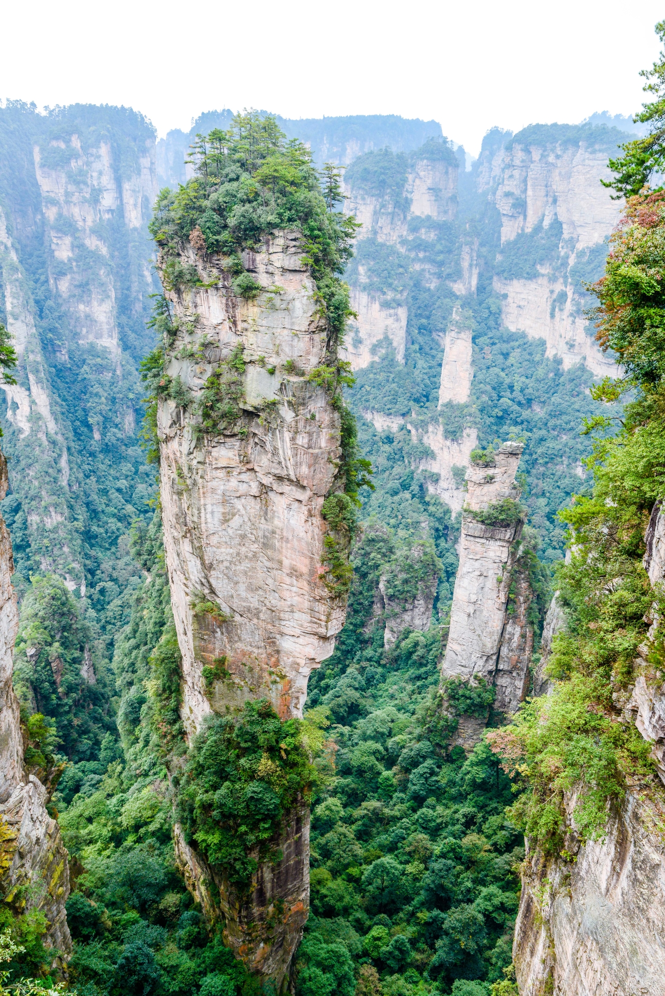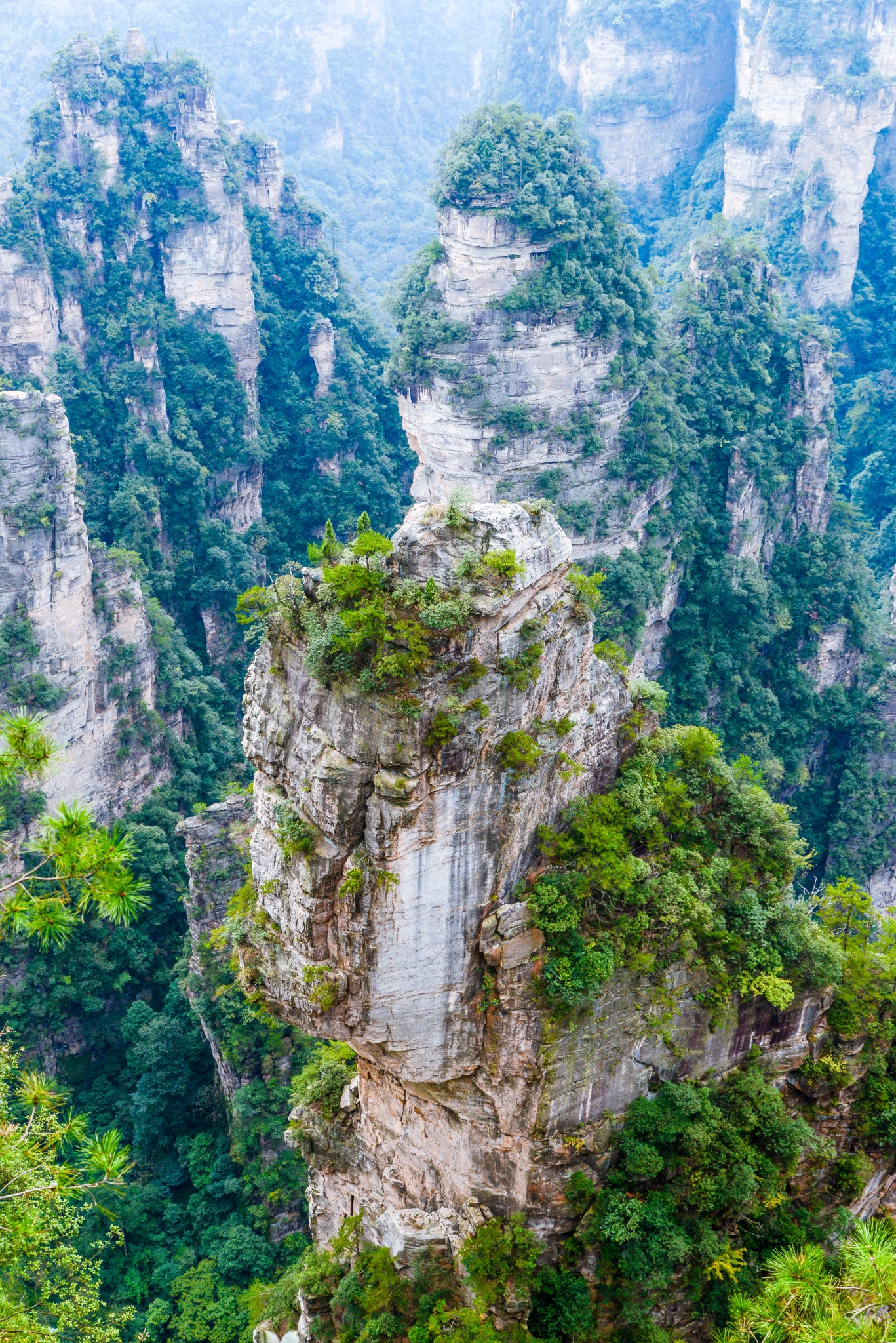 近距离下的石柱上面郁郁葱葱,陡峭异常。恐怕也只有天地之间的飞鸟才能在它们上面停留。